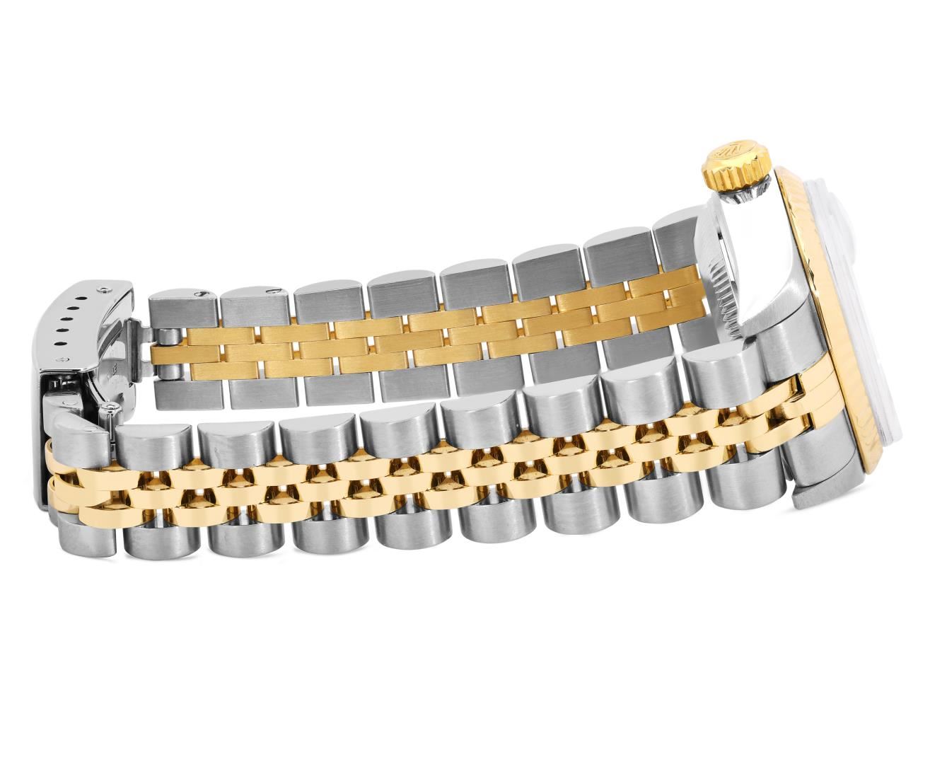 One Ladies Pre Owned Quickset Two Tone 18K Yellow Gold And Stainless Steel Sapphire Quickset Rolex Datejust Polished Bright with Satin Finish, Serviced And Electronically Tested, Rolex Stainless Steel Case: 26mm, Rolex 18K Yellow Gold Crown, Rolex Bezel: 18K Yellow Gold Fluted Bezel. Crystal: Sapphire With Magnified Date Window. Hands: Solid Hands. Rolex Movement: Automatic Winding Movement 2235. Rolex Dial: White Roman With Square Track. Date Window: 3 O'Clock Position Date Display, Model: Sapphire Quickset Datejust. Condition: G-6 Extra Fine. Rolex Bracelet: 18K Yellow Gold And Stainless Steel Jubilee Band. Bright Polish And Satin Finish. 6.0 Inch Length, Adjustable. Standard Clap, With Rolex Logo. This Watch Has Been Serviced Time Tested And Is In Excellent Condition It Is Free Of All Scratches And Dents. This Watch Comes With A Rolex Box.