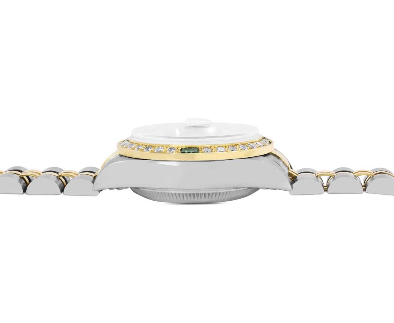 One Ladies Pre Owned Quickset Two Tone 18K Yellow Gold And Stainless Steel Rolex Datejust Polished Bright with Satin Finish, Serviced And Electronically Tested, Rolex Stainless Steel Case: 26mm, Rolex Yellow Gold Crown, Custom Bezel: New 18K Yellow Gold Diamond And Emerald Bezel, Stone Count: 28 Diamonds + 4 Emeralds On Bezel. Crystal: Sapphire With Magnified Date Window. Custom Hands: New Solid Hands. Rolex Movement: Automatic Winding Movement 2235. Rolex Dial: White with Roman Hour Markers and Square Track. Date Window: 3 O'Clock Position Date Display, Model: Quickset Datejust. Condition: G-6 Extra Fine. Rolex Bracelet: 18K Yellow Gold And Stainless Steel Jubilee Band. Bright Polish And Satin Finish. 6.0 Inch Length, Adjustable. Standard Clap, With Rolex Logo. This Watch Has Been Serviced Time Tested And Is In Excellent Condition It Is Free Of All Scratches And Dents. This Watch Comes With A Rolex Box.