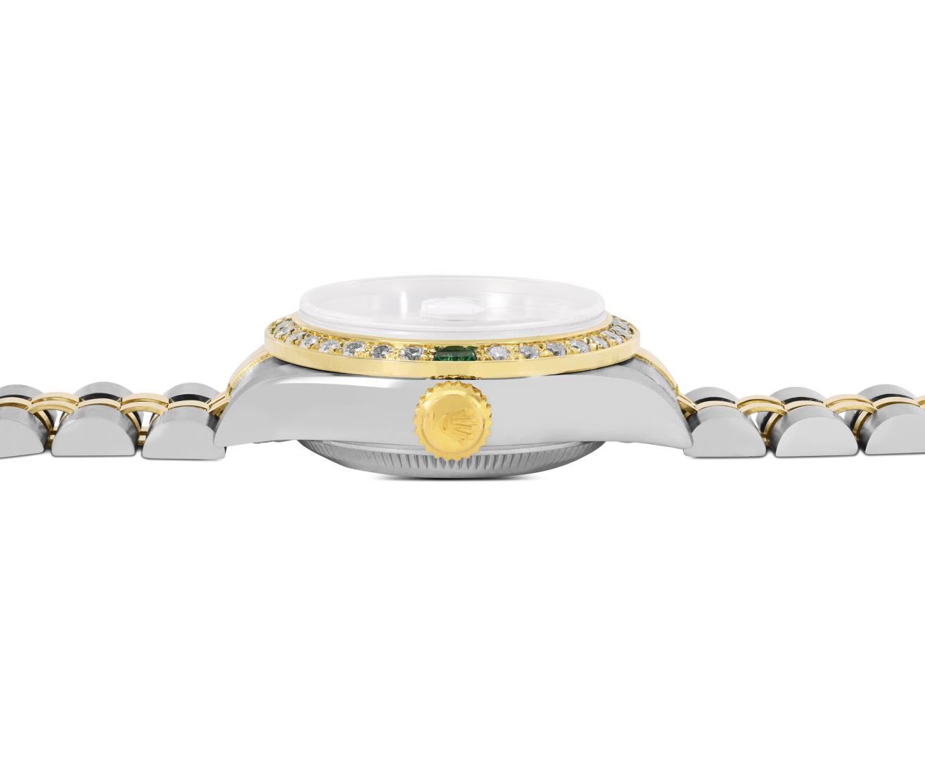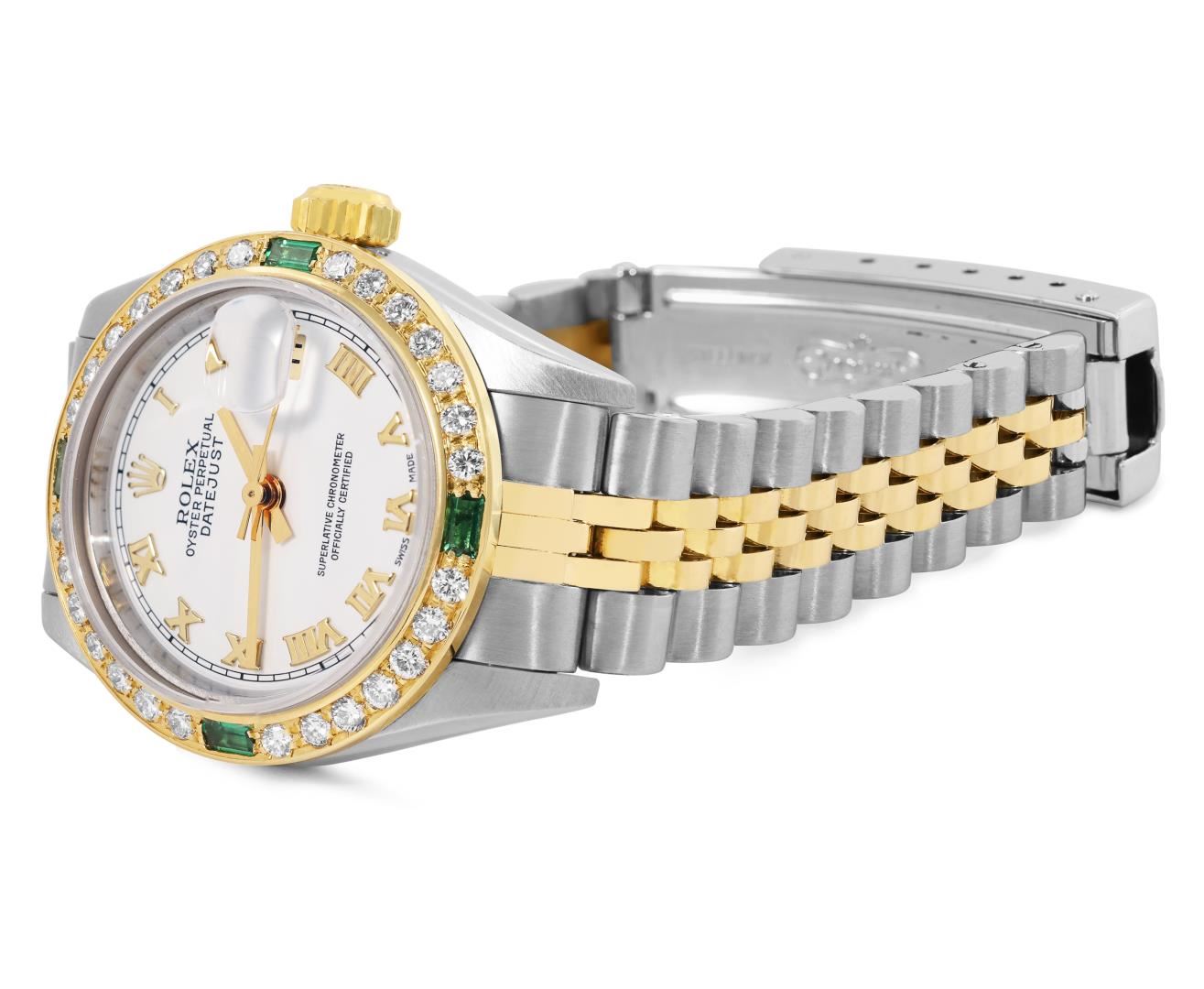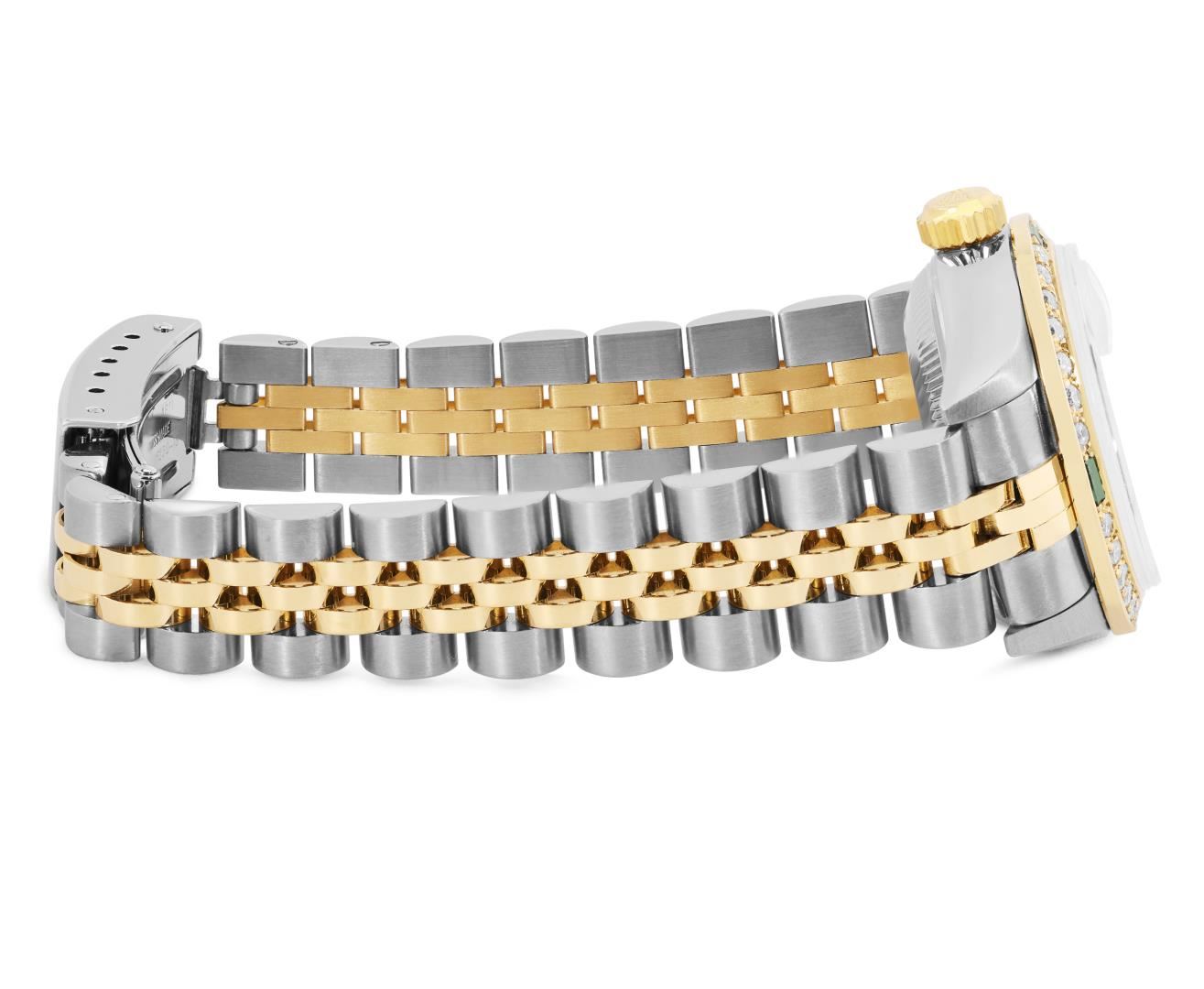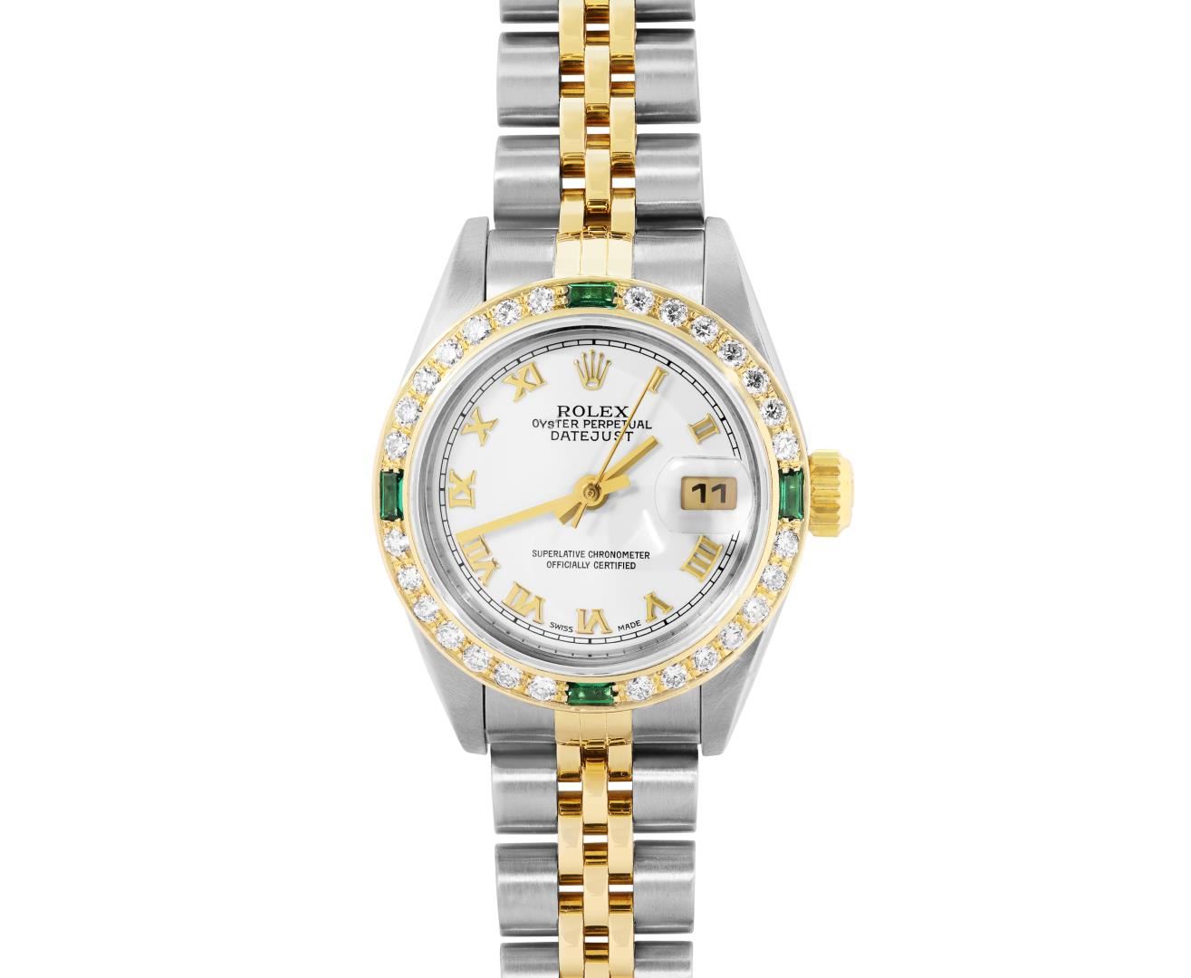 One Ladies Pre Owned Quickset Two Tone 18K Yellow Gold And Stainless Steel Rolex Datejust Polished Bright with Satin Finish, Serviced And Electronically Tested, Rolex Stainless Steel Case: 26mm, Rolex Yellow Gold Crown, Custom Bezel: New 18K Yellow Gold Diamond And Emerald Bezel, Stone Count: 28 Diamonds + 4 Emeralds On Bezel. Crystal: Sapphire With Magnified Date Window. Custom Hands: New Solid Hands. Rolex Movement: Automatic Winding Movement 2235. Rolex Dial: White with Roman Hour Markers and Square Track. Date Window: 3 O'Clock Position Date Display, Model: Quickset Datejust. Condition: G-6 Extra Fine. Rolex Bracelet: 18K Yellow Gold And Stainless Steel Jubilee Band. Bright Polish And Satin Finish. 6.0 Inch Length, Adjustable. Standard Clap, With Rolex Logo. This Watch Has Been Serviced Time Tested And Is In Excellent Condition It Is Free Of All Scratches And Dents. This Watch Comes With A Rolex Box.