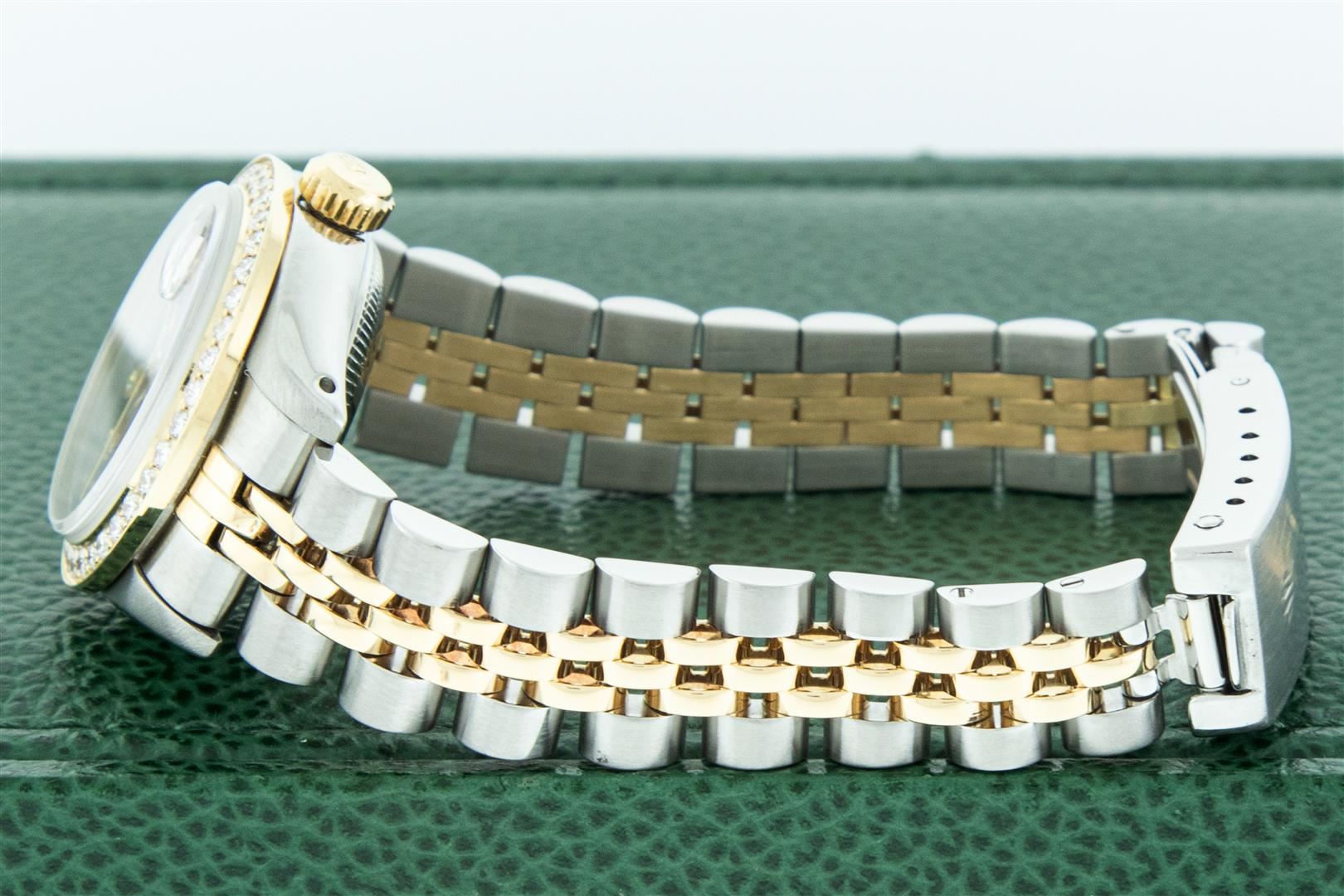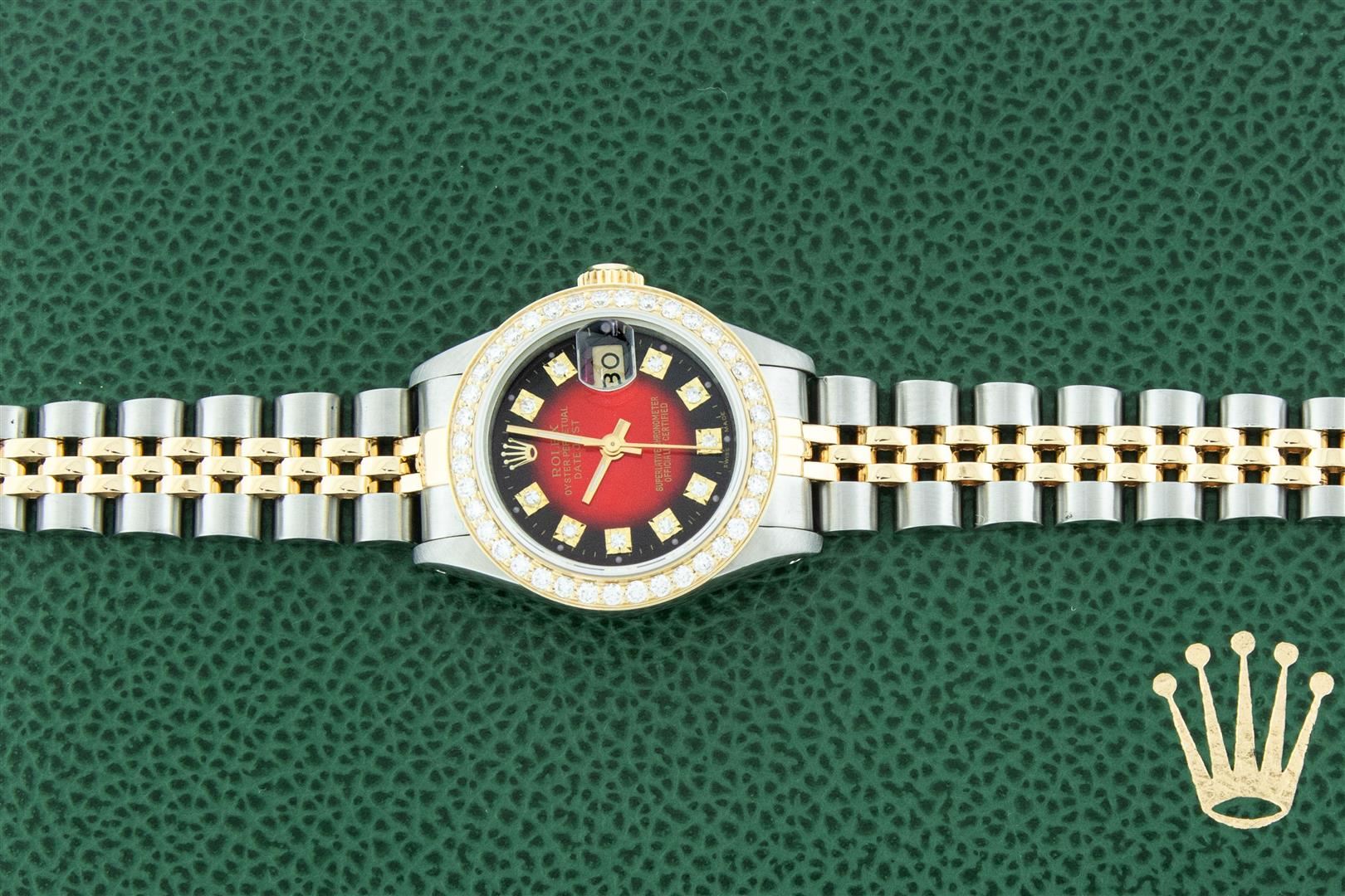 One Ladies Two Tone Rolex Datejust Polished, Serviced & Electronically Tested, Yellow Gold & Stainless Steel Case: 26mm, Rolex Yellow Gold Crown, Custom Bezel: New 18K 1ctw Yellow Gold Beadset Diamond Bezel, Diamond Count: 42 Diamonds, Total Weight 1.00 Carat, Clarity: SI-VS, Color: G to H. Custom Crystal: New Sapphire With Magnified Date Window. Custom Hands: New Luminescent Hands. Rolex Movement: Automatic Winding Movement. Custom Dial: Refinished To Red With Custom Added Diamond Hour Markers, Diamond Count: 10 Single Cut Diamonds in Dial, G To H In Color, VS Clarity. Date Window: 3 O'clock Position Date Display, Model: Datejust, Condition: G-6 Extra Fine. Rolex Bracelet: Two Tone Yellow Gold & Stainless Steel Jubilee Band. Bright Polish. 6.0 Inch Length, Adjustable. Standard Clasp, With Rolex Logo. This Pre Owned Watch Has Been Serviced Time Tested And Is In Excellent Condition It Is Free Of All Scratches And Dents. This Watch Comes With A Rolex Box.