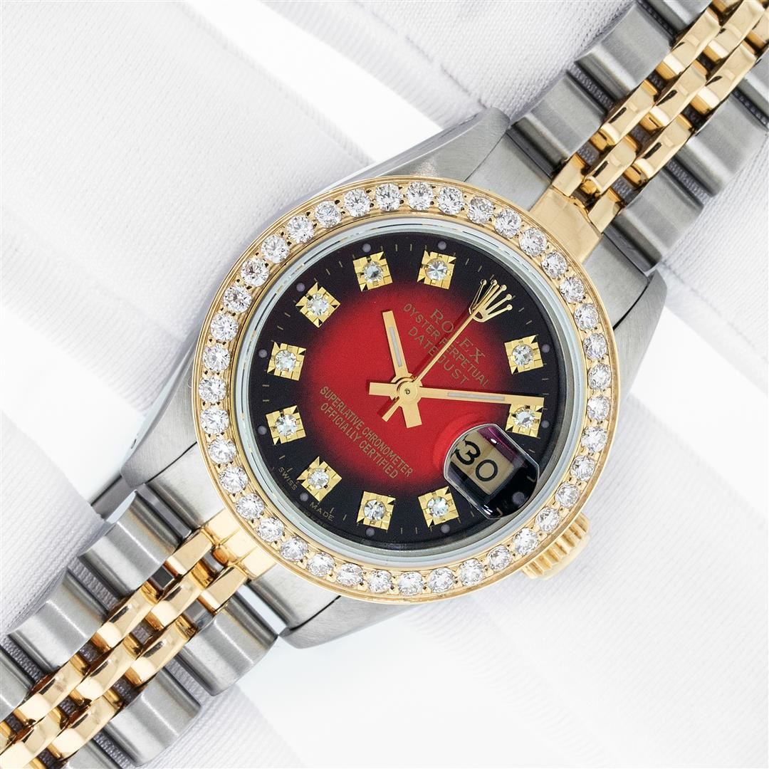 One Ladies Two Tone Rolex Datejust Polished, Serviced & Electronically Tested, Yellow Gold & Stainless Steel Case: 26mm, Rolex Yellow Gold Crown, Custom Bezel: New 18K 1ctw Yellow Gold Beadset Diamond Bezel, Diamond Count: 42 Diamonds, Total Weight 1.00 Carat, Clarity: SI-VS, Color: G to H. Custom Crystal: New Sapphire With Magnified Date Window. Custom Hands: New Luminescent Hands. Rolex Movement: Automatic Winding Movement. Custom Dial: Refinished To Red With Custom Added Diamond Hour Markers, Diamond Count: 10 Single Cut Diamonds in Dial, G To H In Color, VS Clarity. Date Window: 3 O'clock Position Date Display, Model: Datejust, Condition: G-6 Extra Fine. Rolex Bracelet: Two Tone Yellow Gold & Stainless Steel Jubilee Band. Bright Polish. 6.0 Inch Length, Adjustable. Standard Clasp, With Rolex Logo. This Pre Owned Watch Has Been Serviced Time Tested And Is In Excellent Condition It Is Free Of All Scratches And Dents. This Watch Comes With A Rolex Box.