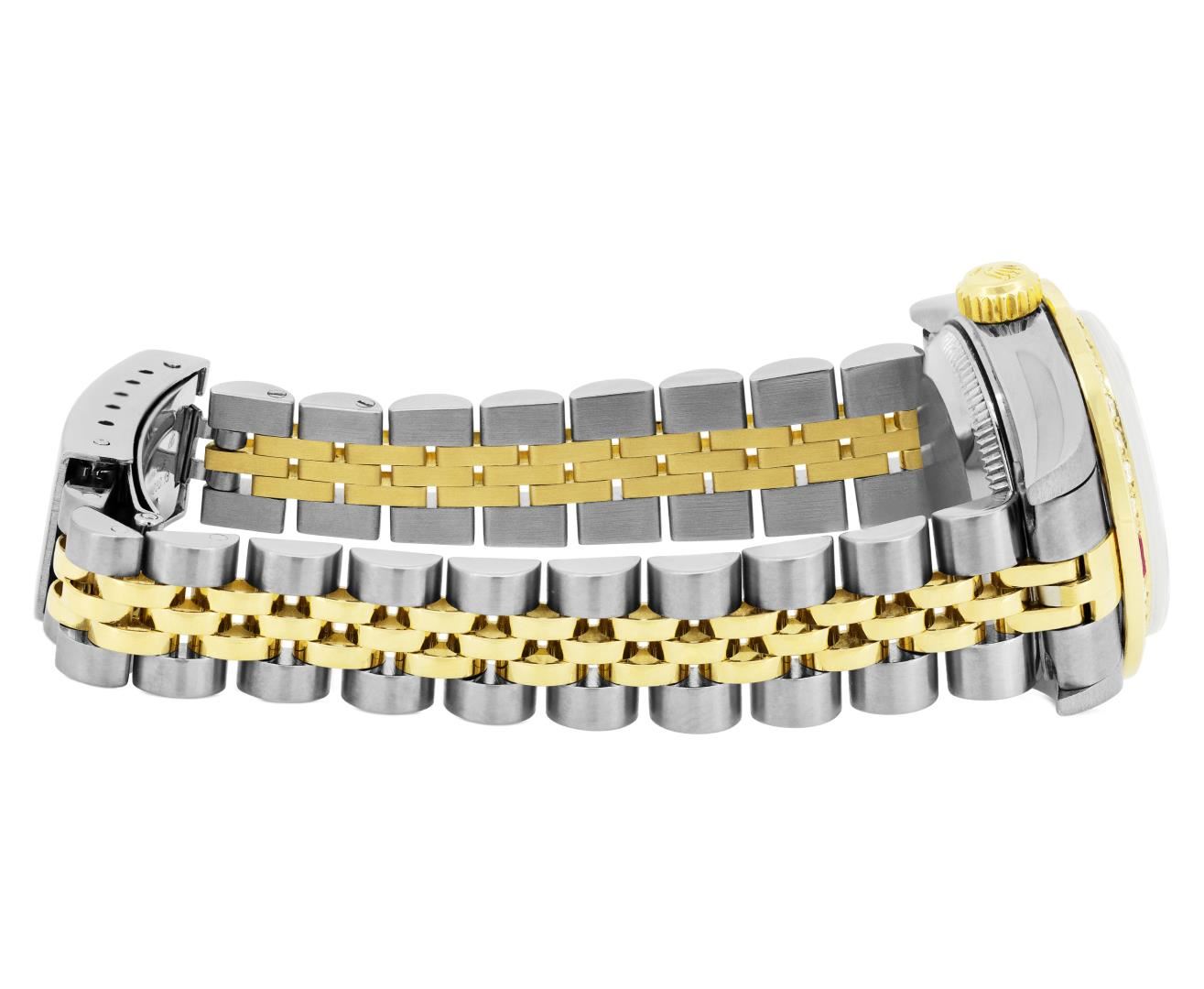 One Rolex Ladies Pre Owned Two Tone 18K Yellow Gold & Stainless Steel Rolex Datejust Polished, Serviced & Electronically Tested, Rolex Yellow Gold & Stainless Steel Case: 26mm, Rolex Yellow Gold Crown, Custom Bezel: New 18K Yellow Gold Ruby Beadset Diamond Bezel, Diamond + Gem Count: 36 Diamonds + 4 Rubies, Clarity: SI-VS, Color: G to H. Custom Crystal: New Sapphire With Magnifying Date Window. Hands: Luminescent Hands. Rolex Movement: 2235 Automatic Winding Quickset Movement. Rolex Factory Dial: Champagne Dial With Index Hour Markers, Dash Track, and Lumi Dots. Date Window: 3 O'Clock Position Date Display, Condition: G-6 Extra Fine. Rolex Bracelet: Two Tone 18K Yellow Gold & Stainless Steel Jubilee Band. Bright Polish & Satin Finish. 6.0 Inch Length, Adjustable. Fold Clasp, With Rolex Logo. This Watch Has Been Serviced And Time Tested. It Is In Excellent Condition, Free Of All Scratches And Dents. This Watch Comes With A Rolex Box.
