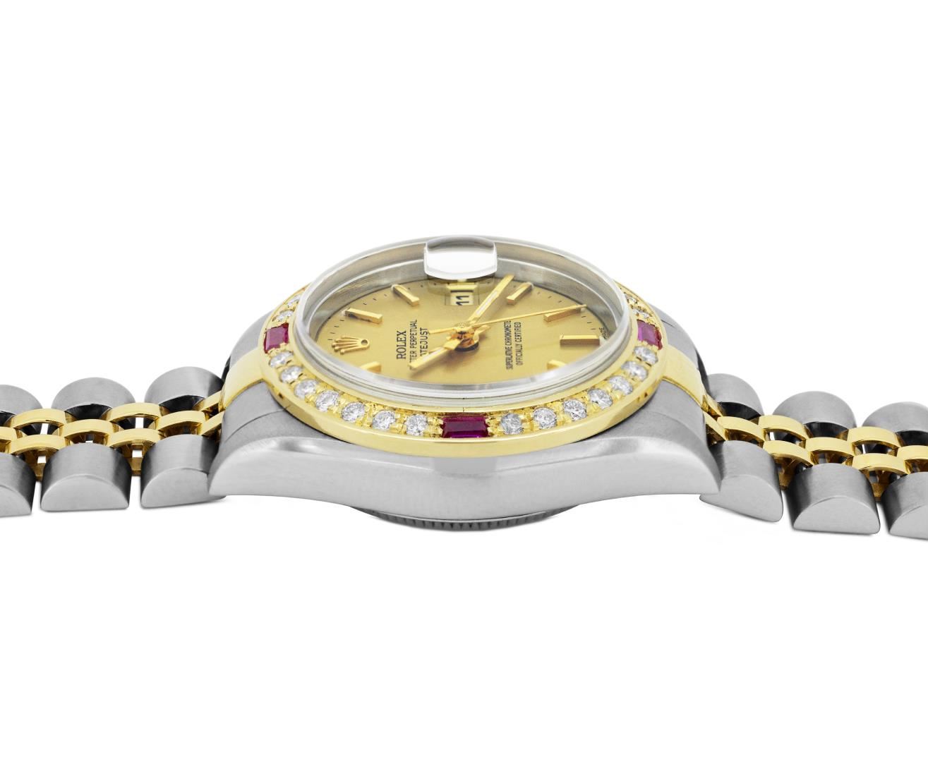 One Rolex Ladies Pre Owned Two Tone 18K Yellow Gold & Stainless Steel Rolex Datejust Polished, Serviced & Electronically Tested, Rolex Yellow Gold & Stainless Steel Case: 26mm, Rolex Yellow Gold Crown, Custom Bezel: New 18K Yellow Gold Ruby Beadset Diamond Bezel, Diamond + Gem Count: 36 Diamonds + 4 Rubies, Clarity: SI-VS, Color: G to H. Custom Crystal: New Sapphire With Magnifying Date Window. Hands: Luminescent Hands. Rolex Movement: 2235 Automatic Winding Quickset Movement. Rolex Factory Dial: Champagne Dial With Index Hour Markers, Dash Track, and Lumi Dots. Date Window: 3 O'Clock Position Date Display, Condition: G-6 Extra Fine. Rolex Bracelet: Two Tone 18K Yellow Gold & Stainless Steel Jubilee Band. Bright Polish & Satin Finish. 6.0 Inch Length, Adjustable. Fold Clasp, With Rolex Logo. This Watch Has Been Serviced And Time Tested. It Is In Excellent Condition, Free Of All Scratches And Dents. This Watch Comes With A Rolex Box.