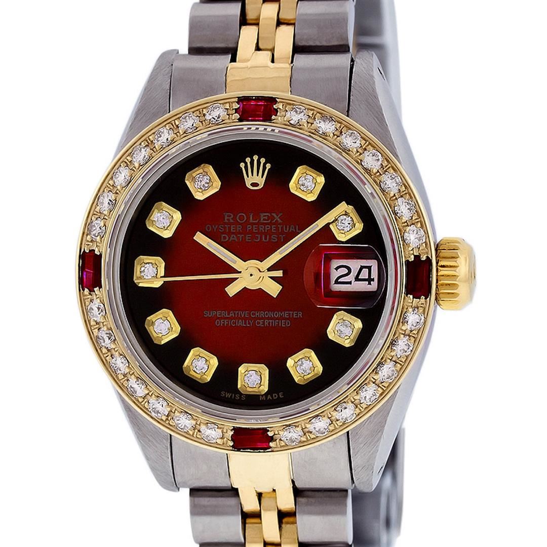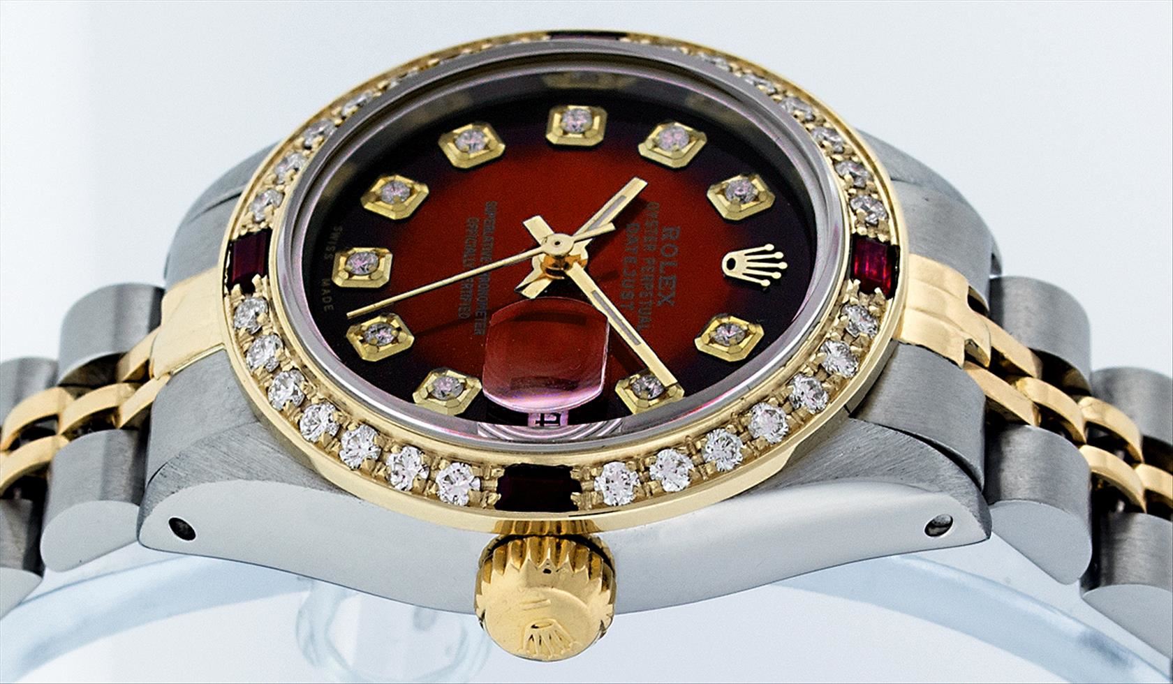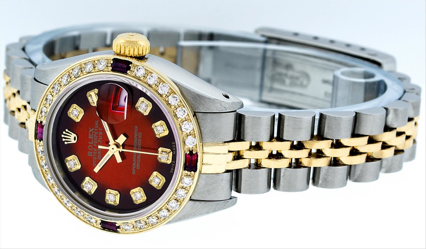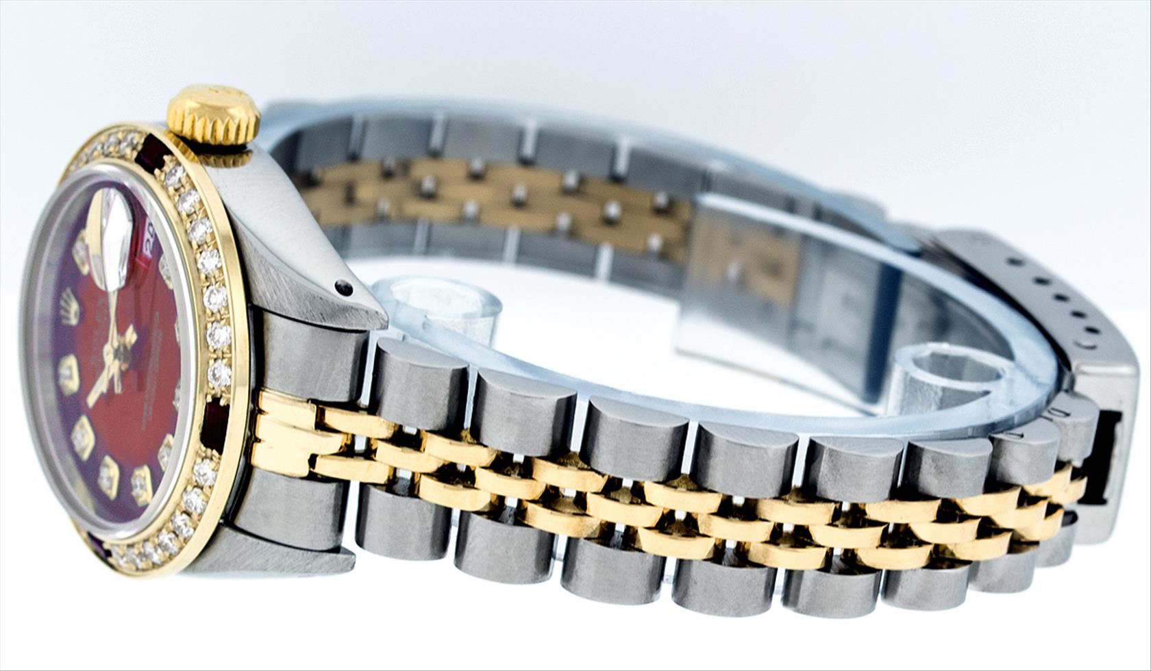One Ladies Two Tone Rolex Datejust Polished, Serviced & Electronically Tested, 14K Yellow Gold & Stainless Steel Case:26mm, 14K Yellow Gold Crown, Custom Bezel: 18K Yellow Gold Ruby Beadset Diamond Bezel, Diamond Count: 28 Diamonds + 4 Rubies. Total Weigh