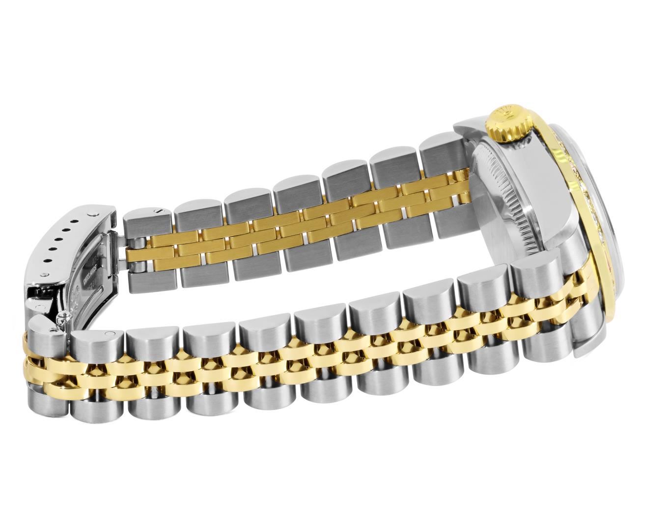 Rolex Ladies Pre Owned Quickset 18K Yellow Gold and Stainless Steel Two Tone Wristwatch Polished Bright with Satin Finish, Serviced & Electronically Tested, Rolex Case: 26mm, Rolex Yellow Gold Crown, Custom Bezel: New 18K Yellow Gold Beadset And Ruby Diamond Bezel, Stone Count: 28 Diamonds + 4 Rubies On Bezel. Crystal: Sapphire With Magnified Date Window. Hands: Luminicent Hands. Rolex Movement: 2235 Automatic Winding Movement. Rolex Dial: Black Dial With Dash Track & Lumi Dots, Date Window: 3 O'Clock Position Date Display, Model: Quickset Sapphire Datejust, Condition: G-6 Extra Fine. Rolex Bracelet: Stainless Steel and 18K Yellow Gold Jubilee Band. Bright Polish & Satin Finish. 6.0 Inch Length, Adjustable. Standard Clasp, With Rolex Logo. This Watch Has Been Serviced Time Tested And Is In Excellent Condition It Is Free Of All Scratches And Dents.