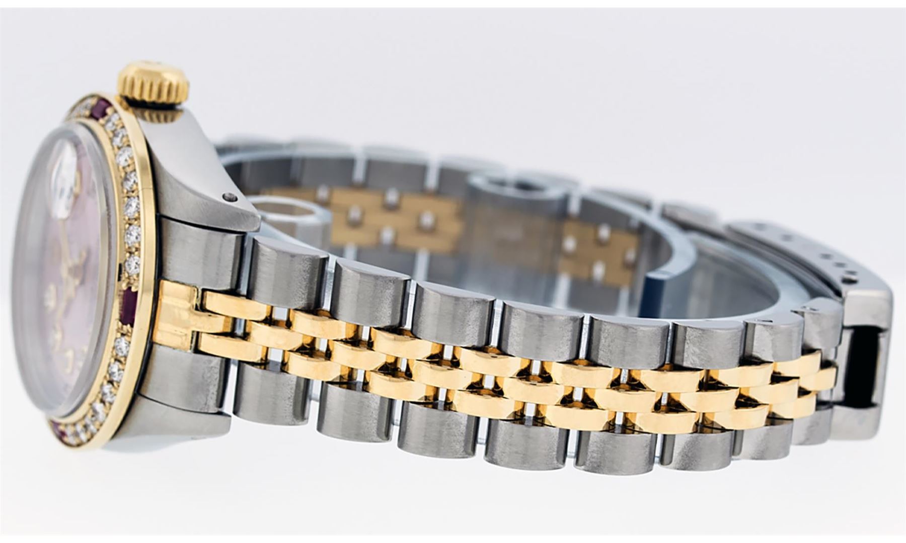 One Ladies Pre Owned Quickset Two Tone Yellow Gold And Stainless Steel Rolex Datejust Polished, Serviced And Electronically Tested, Rolex Yellow Gold And Stainless Steel Case: 26mm, Rolex Yellow Gold Crown, Custom Bezel: New 18K Yellow Gold Ruby Beadset Diamond Bezel, Diamond + Gem Count: 28 Diamonds + 4 Rubies. Custom Crystal: New Sapphire With Magnified Date Window. Custom Hands: New Luminescent Hands. Rolex Movement: Automatic Winding Movement 2135. Custom Dial: Custom Pink Dial With Added Diamond Hour Markers, Diamond Count: 10 Diamond On Dial. Date Window: 3 O'Clock Position Date Display, Model: Datejust, Condition: G-6 Extra Fine. Rolex Bracelet: Two Tone Yellow Gold And Stainless Steel Jubilee Band. Bright Polish. 6.0 Inch Length, Adjustable. Standard Clasp, With Rolex Logo. This Watch Has Been Serviced Time Tested And Is In Excellent Condition It Is Free Of All Scratches And Dents.
