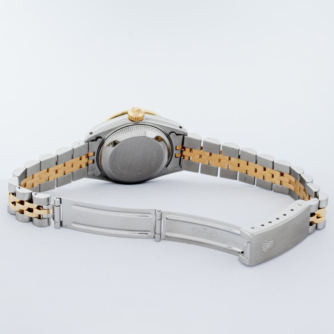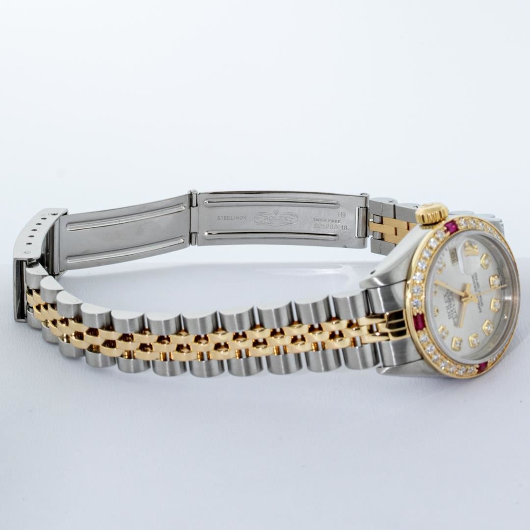 One Ladies Pre Owned Rolex Quickset Two Tone 18K Yellow Gold And Stainless Steel Datejust Polished, Serviced & Electronically Tested, Rolex Yellow Gold And Stainless Steel Case: 26mm, Rolex Yellow Gold Crown, Custom Bezel: New 18K Yellow Gold Ruby Beadset Diamond Bezel, Diamond + Gem Count: 28 Diamonds + 4 Rubies. Custom Crystal: New Sapphire With Magnified Date. Custom Hands: New Luminescent Hands. Rolex Movement: Automatic Winding Movement 2135. Custom Dial: Custom Silver Diamond With Added Diamond Hour Markers, Diamond Count: 10 Diamonds On Dial. Date Window: 3 O'Clock Position Date Display, Model: Quickset Datejust, Condition: G-6 Extra Fine. Rolex Bracelet: Two Tone Yellow Gold & Stainless Steel Jubilee. Bright Polish. 6.0 Inch Length, Adjustable. Standard Clasp, With Rolex Logo. This Watch Has Been Serviced Time Tested And Is In Excellent Condition It Is Free Of All Scratches And Dents.