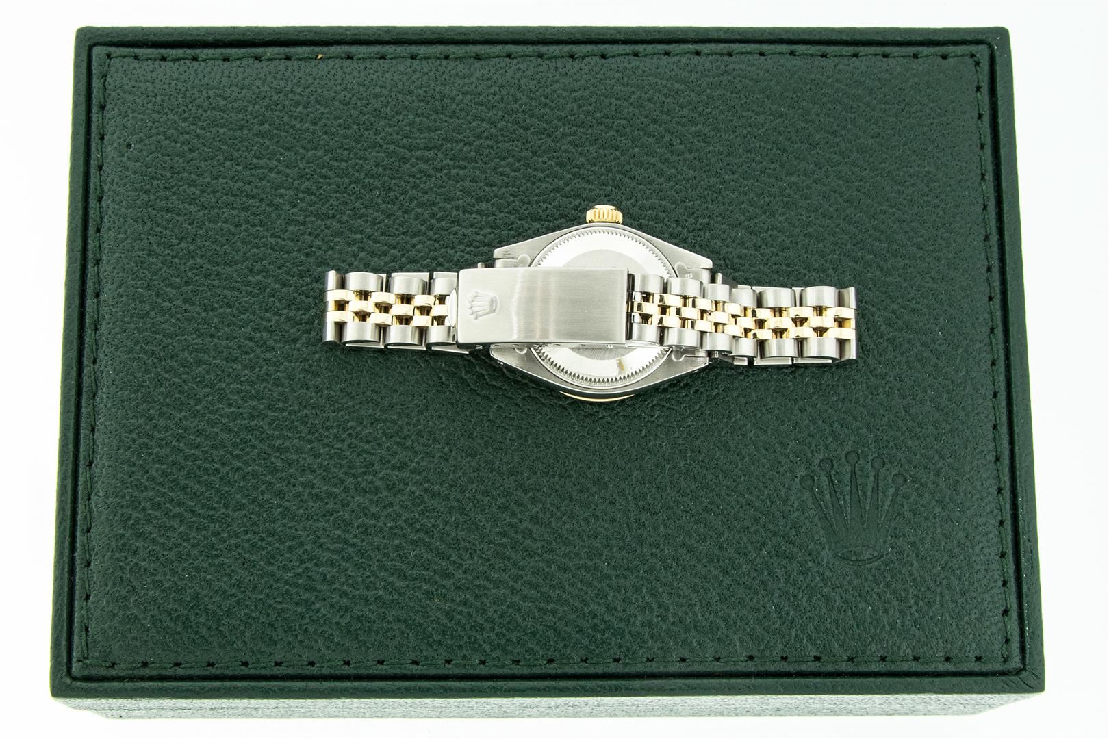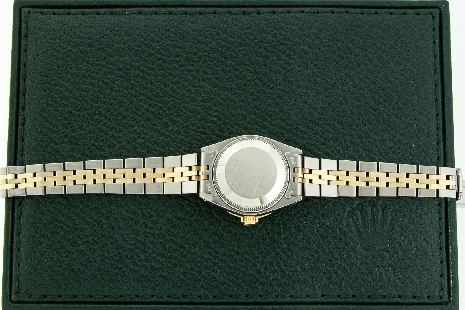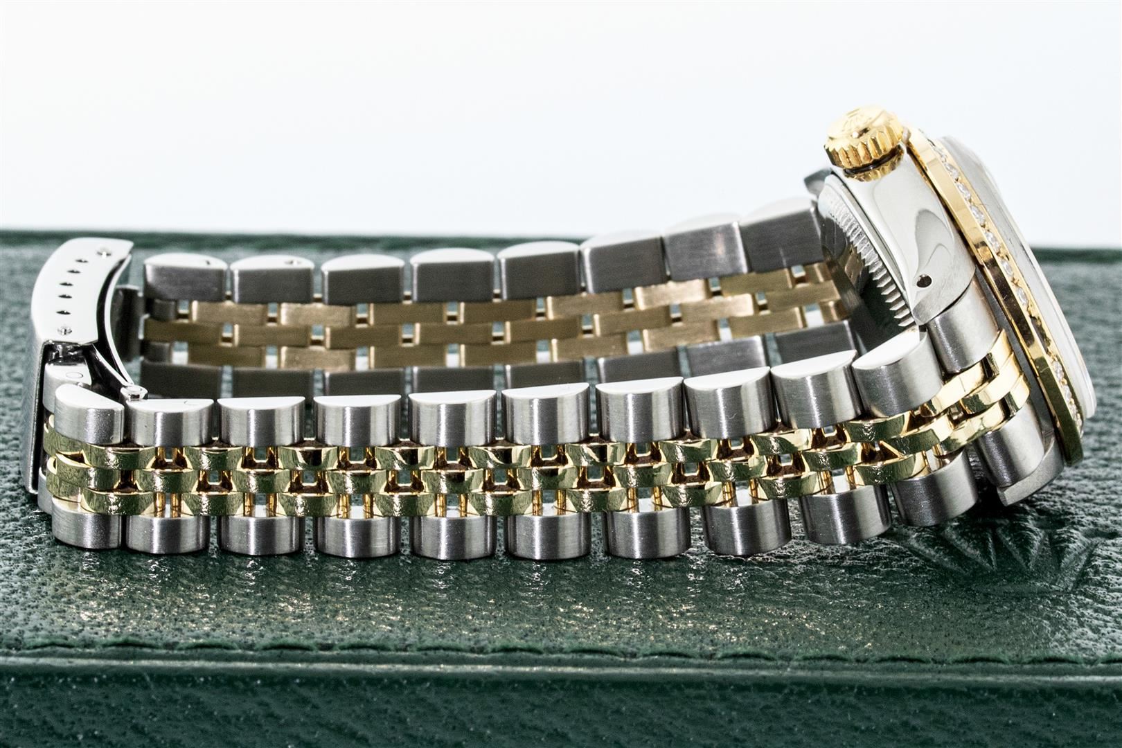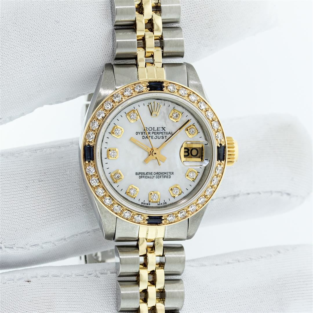 One Ladies Two Tone Yellow Gold And Stainless Steel Rolex Datejust Polished, Serviced & Electronically Tested, Yellow Gold & Stainless Steel Case: 26mm, Rolex Yellow Gold Crown, Custom Bezel: New 18K Yellow Gold Sapphire Beadset Diamond Bezel, Diamond + Gem Count: 28 Diamonds + 4 Sapphires, Clarity: SI-VS, Color: G to H. Custom Crystal: New Sapphire With Magnified Date Window. Custom Hands: New Luminescent Hands. Rolex Movement: Automatic Winding Movement. Custom Dial: Mother Of Pearl Set With Diamond Hour Markers & Dash Track, Diamond Count: 10 Diamond in Dial, G To H In Color, SI-VS Clarity. Date Window: 3 O'clock Position Date Display, Model: Datejust, Condition: G-6 Extra Fine. Rolex Bracelet: Two Tone Yellow Gold & Stainless Steel Jubilee Band. Bright Polish. 6.0 Inch Length, Adjustable. Standard Clasp, With Rolex Logo. This Pre Owned Watch Has Been Serviced Time Tested And Is In Excellent Condition It Is Free Of All Scratches And Dents. This Watch Comes With A Rolex Box.