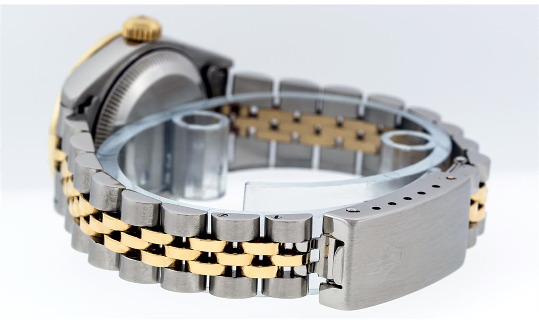 One Ladies Pre Owned Quickset Two Tone 18K Yellow Gold And Stainless Steel Rolex Datejust Polished, Serviced And Electronically Tested, 18K Yellow Gold And Stainless Steel Case: 26mm, 18K Yellow Gold Crown, Custom Bezel: New 18K Yellow Gold Beadset Diamond Bezel, Diamond Count: 43 Diamonds On Dial. Custom Crystal: New Sapphire With Date Window. Custom Hands: New Luminescent Hands. Rolex Movement: Quickset Automatic Winding Movement 2235. Custom Dial: Custom Blue Dial With Added Diamonds, Stone Count: 43 Diamonds. Date Window: 3 O'Clock Position Date Display, Model: Datejust. Condition: G-6 Extra Fine. Rolex Bracelet: Two Tone 18K Yellow Gold And Stainless Steel Jubilee Band. Bright Polish. 6.0 Inch Length, Adjustable. Standard Clasp, With Rolex Logo. This Watch Has Been Serviced Time Tested And Is In Excellent Condition It Is Free Of All Scratches And Dents.