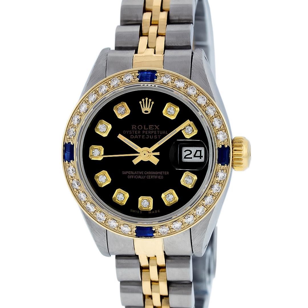 One Ladies Two Tone Rolex Datejust Polished, Serviced & Electronically Tested, 14K Yellow Gold & Stainless Steel Case:26mm, 14K Yellow Gold Crown, Custom Bezel: 18K Yellow Gold Sapphire Beadset Diamond Bezel, Diamond Count: 28 Diamonds + 4 Sapphires. Total Weight .70 Carat, Clarity: Si-VS, Color: G to H. Custom Crystal: Synthetic Sapphire Cyclops Lens. Movement: Automatic Winding Movement Caliber 2030. Custom Dial: Black With Diamond Hour Markers, Diamond Count: 10 Diamonds In Dial. Diamond Color: G To H, Clarity: SI-VS. Date Window: 3 O'Clock Position Date Display, Model: Datejust. Condition: G-6 Extra Fine. Bracelet: Two Tone 14K Yellow Gold & Stainless Steel Jubilee. Bright Polish. 5.5 Inch Length, Adjustable. Standard Clasp, With Rolex Logo.