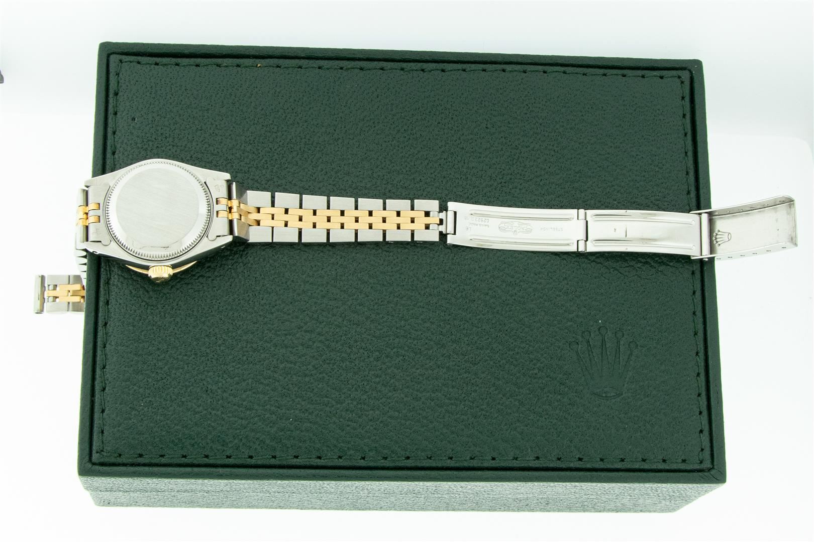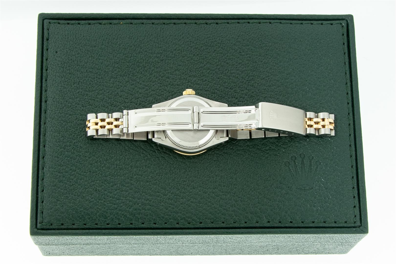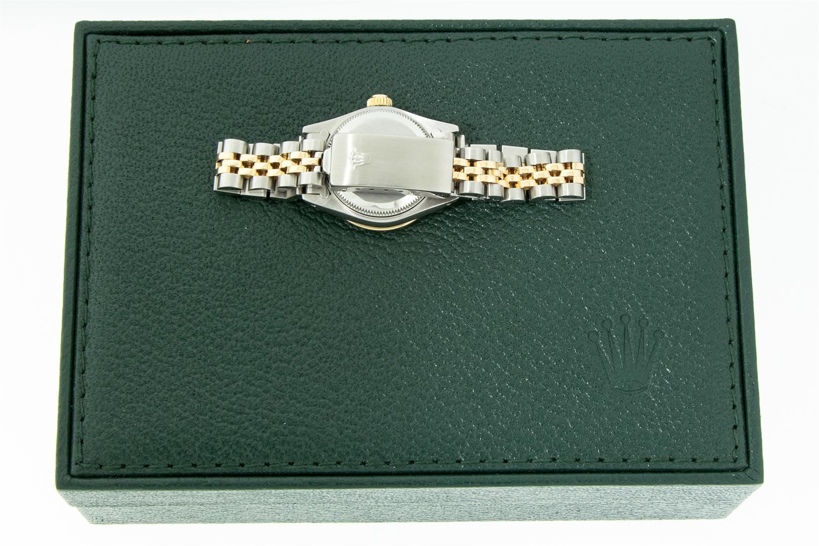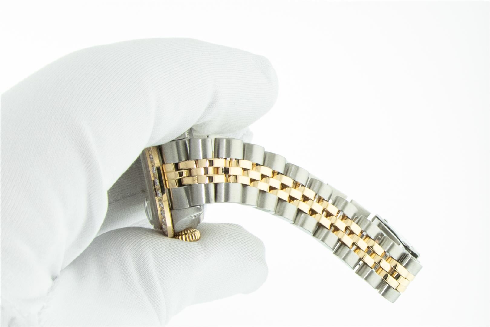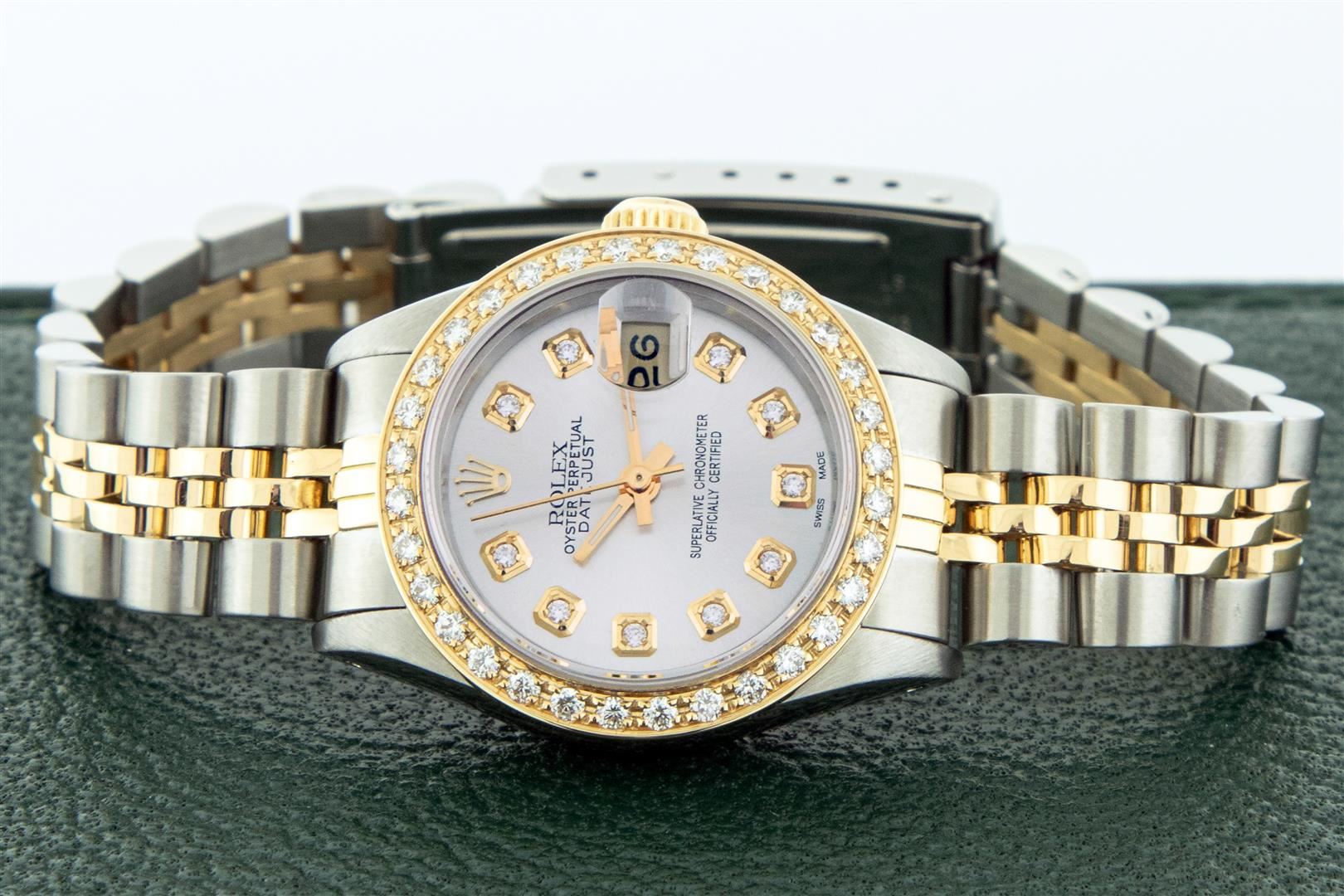 One Ladies Two Tone Rolex Datejust Polished, Serviced & Electronically Tested, Rolex Yellow Gold & Stainless Steel Case: 26mm, Rolex Yellow Gold Crown, Custom Bezel: New 18K Yellow Gold Beadset Diamond Bezel, Diamond Count: 32 Diamonds Total Weight .70 Carat, Clarity: Si-VS, Color: G to H. Custom Crystal: New Sapphire With Magnified Date Window. Custom Hands: New Luminescent Hands. Rolex Movement: Automatic Winding Movement. Custom Dial: Refinished To Silver With Added Diamond Hour Markers, 10 Diamond in Dial G To H In Color, Si-VS Clarity. Date Window: 3 O'clock Position Date Display, Model: Datejust. Condition: G-6 Extra Fine. Rolex Bracelet: Two Tone Yellow Gold & Stainless Steel Jubilee Band. Bright Polish. 6.0 Inch Length, Adjustable. Standard Clasp, With Rolex Logo. This Pre Owned Watch Has Been Serviced Time Tested And Is In Excellent Condition It Is Free Of All Scratches And Dents.