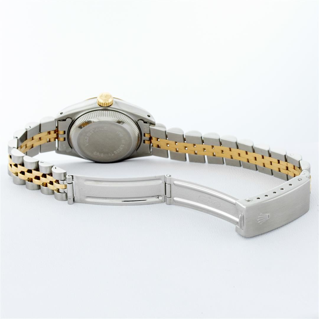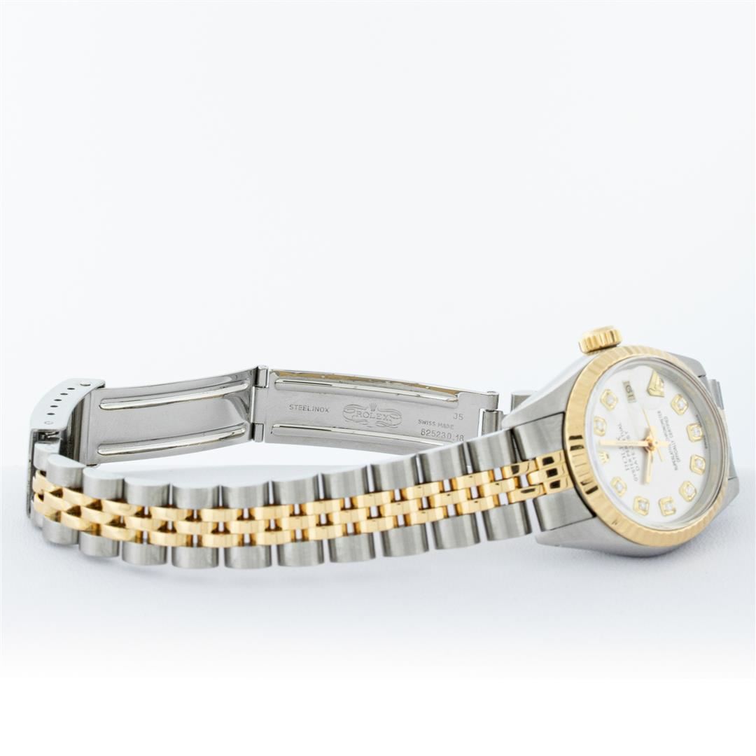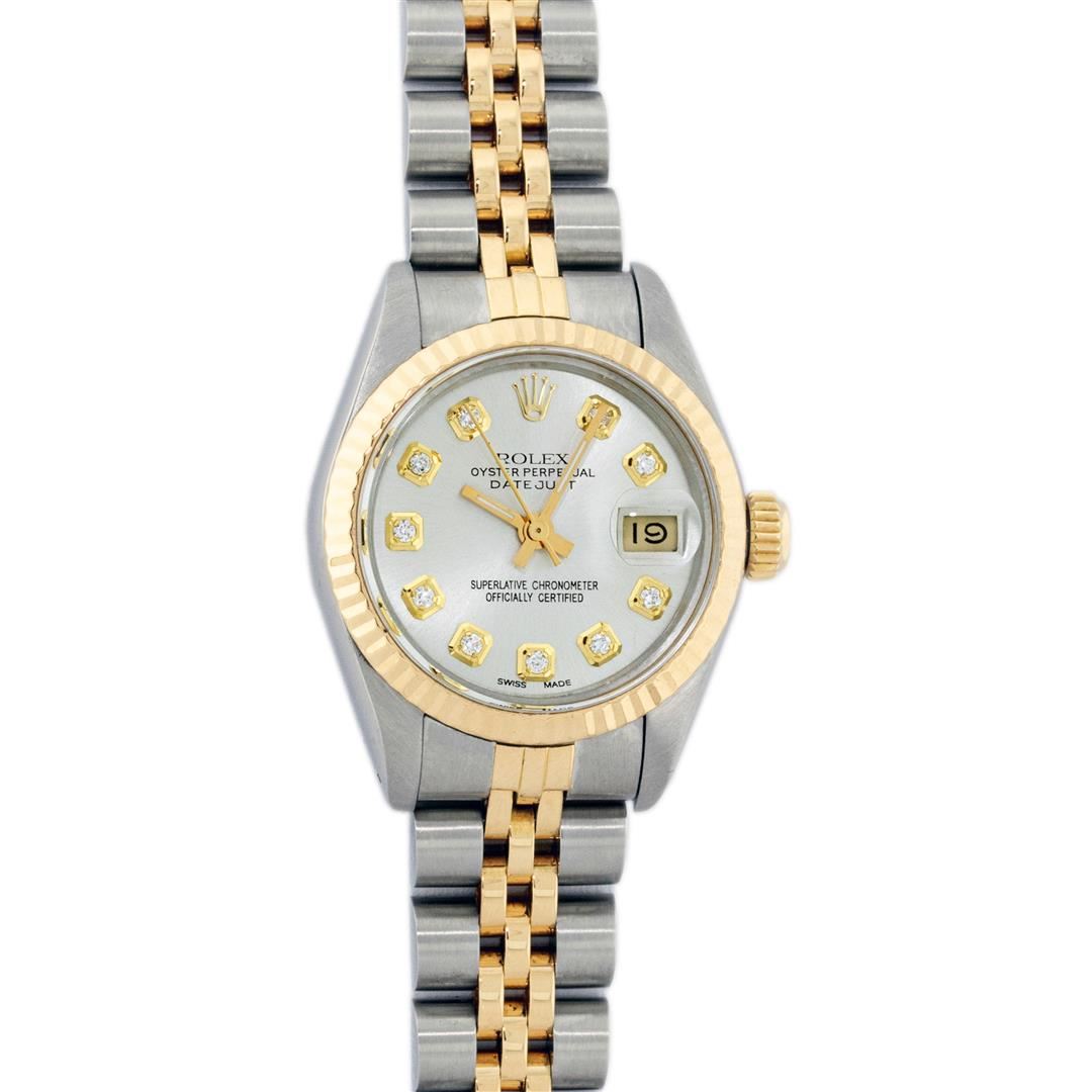 One Ladies Pre Owned Two Tone Rolex Datejust Polished, Serviced & Electronically Tested, Yellow Gold & Stainless Steel Case: 26mm, Yellow Gold Crown, Rolex Bezel: Yellow Gold Fluted Bezel. Custom Crystal: New Acrylic Cyclops Lens. Custom Hands: New Luminescent Hands. Rolex Movement: Automatic Winding Movement. Custom Dial: Refinished To Silver With Added Diamond Hour Markers, Diamond Count: 10 Diamonds, Color: G to H, Clarity: VS2-SI1. Date Window: 3 O'Clock Position Date Display, Model: Datejust. Condition: G-6 Extra Fine. Rolex Bracelet: Two Tone Yellow Gold & Stainless Steel Jubilee Band. Bright Polish. 6.0 Inch Length, Adjustable. Standard Clasp, With Rolex Logo. This Watch Has Been Serviced Time Tested And Is In Excellent Condition It Is Free Of All Scratches And Dents.