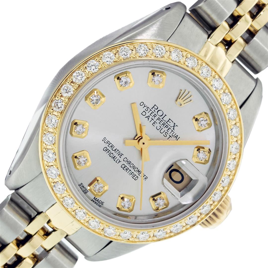 One Ladies Two Tone Rolex Datejust Polished, Serviced & Electronically Tested, Yellow Gold & Stainless Steel Case: 26mm, Rolex Yellow Gold Crown, Custom Bezel: New 18K Yellow Gold Beadset Diamond Bezel, Diamond Count: 32 Diamonds, Total Weight .70 Carat, Clarity: SI-VS, Color: G to H. Custom Crystal: New Sapphire With Magnified Date Window. Custom Hands: New Hands. Rolex Movement: Automatic Winding Movement. Custom Dial: Refinished To Silver With Added Diamond Hour Markers, Diamond Count: 10 Diamonds in Dial, G To H In Color, VS Clarity. Date Window: 3 O'clock Position Date Display, Model: Datejust, Condition: G-6 Extra Fine. Rolex Bracelet: Two Tone Yellow Gold & Stainless Steel Jubilee Band. Bright Polish. 6.0 Inch Length, Adjustable. Standard Clasp, With Rolex Logo. This Pre Owned Watch Has Been Serviced Time Tested And Is In Excellent Condition It Is Free Of All Scratches And Dents. This Watch Comes With A Rolex Box And Booklets.