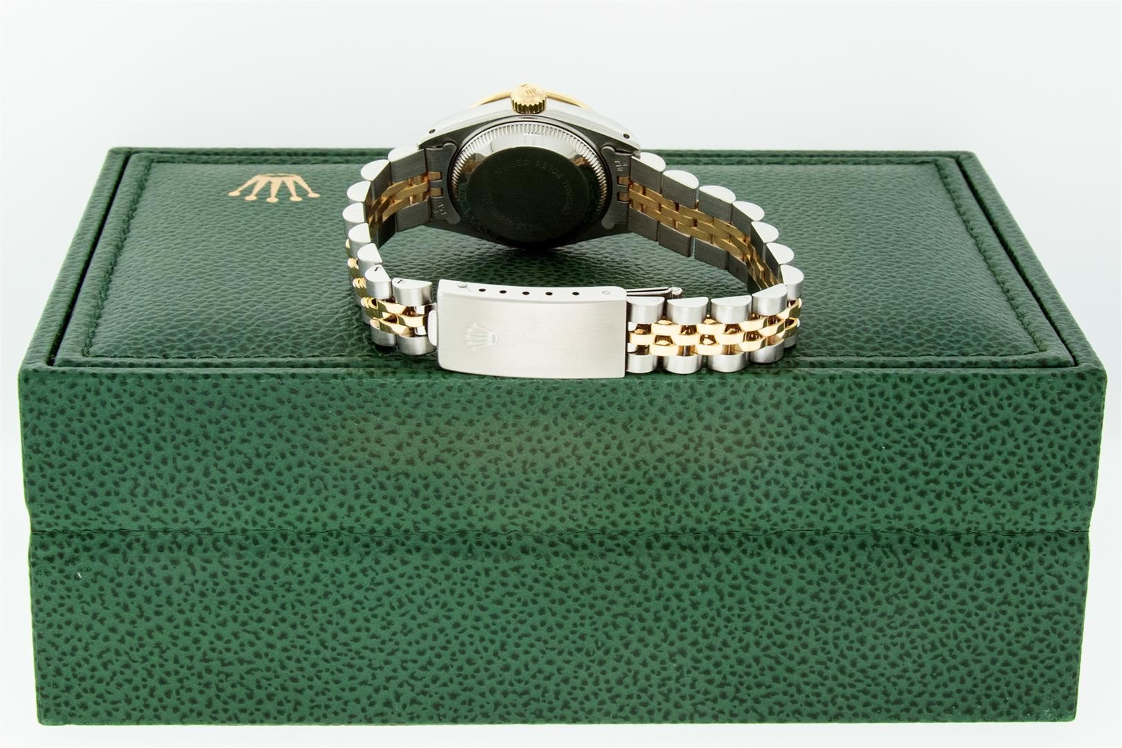 One Ladies Two Tone Rolex Datejust Polished, Serviced & Electronically Tested, Rolex Yellow Gold & Stainless Steel Case: 26mm, Rolex Yellow Gold Crown, Custom Bezel: New 18K Yellow Gold Ruby Beadset Diamond Bezel, Diamond + Gem Count: 28 Diamonds + 4 Rubies Total Weight .70 Carat, Clarity: SI-VS, Color: G to H. Custom Crystal: New Sapphire With Magnified Date Window. Custom Hands: New Luminescent Hands. Rolex Movement: Automatic Winding Movement. Custom Dial: Refinished To Silver With Added Diamond Hour Markers, Diamond Count: 10 Diamonds On Dial, G To H In Color, Si-VS Clarity. Date Window: 3 O'clock Position Date Display, Model: Datejust, Condition: G-6 Extra Fine. Rolex Bracelet: Two Tone Yellow Gold & Stainless Steel Jubilee Band. Bright Polish. 6.0 Inch Length, Adjustable. Standard Clasp, With Rolex Logo. This Pre Owned Watch Has Been Serviced Time Tested And Is In Excellent Condition It Is Free Of All Scratches And Dents.