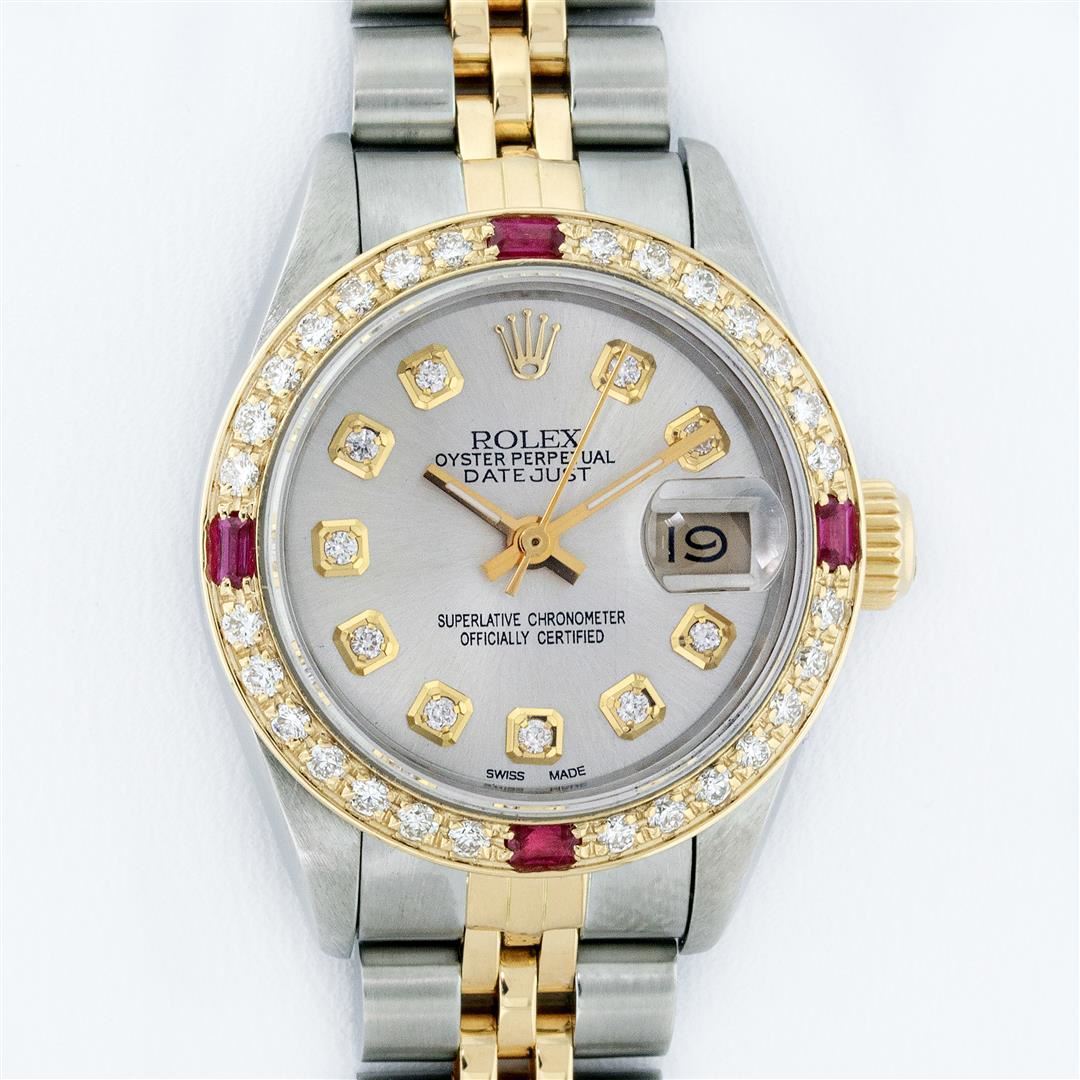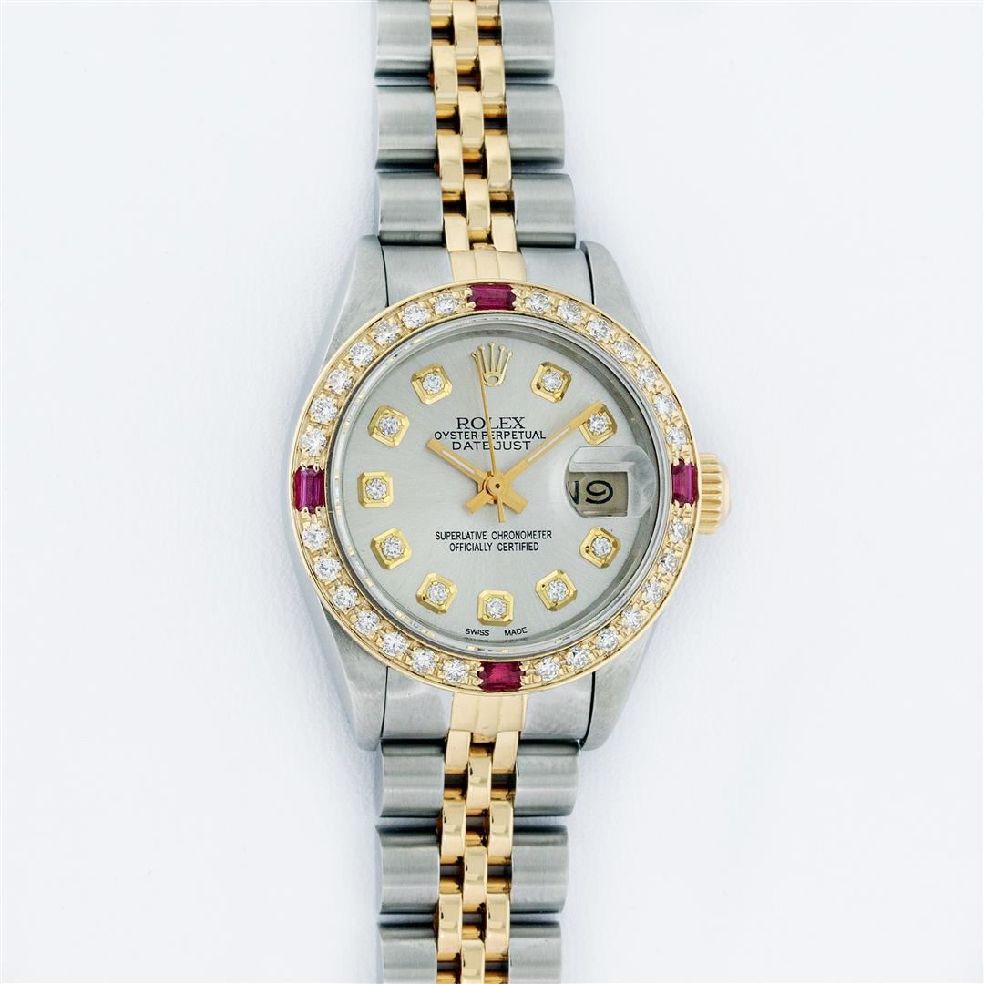 One Ladies Two Tone Rolex Datejust Polished, Serviced & Electronically Tested, Yellow Gold & Stainless Steel Case: 26mm, Yellow Gold Crown, Custom Bezel: New 18K Yellow Gold Ruby Beadset Diamond Bezel, Diamond + Gem Count: 28 Diamonds + 4 Rubies Total Weight .70 Carat, Clarity: Si-VS, Color: G to H. Custom Crystal: New Synthetic Sapphire Cyclops Lens. Custom Hands: New Luminescent Hands. Movement: Automatic Winding Movement. Custom Dial: Silver With Diamond Hour Markers, Diamond Count: 10 Diamonds On Dial, G To H In Color, Si-VS Clarity. Date Window: 3 O'Clock Position Date Display, Model: Datejust, Condition: G-6 Extra Fine. Bracelet: Two Tone Yellow Gold & Stainless Steel Jubilee. Bright Polish. 6.0 Inch Length, Adjustable. Standard Clasp, With Rolex Logo. This Watch Has Been Serviced Time Tested And Is In Excellent Condition It Is Free Of All Scratches And Dents.