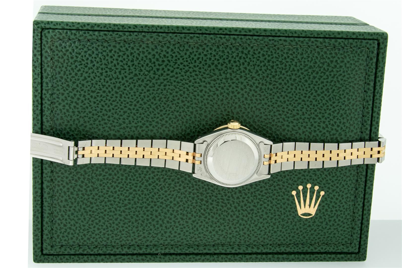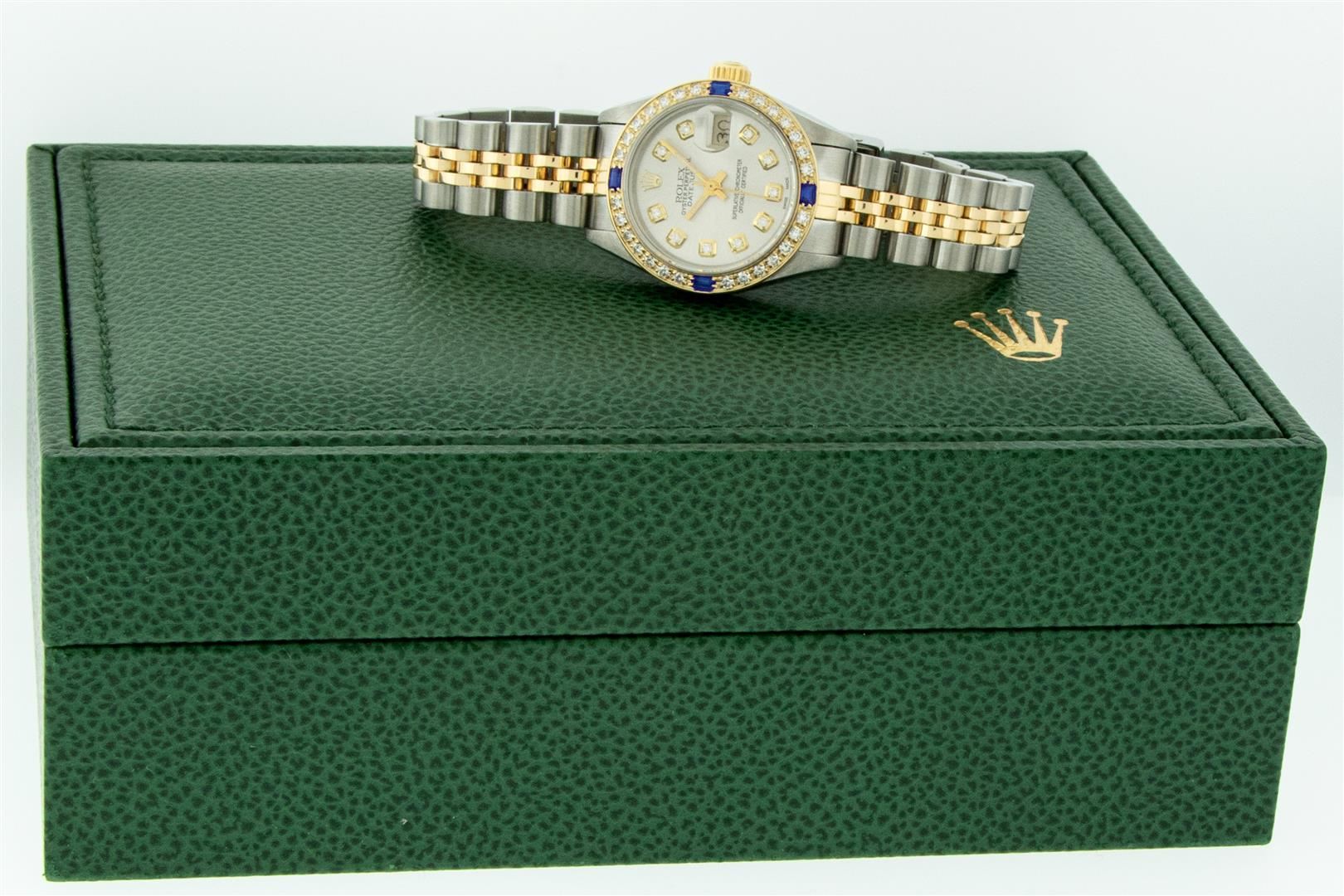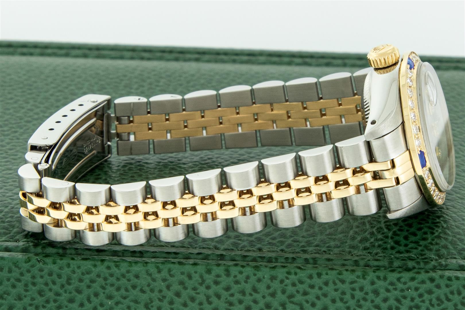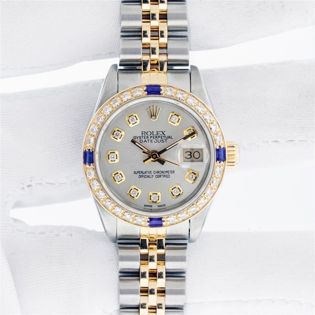 One Ladies Two Tone Rolex Datejust Polished, Serviced & Electronically Tested, Yellow Gold & Stainless Steel Case: 26mm, Rolex Yellow Gold Crown, Custom Bezel: New 18K Yellow Gold Sapphire Bead-set Diamond Bezel, Diamond + Gem Count: 28 Diamonds + 4 Sapphires, Clarity: SI-VS, Color: G to H. Custom Crystal: New Sapphire with Magnified Date Window. Custom Hands: New Luminescent Hands. Rolex Movement: Automatic Winding Movement. Custom Dial: Refinished To Silver Set with Added Diamond Hour Markers, Diamond Count: 10 Diamonds in Dial, G To H In Color, SI-VS Clarity. Date Window: 3 O'Clock Position Date Display, Model: Datejust, Condition: G-6 Extra Fine. Rolex Bracelet: Two Tone Yellow Gold & Stainless Steel Jubilee Band. Bright Polish. 6.0 Inch Length, Adjustable. Standard Clasp, with Rolex Logo. This Preowned Watch Has Been Serviced Time Tested And Is In Excellent Condition It Is Free Of All Scratches And Dents. This Watch Comes with A Rolex Box.