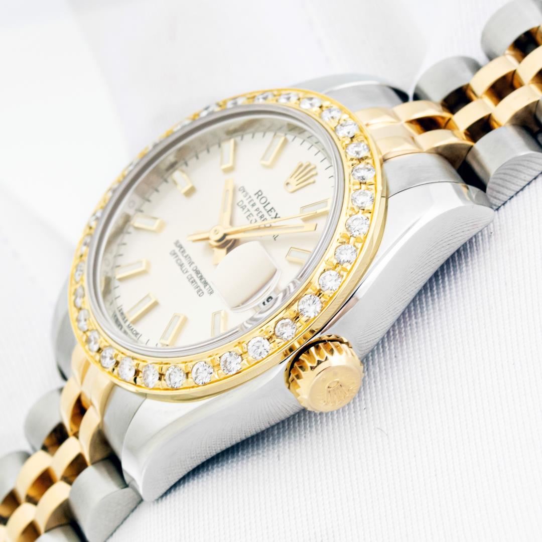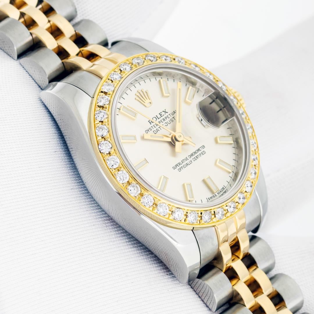 One Ladies Pre Owned Quickset Sapphire 2T 18K Yellow Gold & Stainless Steel Rolex Datejust Polished Bright with Satin Finish, Serviced & Electronically Tested, Rolex Stainless Steel Case: 26mm, Rolex 18K Yellow Gold Crown, Custom Bezel: New 18K Yellow Gold Beadset Diamond Bezel, Diamond Count: 32 Diamonds On Bezel, Diamond Color: G To H, Clarity: SI-VS. Crystal: Sapphire With Magnified Date Window. Hands: Luminescent Hands. Rolex Movement: Automatic Winding Movement 2235. Rolex Dial: Silver Index With Dash Track. Date Window: 3 O'Clock Position Date Display, Model: Sapphire Quickset Datejust. Condition: G-6 Extra Fine. Rolex Bracelet: 18K Yellow Gold & Stainless Steel Jubilee Band. Bright Polish & Satin Finish. 6.0 Inch Length, Adjustable. Hidden Clap, With Rolex Logo. This Watch Has Been Serviced Time Tested And Is In Excellent Condition It Is Free Of All Scratches And Dents.
