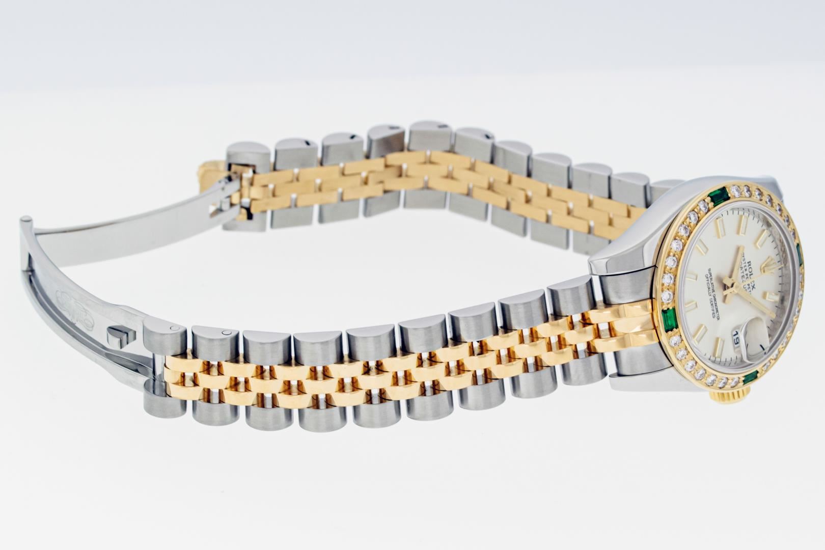One Ladies Pre Owned Quickset Sapphire 2T 18K Yellow Gold & Stainless Steel Rolex Datejust Polished Bright with Satin Finish, Serviced & Electronically Tested, Rolex Stainless Steel Case: 26mm, Rolex 18K Yellow Gold Crown, Custom Bezel: New 18K Yellow Gold Emerald Beadset Diamond Bezel, Stone Count: 28 Diamonds + 4 Emeralds, Diamond Color: G To H, Clarity: SI-VS. Crystal: Sapphire With Magnified Date Window. Hands: Luminescent Hands. Rolex Movement: Automatic Winding Movement 2235. Rolex Dial: Silver Index With Dash Track. Date Window: 3 O'Clock Position Date Display, Model: Sapphire Quickset Datejust. Condition: G-6 Extra Fine. Rolex Bracelet: 18K Yellow Gold & Stainless Steel Jubilee Band. Bright Polish & Satin Finish. 6.0 Inch Length, Adjustable. Hidden Clap, With Rolex Logo. This Watch Has Been Serviced Time Tested And Is In Excellent Condition It Is Free Of All Scratches And Dents.