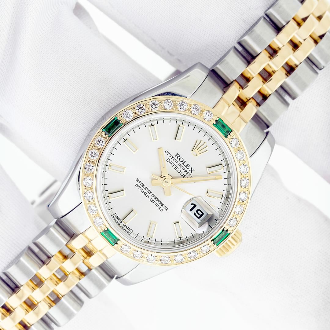 One Ladies Pre Owned Quickset Sapphire 2T 18K Yellow Gold & Stainless Steel Rolex Datejust Polished Bright with Satin Finish, Serviced & Electronically Tested, Rolex Stainless Steel Case: 26mm, Rolex 18K Yellow Gold Crown, Custom Bezel: New 18K Yellow Gold Emerald Beadset Diamond Bezel, Stone Count: 28 Diamonds + 4 Emeralds, Diamond Color: G To H, Clarity: SI-VS. Crystal: Sapphire With Magnified Date Window. Hands: Luminescent Hands. Rolex Movement: Automatic Winding Movement 2235. Rolex Dial: Silver Index With Dash Track. Date Window: 3 O'Clock Position Date Display, Model: Sapphire Quickset Datejust. Condition: G-6 Extra Fine. Rolex Bracelet: 18K Yellow Gold & Stainless Steel Jubilee Band. Bright Polish & Satin Finish. 6.0 Inch Length, Adjustable. Hidden Clap, With Rolex Logo. This Watch Has Been Serviced Time Tested And Is In Excellent Condition It Is Free Of All Scratches And Dents.