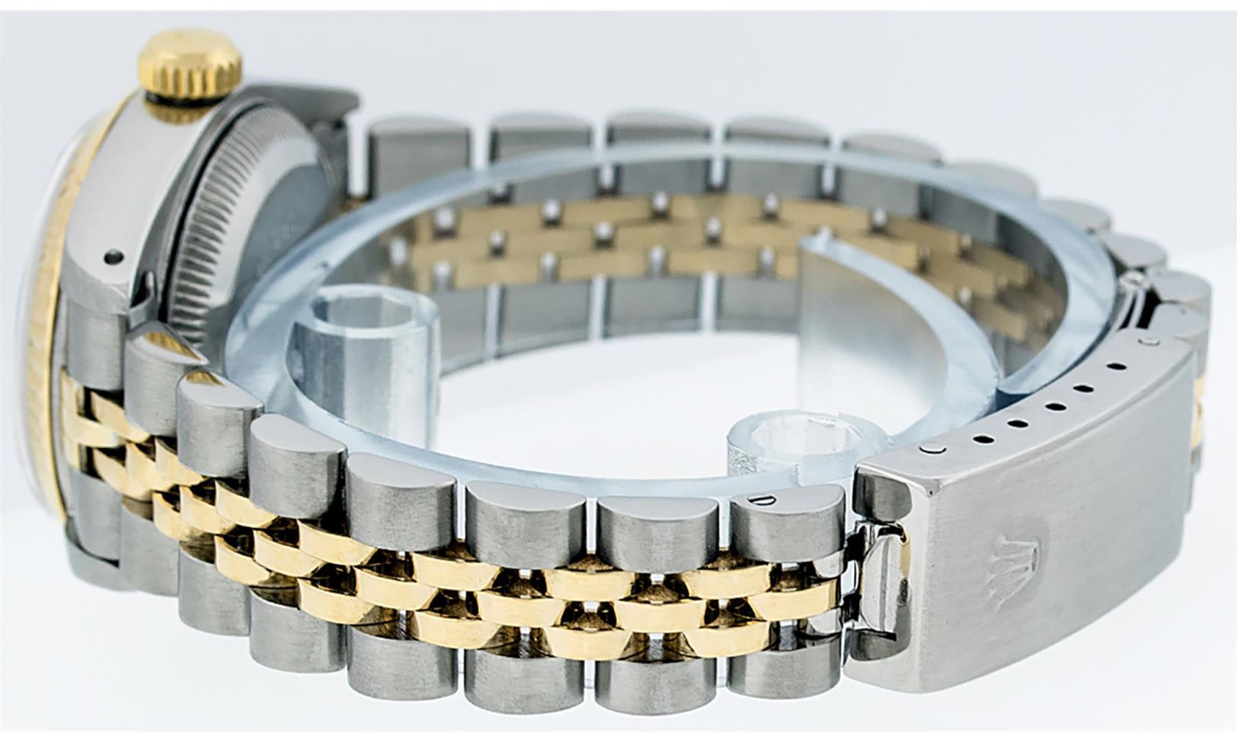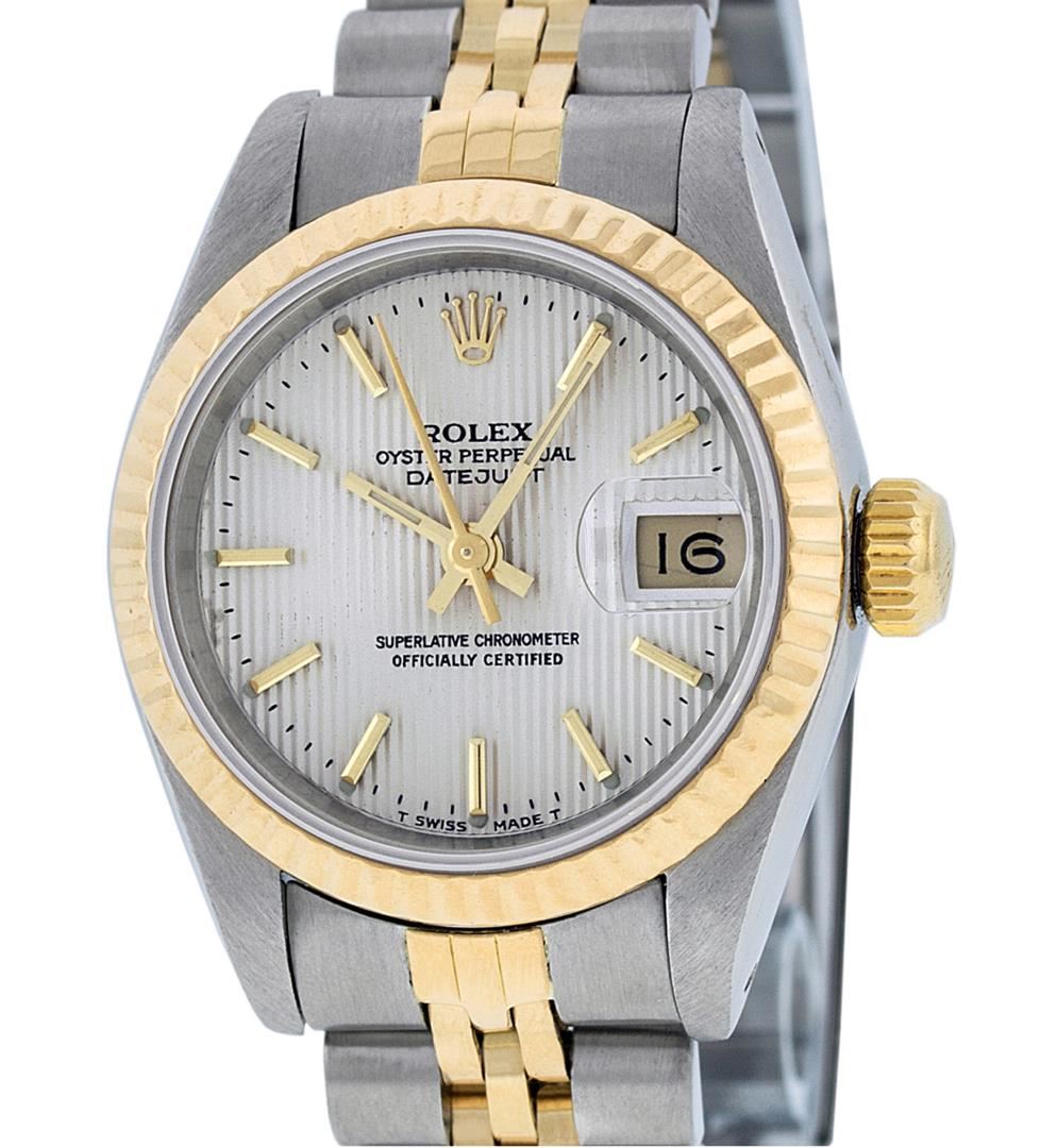 One Ladies Pre Owned Two Tone 14K Yellow Gold & Stainless Steel Rolex Polished, Serviced & Electronically Tested, 14 Yellow Gold & Stainless Steel Case: 26mm, Yellow Gold Crown, Bezel: 14K Yellow Gold Fluted Bezel. Crystal: Plastic With Magnified Date Window. Hands: Luminescent Hands. Rolex Movement: Automatic Winding Movement 2030. Rolex Dial: Silver Index Tapestry With Dash Track & Lumi Dots. Date Window: 3 O'Clock Position Date Display, Model: Datejust. Condition: G-6 Extra Fine. Rolex Bracelet: Two Tone 14K Yellow Gold & Stainless Steel Jubilee Band. Bright Polish. 6.0 Inch Length, Adjustable. Standard Clasp, With Rolex Logo. This Watch Has Been Serviced Time Tested And Is In Excellent Condition It Is Free Of All Scratches And Dents.
