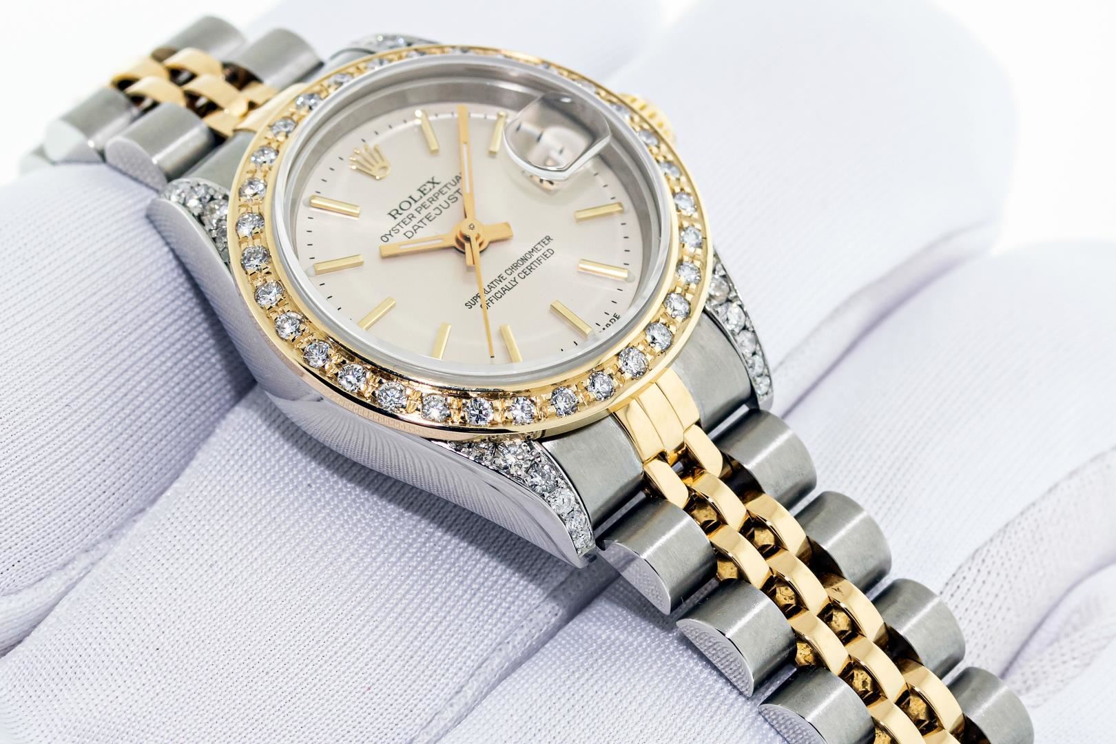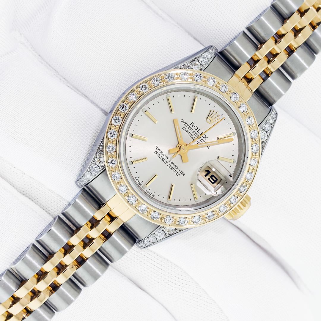 Rolex Ladies Pre Owned Sapphire Quickset 18K Yellow Gold and Stainless Steel Two Tone Datejust Polished Bright with Satin Finish, Serviced & Electronically Tested, Rolex Stainless Steel Case: 26mm, Custom Diamond Lugs: 24 Added Diamonds On Lugs. Rolex 18K Yellow Gold Crown, Custom Bezel: New Beadset Diamond Bezel, Diamond Count: 32 Diamonds On Bezel. Custom Crystal: New Sapphire With Magnified Date Window. Custom Hands: New Hands. Rolex Movement: Automatic Winding Movement 2235. Rolex Dial: Silver With Index Hour Markers And Dash Track With Lumi Dots. Date Window: 3 O'Clock Position Date Display, Model: Quickset Datejust, Condition: G-6 Extra Fine. Rolex Bracelet: 18K Yellow Gold & Stainless Steel Jubilee Band. Bright Polish & Satin Finish. 6.0 Inch Length, Adjustable. Standard Clasp, With Rolex Logo. This Watch Has Been Serviced Time Tested And Is In Excellent Condition It Is Free Of All Scratches And Dents.