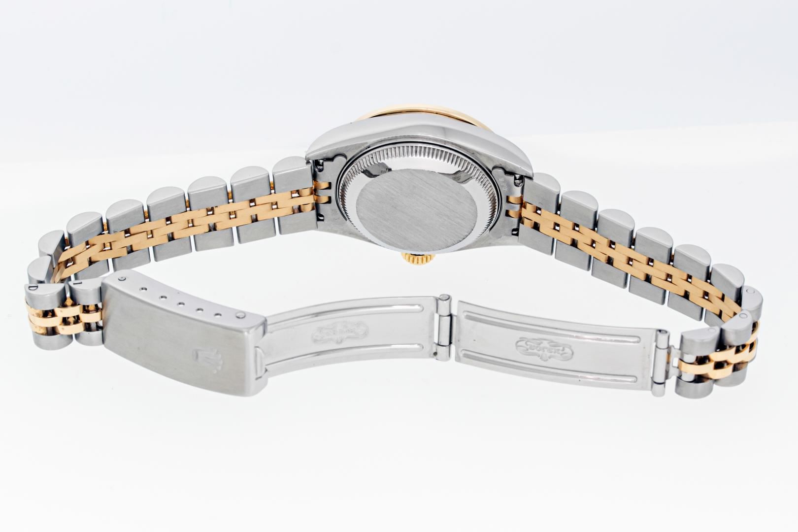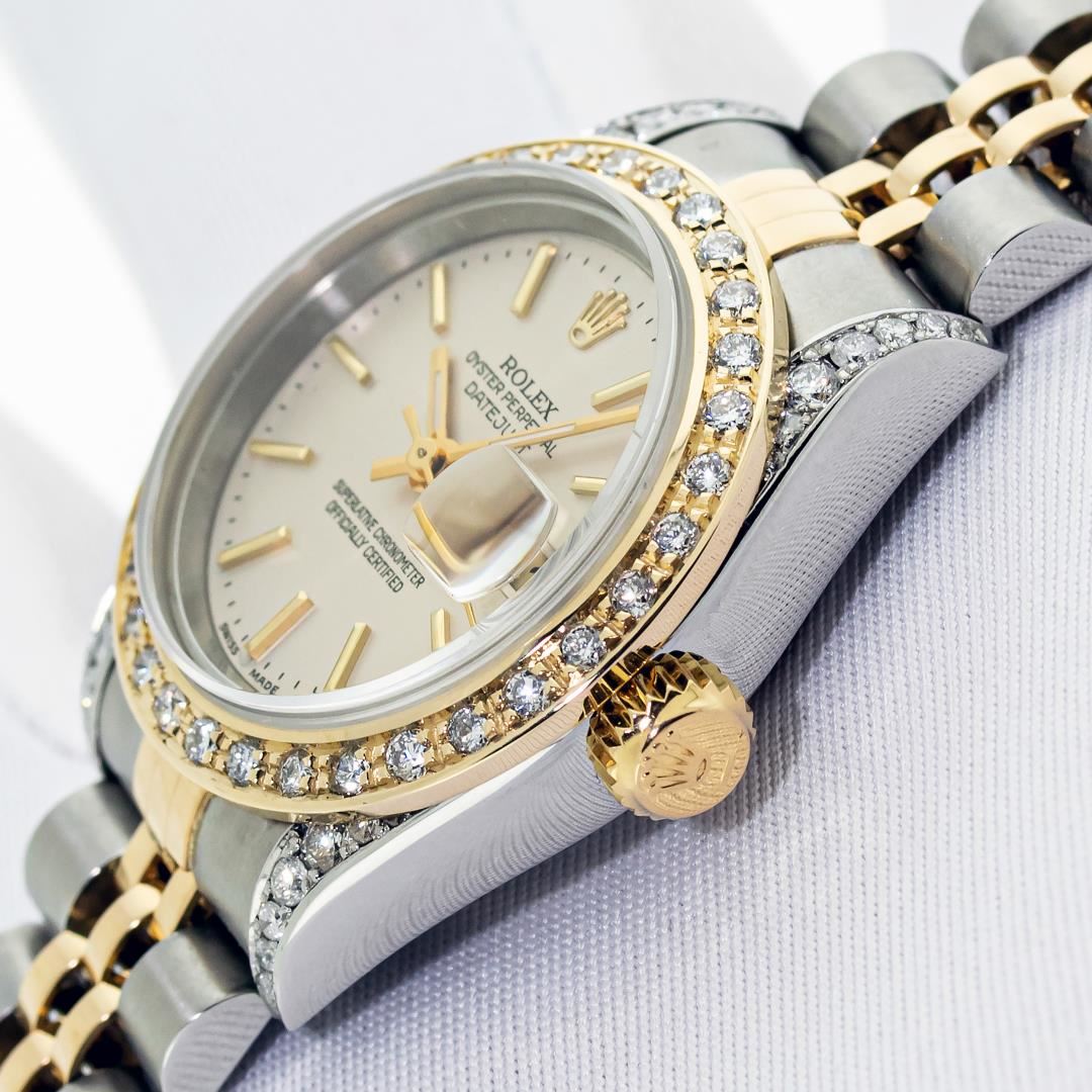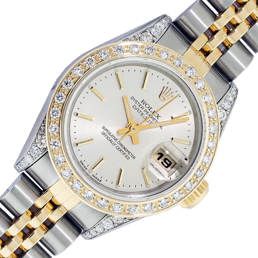 Rolex Ladies Pre Owned Sapphire Quickset 18K Yellow Gold and Stainless Steel Two Tone Datejust Polished Bright with Satin Finish, Serviced & Electronically Tested, Rolex Stainless Steel Case: 26mm, Custom Diamond Lugs: 24 Added Diamonds On Lugs. Rolex 18K Yellow Gold Crown, Custom Bezel: New Beadset Diamond Bezel, Diamond Count: 32 Diamonds On Bezel. Custom Crystal: New Sapphire With Magnified Date Window. Custom Hands: New Hands. Rolex Movement: Automatic Winding Movement 2235. Rolex Dial: Silver With Index Hour Markers And Dash Track With Lumi Dots. Date Window: 3 O'Clock Position Date Display, Model: Quickset Datejust, Condition: G-6 Extra Fine. Rolex Bracelet: 18K Yellow Gold & Stainless Steel Jubilee Band. Bright Polish & Satin Finish. 6.0 Inch Length, Adjustable. Standard Clasp, With Rolex Logo. This Watch Has Been Serviced Time Tested And Is In Excellent Condition It Is Free Of All Scratches And Dents.