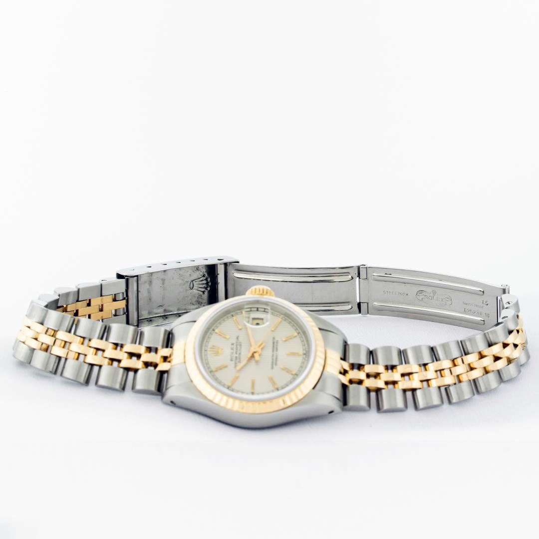 One Ladies Pre Owned Two Tone 14K Yellow Gold & Stainless Steel Rolex Polished, Serviced & Electronically Tested, Rolex 14K Yellow Gold & Stainless Steel Case: 26mm, Rolex Yellow Gold Crown, Rolex Bezel: 14K Yellow Gold Fluted Bezel. Crystal: Plastic With Magnified Date Window. Hands: Luminescent Hands. Rolex Movement: Automatic Winding Movement 2030. Rolex Dial: Silver Index Tapestry With Square Track. Date Window: 3 O'Clock Position Date Display, Model: Datejust. Condition: G-6 Extra Fine. Rolex Bracelet: Two Tone 14K Yellow Gold & Stainless Steel Jubilee Band. Bright Polish. 6.0 Inch Length, Adjustable. Standard Clasp, With Rolex Logo. This Watch Has Been Serviced Time Tested And Is In Excellent Condition It Is Free Of All Scratches And Dents.