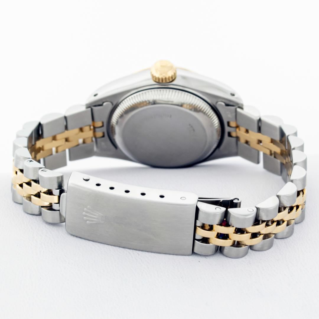 One Ladies Pre Owned Two Tone 14K Yellow Gold & Stainless Steel Rolex Polished, Serviced & Electronically Tested, Rolex 14K Yellow Gold & Stainless Steel Case: 26mm, Rolex Yellow Gold Crown, Rolex Bezel: 14K Yellow Gold Fluted Bezel. Crystal: Plastic With Magnified Date Window. Hands: Luminescent Hands. Rolex Movement: Automatic Winding Movement 2030. Rolex Dial: Silver Index Tapestry With Square Track. Date Window: 3 O'Clock Position Date Display, Model: Datejust. Condition: G-6 Extra Fine. Rolex Bracelet: Two Tone 14K Yellow Gold & Stainless Steel Jubilee Band. Bright Polish. 6.0 Inch Length, Adjustable. Standard Clasp, With Rolex Logo. This Watch Has Been Serviced Time Tested And Is In Excellent Condition It Is Free Of All Scratches And Dents.