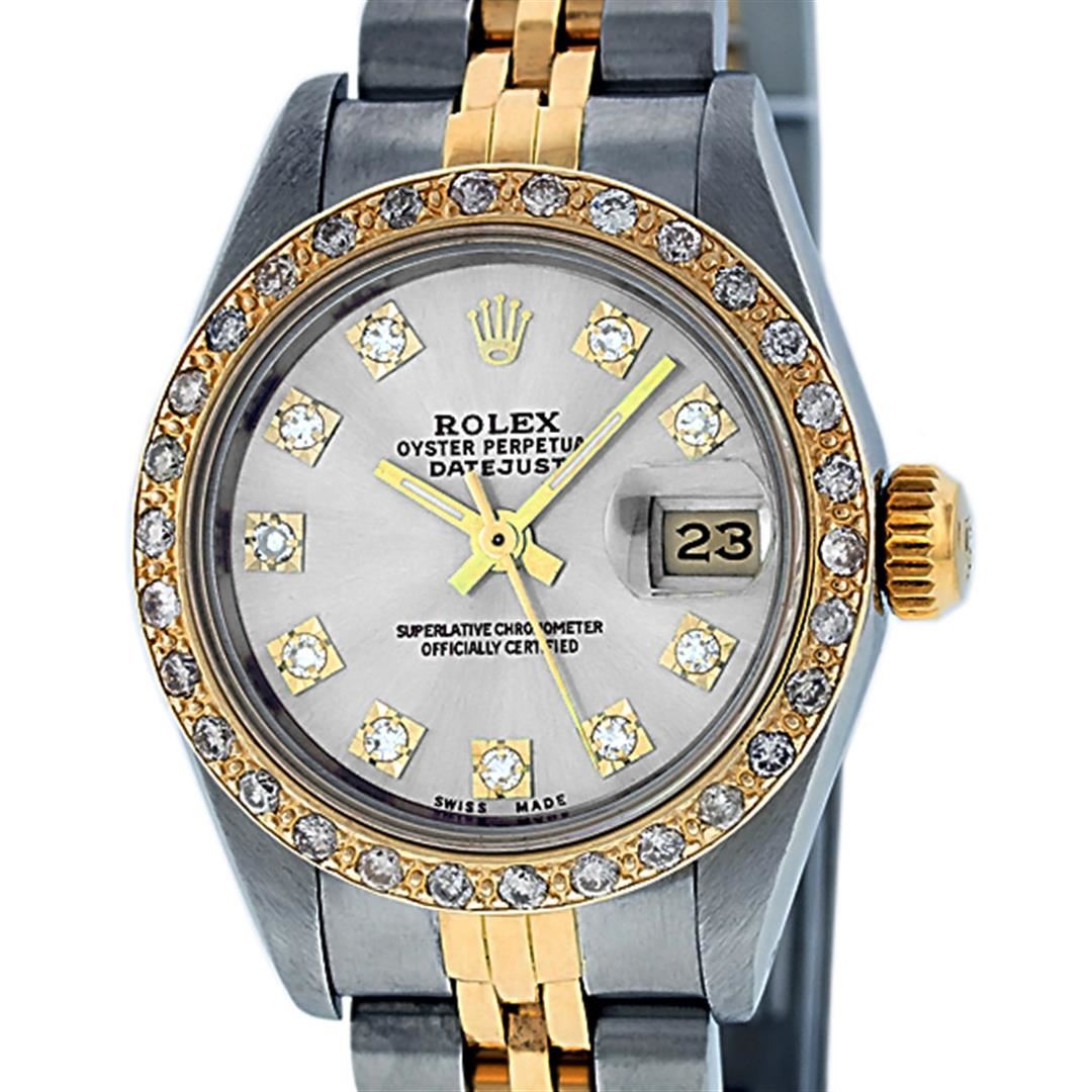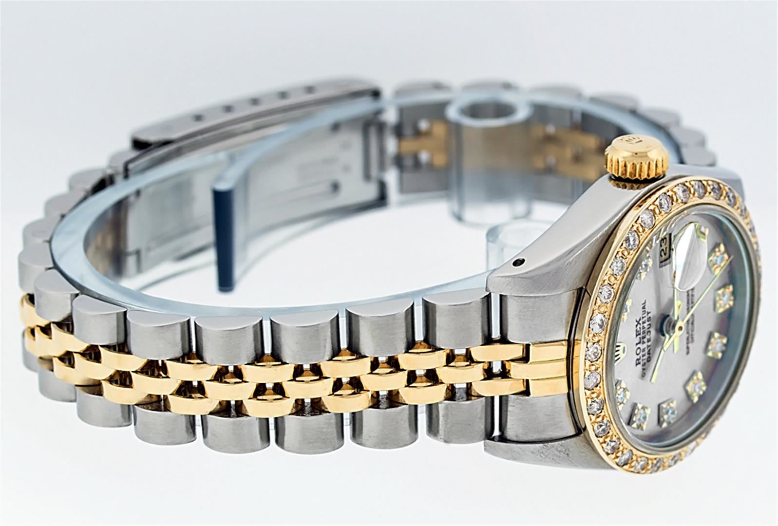 One Ladies Two Tone Rolex Datejust Polished, Serviced & Electronically Tested, 14K Yellow Gold & Stainless Steel Case:26mm, 14K Yellow Gold Crown, Custom Bezel: 18K Yellow Gold Beadset Diamond Bezel, Diamond Count: 32 Diamonds. Total Weight .70 Carat, Clarity: Si-VS, Color: G to H. Custom Crystal: Synthetic Sapphire Cyclops Lens. Movement: Automatic Winding Movement Caliber 2030. Custom Dial: Silver Single Cut VS Diamond Dial. Stone Count: 10 Diamonds In Dial, Clarity: VS, Color: G to H. Date Window: 3 O'Clock Position Date Display, Model: Datejust. Condition: G-6 Extra Fine. Bracelet: Two Tone 14K Yellow Gold & Stainless Steel Jubilee Band. Bright Polish. 6.0 Inch Length, Adjustable. Standard Clasp, With Rolex Logo.