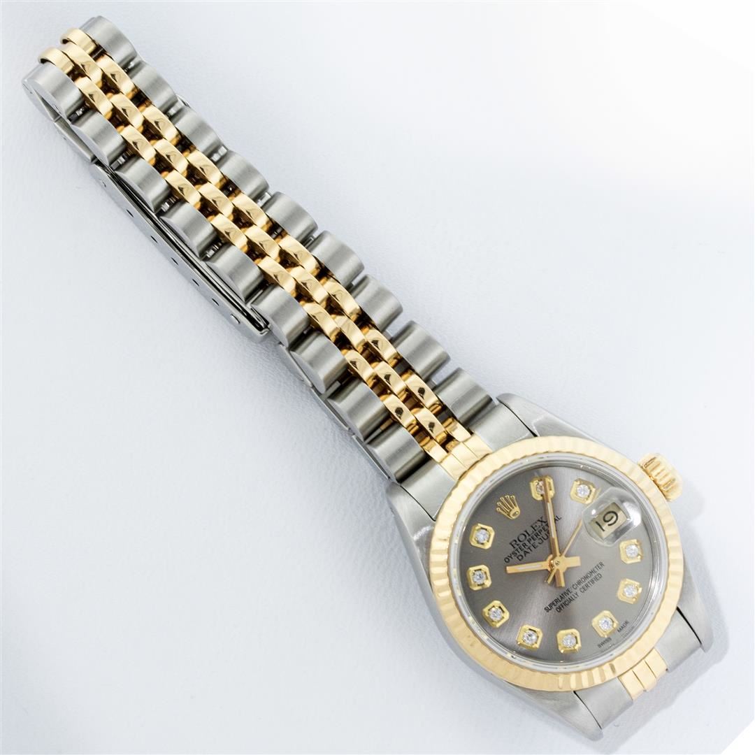 One Ladies Pre Owned Two Tone Rolex Datejust Polished, Serviced & Electronically Tested, Rolex Yellow Gold & Stainless Steel Case: 26mm, Rolex Yellow Gold Crown, Rolex Bezel: Yellow Gold Fluted Bezel. Custom Crystal: New Acrylic Cyclops Lens. Custom Hands: New Luminescent Hands. Rolex Movement: Automatic Winding Movement. Custom Dial: Refinish To Slate Grey With Added Diamond Hour Markers, Diamond Count: 10 Diamonds, Color: G to H, Clarity: VS2-SI1. Date Window: 3 O'Clock Position Date Display, Model: Datejust. Condition: G-6 Extra Fine. Rolex Bracelet: Two Tone Yellow Gold & Stainless Steel Jubilee Band. Bright Polish. 6.0 Inch Length, Adjustable. Standard Clasp, With Rolex Logo. This Watch Has Been Serviced Time Tested And Is In Excellent Condition It Is Free Of All Scratches And Dents.