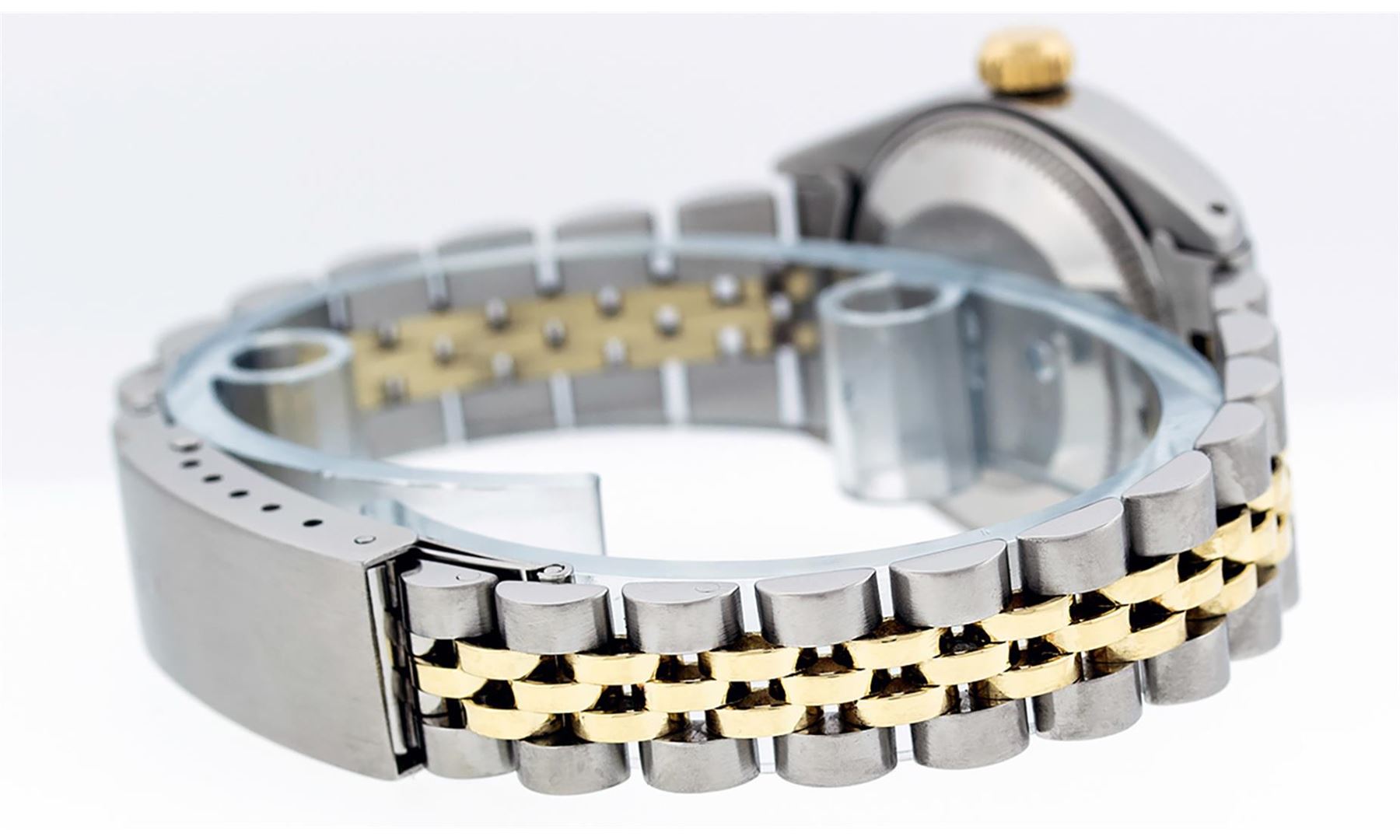 One Ladies Pre Owned Two Tone Rolex Datejust Polished, Serviced & Electronically Tested, Rolex Yellow Gold & Stainless Steel Case: 26mm, Rolex Yellow Gold Crown, Rolex Bezel: Yellow Gold Fluted Bezel. Custom Crystal: New Acrylic Cyclops Lens. Custom Hands: New Luminescent Hands. Rolex Movement: Automatic Winding Movement. Custom Dial: Refinish To Slate Grey With Diamond Hour Markers, Diamond Count: 10 Diamonds, Color: G to H, Clarity: VS2-SI1. Date Window: 3 O'Clock Position Date Display, Model: Datejust. Condition: G-6 Extra Fine. Rolex Bracelet: Two Tone Yellow Gold & Stainless Steel Jubilee Band. Bright Polish. 6.0 Inch Length, Adjustable. Standard Clasp, With Rolex Logo. This Watch Has Been Serviced Time Tested And Is In Excellent Condition It Is Free Of All Scratches And Dents.