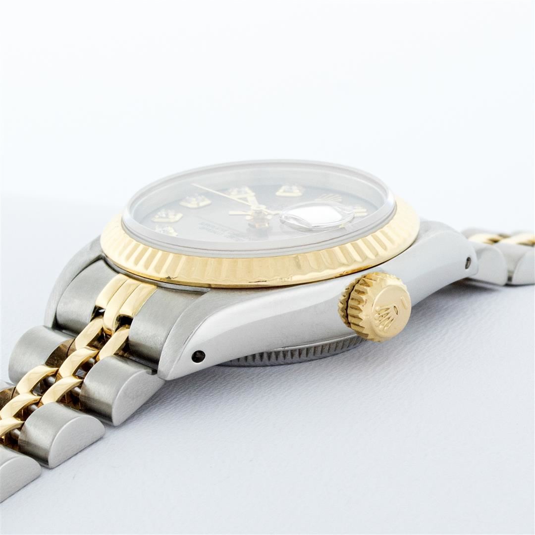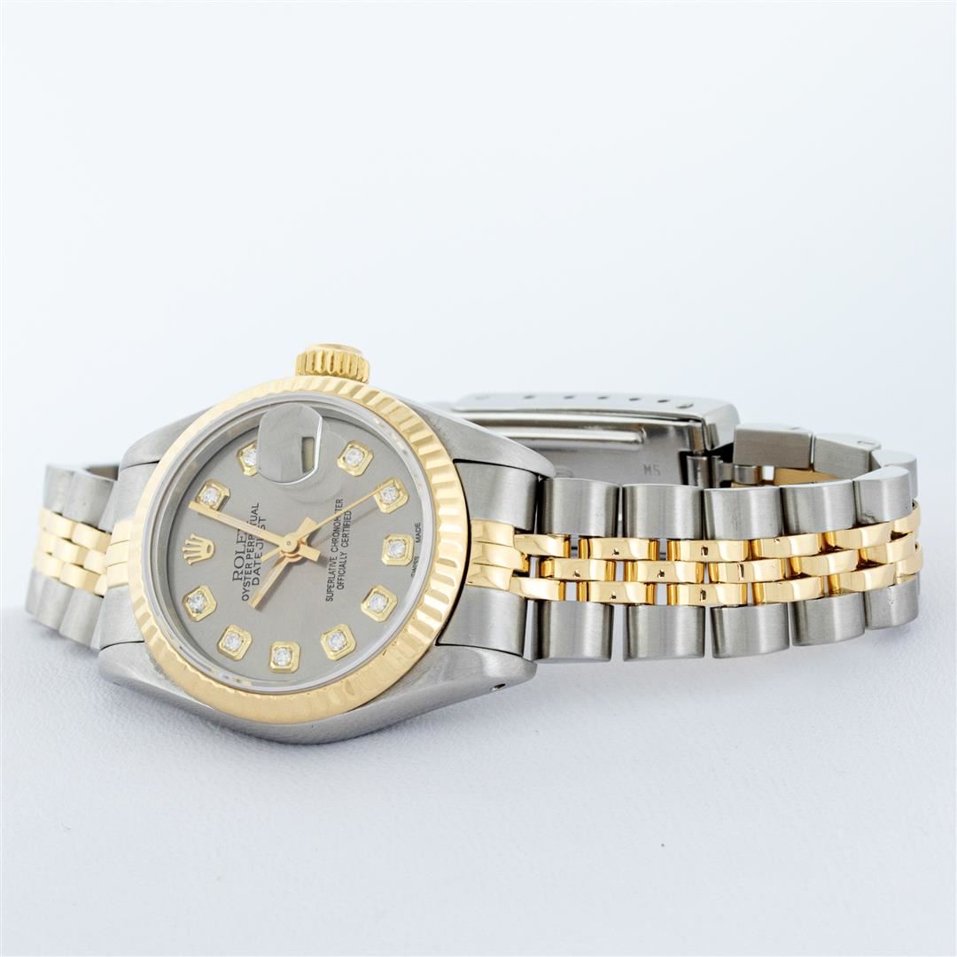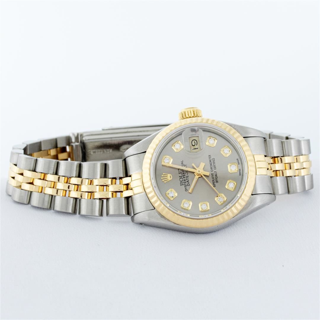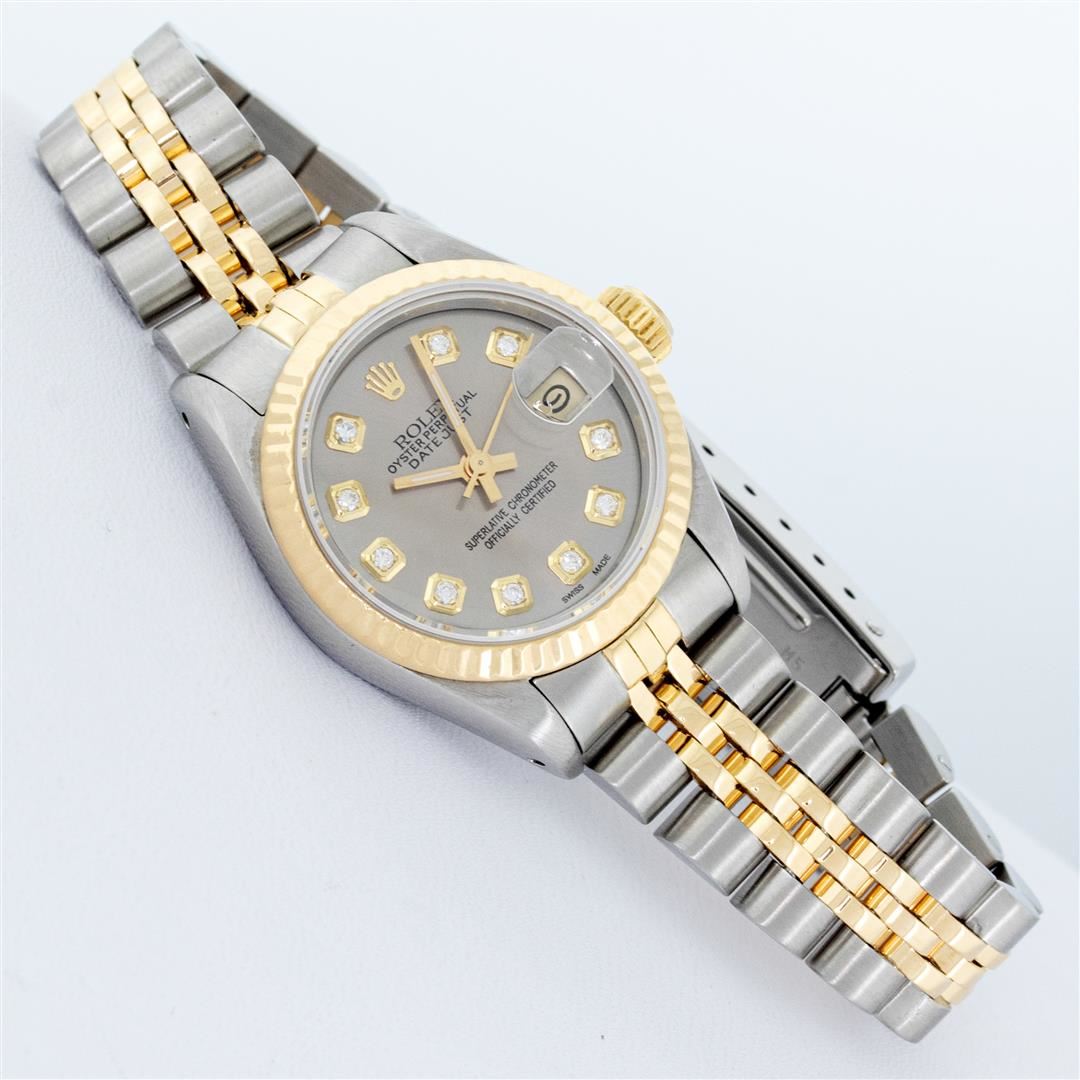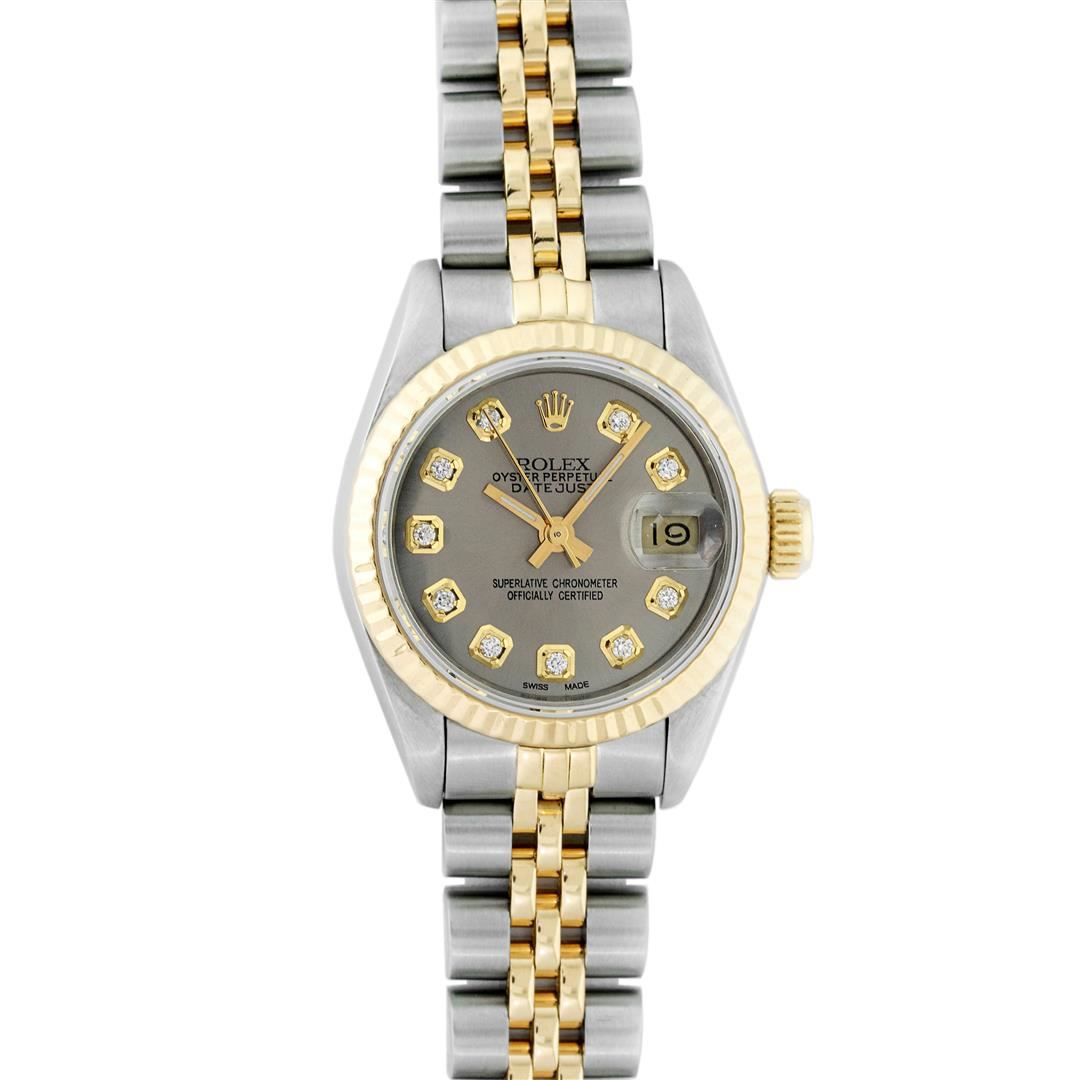 One Ladies Pre Owned Two Tone Rolex Datejust Polished, Serviced & Electronically Tested, Rolex Yellow Gold & Stainless Steel Case: 26mm, Rolex Yellow Gold Crown, Rolex Bezel: Yellow Gold Fluted Bezel. Custom Crystal: New Acrylic Cyclops Lens. Custom Hands: New Luminescent Hands. Rolex Movement: Automatic Winding Movement. Custom Dial: Refinish To Slate Grey With Added Diamond Hour Markers, Diamond Count: 10 Diamonds, Color: G to H, Clarity: VS2-SI1. Date Window: 3 O'Clock Position Date Display, Model: Datejust. Condition: G-6 Extra Fine. Rolex Bracelet: Two Tone Yellow Gold & Stainless Steel Jubilee Band. Bright Polish. 6.0 Inch Length, Adjustable. Standard Clasp, With Rolex Logo. This Watch Has Been Serviced Time Tested And Is In Excellent Condition It Is Free Of All Scratches And Dents.