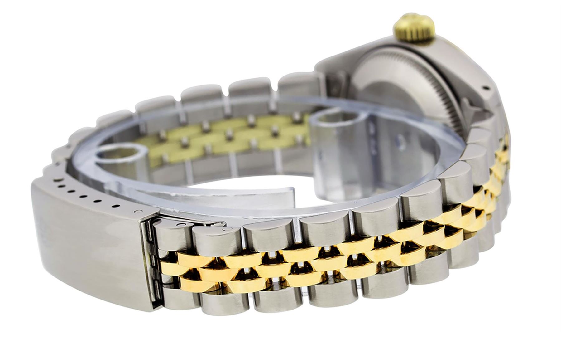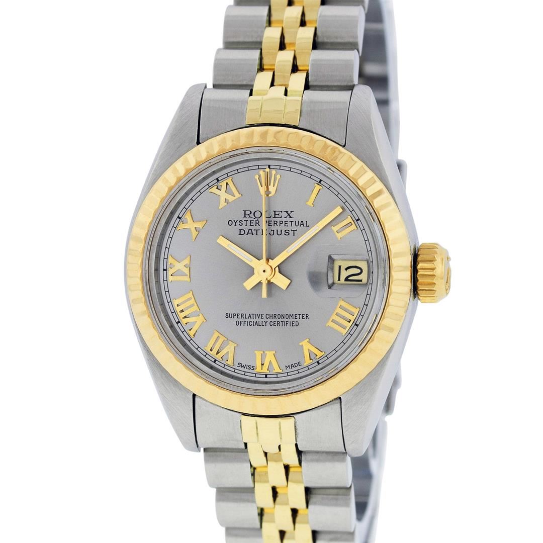 One Ladies Pre Owned Two Tone Rolex Datejust Polished, Serviced & Electronically Tested, Rolex Yellow Gold & Stainless Steel, Rolex Case Size: 26mm, Rolex Yellow Gold Crown, Rolex Bezel: Yellow Gold Fluted Bezel. Custom Crystal: New Acrylic Cyclops Lens. Custom Hands: New Luminescent Hands. Rolex Movement: Automatic Winding Movement. Rolex Dial: Slate Grey Roman Dial. Date Window: 3 O'Clock Position Date Display, Model: Datejust. Condition: G-6 Extra Fine. Rolex Bracelet: Two Tone Yellow Gold & Stainless Steel Jubilee. Bright Polish. 6.0 Inch Length, Adjustable. Standard Clasp, With Rolex Logo. This Watch Has Been Serviced Time Tested And Is In Excellent Condition It Is Free Of All Scratches And Dents.