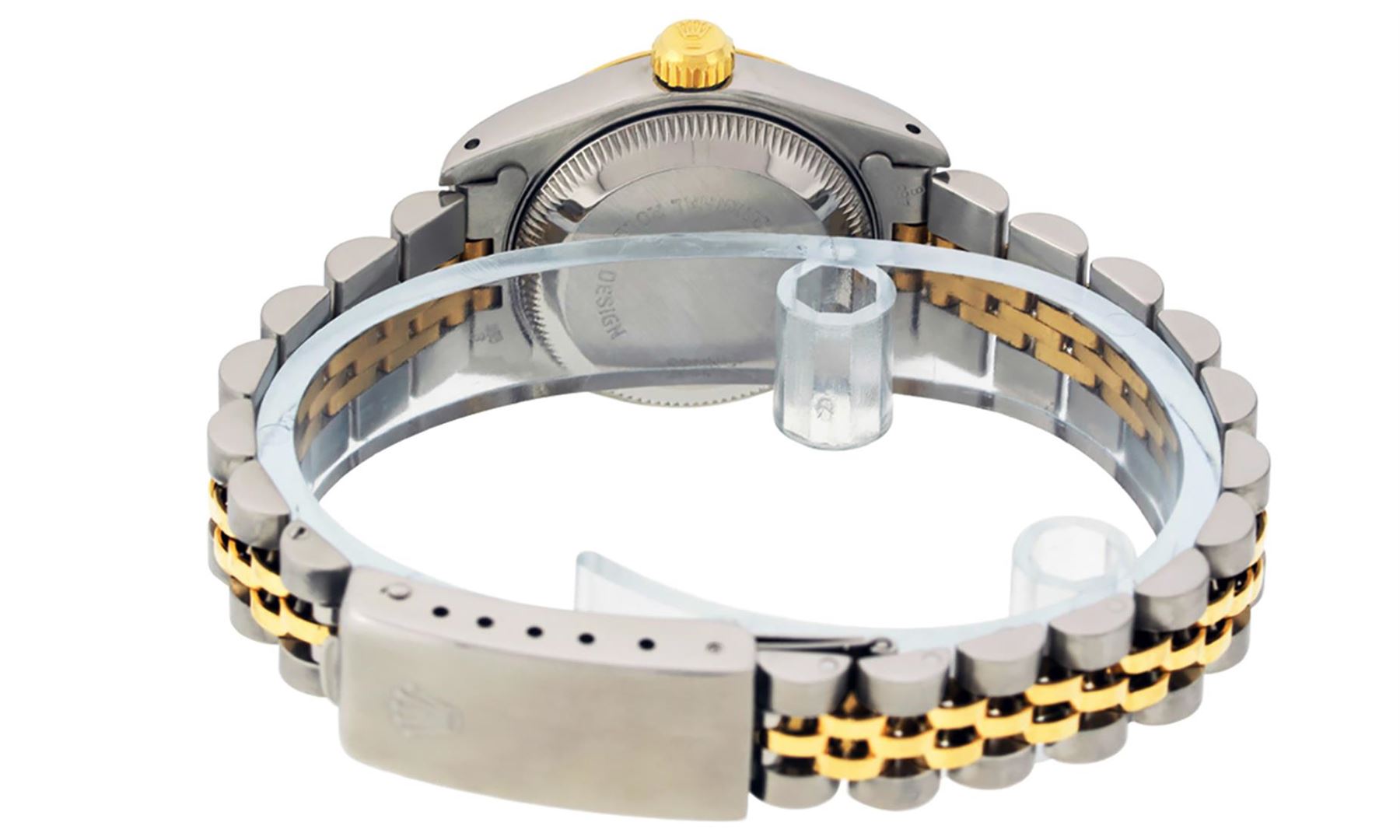 One Ladies Two Tone Rolex Datejust Polished, Serviced & Electronically Tested, Yellow Gold & Stainless Steel Case: 26mm, Yellow Gold Crown, Bezel: Yellow Gold Fluted Bezel. Custom Crystal: Acrylic Cyclops Lens. Custom Hands: New Luminescent Hands. Movement: Automatic Winding Movement. Dial: Champagne Index With Luminescent Dots. Date Window: 3 O'clock Position Date Display, Model: Datejust. Condition: G-6 Extra Fine. Bracelet: Two Tone Yellow Gold & Stainless Steel Jubilee. Bright Polish. 6.0 Inch Length, Adjustable. Standard Clasp, With Rolex Logo. This Watch Has Been Serviced Time Tested And Is In Excellent Condition It Is Free Of All Scratches And Dents.