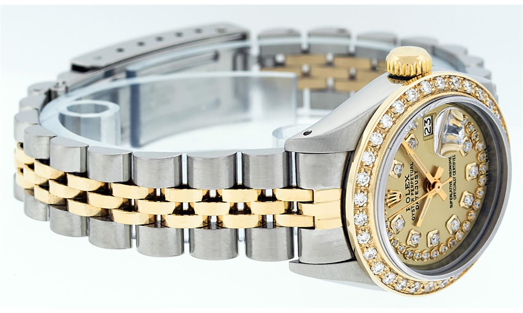 One Ladies Two Tone Rolex Datejust Polished, Serviced & Electronically Tested, Yellow Gold & Stainless Steel Case: 26mm, Yellow Gold Crown, Custom Bezel: New 18K Yellow Gold Beadset Diamond Bezel, Diamond Count: 32 Diamonds Total Weight .70 Carat, Clarity: SI-VS, Color: G to H. Custom Crystal: New Synthetic Sapphire Cyclops Lens. Custom Hands: New Luminescent Hands. Movement: Automatic Winding Movement.. Custom Dial: Champagne String Diamond Dial, Diamond Count: 43 Diamonds, Clarity: SI-VS, Color: G to H. Date Window: 3 O'clock Position Date Display, Model: Datejust. Condition: G-6 Extra Fine. Bracelet: Two Tone Yellow Gold & Stainless Steel Jubilee. Bright Polish. 6.0 Inch Length, Adjustable. Standard Clasp, With Rolex Logo. This Watch Has Been Serviced Time Tested And Is In Excellent Condition It Is Free Of All Scratches And Dents.