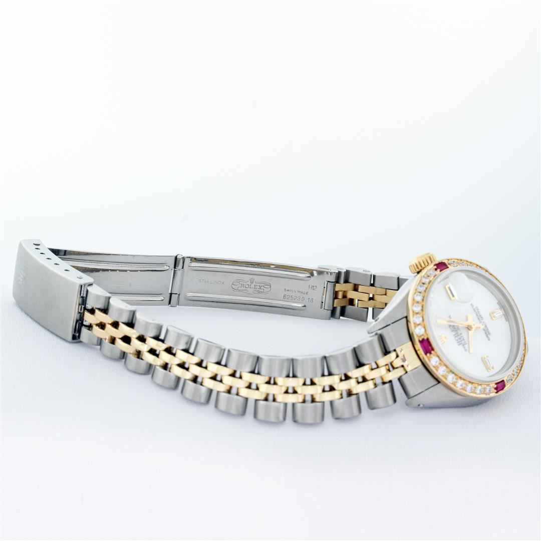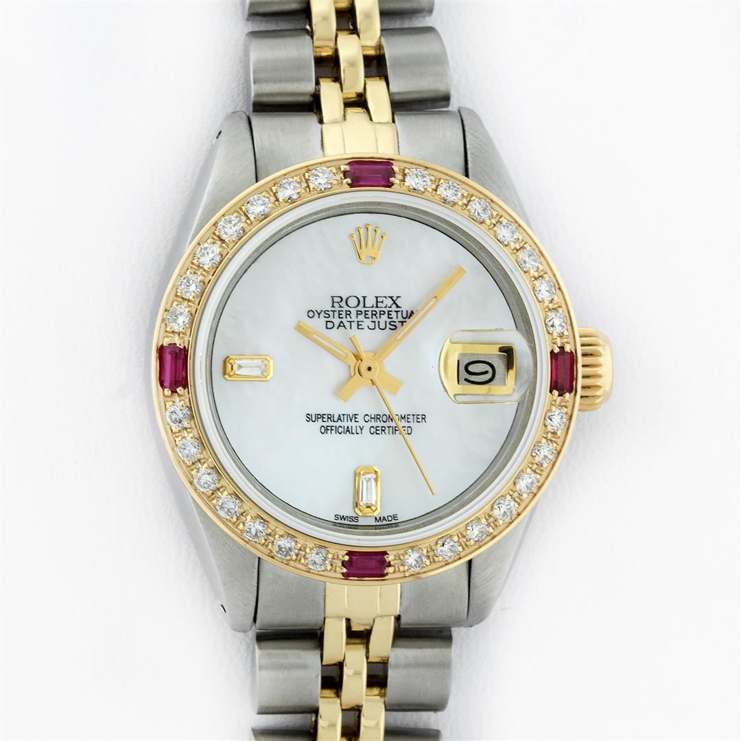One Ladies Two Tone Rolex Datejust Polished, Serviced & Electronically Tested, Yellow Gold & Stainless Steel Case: 26mm, Yellow Gold Crown, Custom Bezel: New 18K Yellow Gold Ruby Beadset Diamond Bezel, Diamond Count: 28 Diamonds + 4 Sapphires In Bezel. Total Weight .70 Carat, Clarity: SI-VS, Color: G to H. Custom Crystal: New Scratch Resistant Synthetic Sapphire Cyclops Lens. Custom Hands: New Luminescent Hands. Movement: Automatic Winding Movement.. Custom Dial: Mother Of Pearl With Baguette Diamonds, Stone Count: 2 Baguettes. Date Window: 3 O'clock Position Date Display, Model: Datejust. Condition: G-6 Extra Fine. Bracelet: Two Tone Yellow Gold & Stainless Steel Jubilee Band. Bright Polish. 6.0 Inch Length, Adjustable. Standard Clasp, With Rolex Logo. This Watch Has Been Serviced Time Tested And Is In Excellent Condition It Is Free Of All Scratches And Dents.