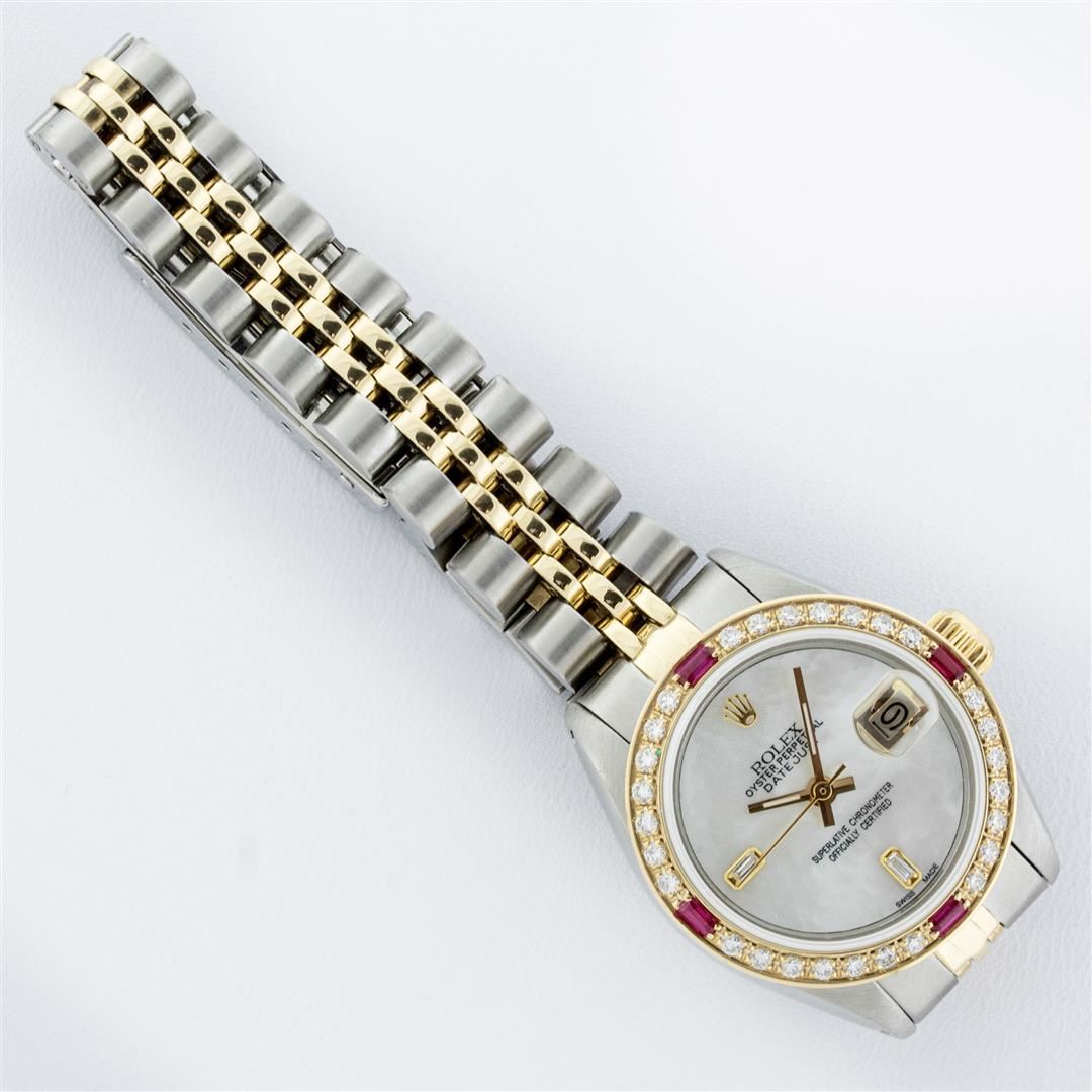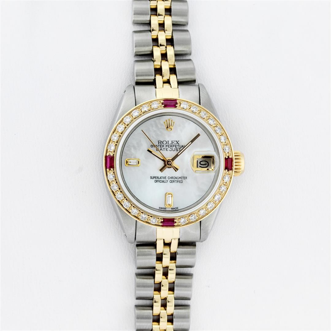One Ladies Two Tone Rolex Datejust Polished, Serviced & Electronically Tested, Yellow Gold & Stainless Steel Case: 26mm, Yellow Gold Crown, Custom Bezel: New 18K Yellow Gold Ruby Beadset Diamond Bezel, Diamond Count: 28 Diamonds + 4 Sapphires In Bezel. Total Weight .70 Carat, Clarity: SI-VS, Color: G to H. Custom Crystal: New Scratch Resistant Synthetic Sapphire Cyclops Lens. Custom Hands: New Luminescent Hands. Movement: Automatic Winding Movement.. Custom Dial: Mother Of Pearl With Baguette Diamonds, Stone Count: 2 Baguettes. Date Window: 3 O'clock Position Date Display, Model: Datejust. Condition: G-6 Extra Fine. Bracelet: Two Tone Yellow Gold & Stainless Steel Jubilee Band. Bright Polish. 6.0 Inch Length, Adjustable. Standard Clasp, With Rolex Logo. This Watch Has Been Serviced Time Tested And Is In Excellent Condition It Is Free Of All Scratches And Dents.