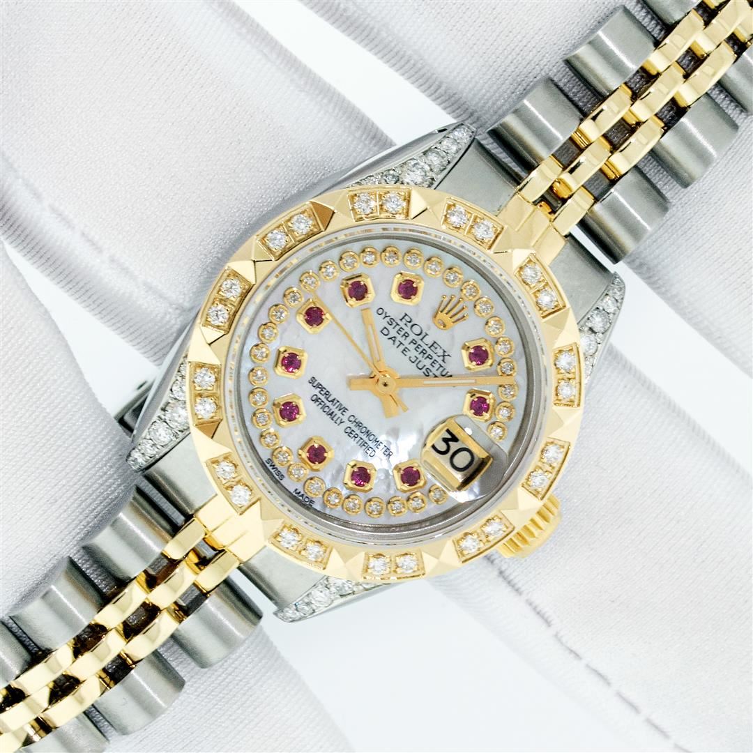 One Ladies Two Tone Rolex Datejust Polished, Serviced & Electronically Tested, Yellow Gold & Stainless Steel Case: 26mm, Yellow Gold Crown, Diamond Lugs: 24 Diamonds On Lugs, Clarity: SI-VS, Color: G to H, Clarity SI-VS. Custom Bezel: New 18K Yellow Gold Pyramid Diamond Bezel, Diamond Count: 24 Diamonds, Total Weight .50 Carat, Clarity: SI-VS, Color: G to H. Custom Crystal: New Synthetic Scratch Resistant Sapphire Cyclops Lens. Custom Hands: New Luminescent Hands. Movement: Automatic Winding Movement. Custom Dial: Mother Of Pearl With Ruby Hour Markers, Stone Count: 10 Rubies + 33 Diamonds In Dial, Clarity: SI-VS, Color: G to H. Date Window: 3 O'clock Position Date Display, Model: Datejust. Condition: G-6 Extra Fine. Bracelet: Two Tone Yellow Gold & Stainless Steel Jubilee. Bright Polish. 6.0 Inch Length, Adjustable. Standard Clasp, With Rolex Logo. This Watch Has Been Serviced Time Tested And Is In Excellent Condition It Is Free Of All Scratches And Dents. This Watch Comes With A Rolex Box.