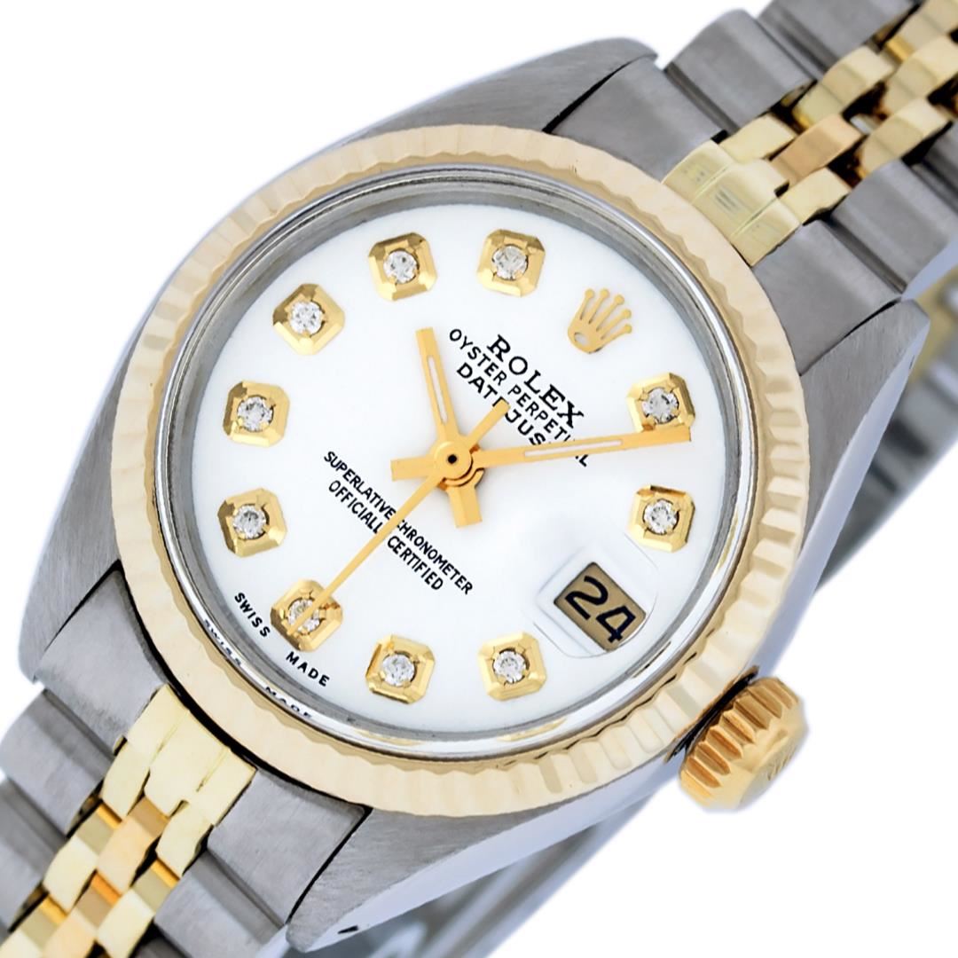 One Ladies Pre Owned Rolex Two Tone 18K Yellow Gold And Stainless Steel Quickset Datejust Polished, Serviced & Electronically Tested, Rolex Yellow Gold And Stainless Steel Case: 26mm, Rolex Yellow Gold Crown, Rolex Bezel: 18K Yellow Gold Fluted Bezel. Custom Crystal: New Sapphire With Magnified Date. Custom Hands: New Luminescent Hands. Rolex Movement: Automatic Winding Movement 2135. Custom Dial: Custom White Dial With Added Diamond Hour Markers, Diamond Count: 10 Diamonds. Date Window: 3 O'Clock Position Date Display, Model: Quickset Datejust. Condition: G-6 Extra Fine. Rolex Bracelet: Two Tone 18K Yellow Gold And Stainless Steel Jubilee Band. Bright Polish. 6.0 Inch Length, Adjustable. Standard Clasp, With Rolex Logo. This Watch Has Been Serviced Time Tested And Is In Excellent Condition It Is Free Of All Scratches And Dents.