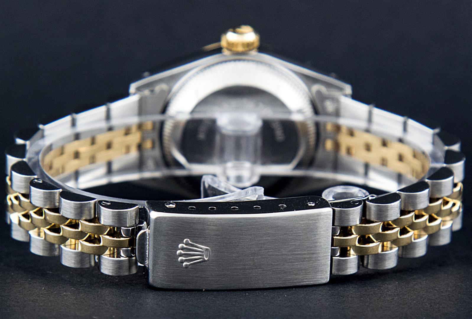 One Ladies Pre Owned Two Tone Rolex Datejust Polished, Serviced & Electronically Tested, Rolex Yellow Gold & Stainless Steel Case: 26mm, Rolex Yellow Gold Crown, Rolex Bezel: Yellow Gold Fluted Bezel. Custom Crystal: New Acrylic Cyclops Lens. Custom Hands: New Luminescent Hands. Rolex Movement: Automatic Winding Movement. Custom Dial: White Index With Dash Track. Date Window: 3 O'Clock Position Date Display, Model: Datejust. Condition: G-6 Extra Fine. Rolex Bracelet: Two Tone Yellow Gold & Stainless Steel Jubilee Band. Bright Polish. 6.0 Inch Length, Adjustable. Standard Clasp, With Rolex Logo. This Watch Has Been Serviced Time Tested And Is In Excellent Condition It Is Free Of All Scratches And Dents.
