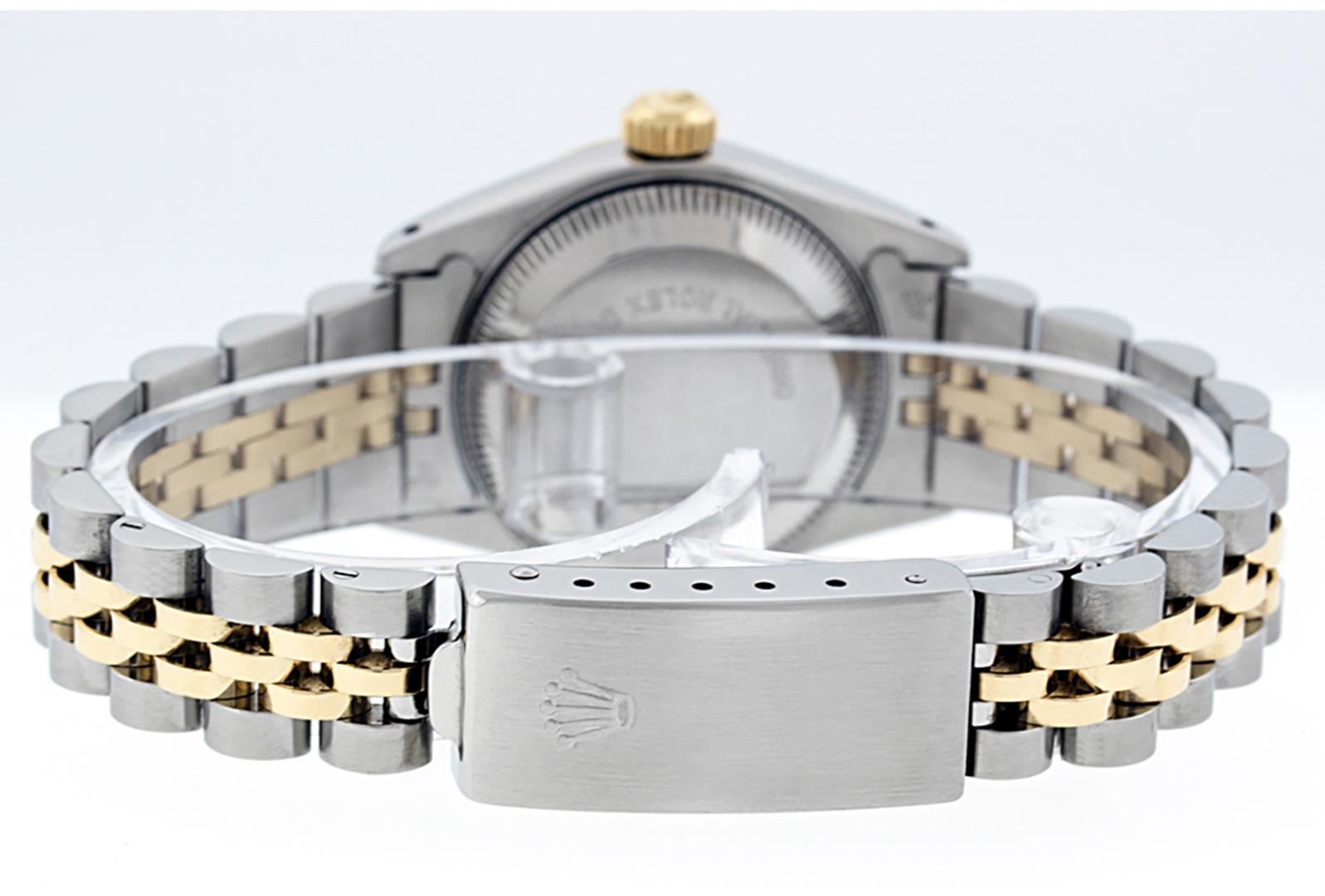One Ladies Pre Owned Two Tone 14K Yellow Gold & Stainless Steel Rolex Polished, Serviced & Electronically Tested, Rolex 14K Yellow Gold & Stainless Steel Case: 26mm, Rolex Yellow Gold Crown, Rolex Bezel: 14K Yellow Gold Fluted Bezel. Custom Crystal: New Plexiglass With Date Window. Custom Hands: New Luminescent Hands. Rolex Movement: Automatic Winding Movement 2030. Custom Dial: Refinish To White Index With Dash Track & Lumi Dots. Date Window: 3 O'Clock Position Date Display, Model: Datejust. Condition: G-6 Extra Fine. Rolex Bracelet: Two Tone 14K Yellow Gold & Stainless Steel Jubilee Band. Bright Polish. 6.0 Inch Length, Adjustable. Standard Clasp, With Rolex Logo. This Watch Has Been Serviced Time Tested And Is In Excellent Condition It Is Free Of All Scratches And Dents.