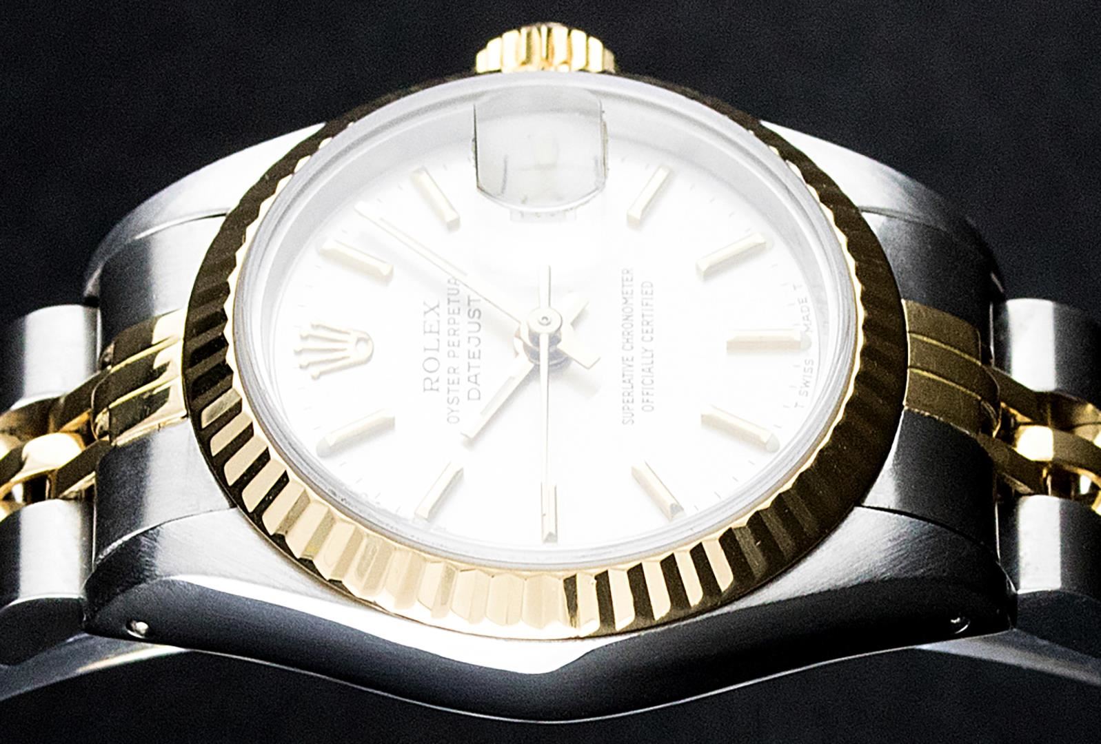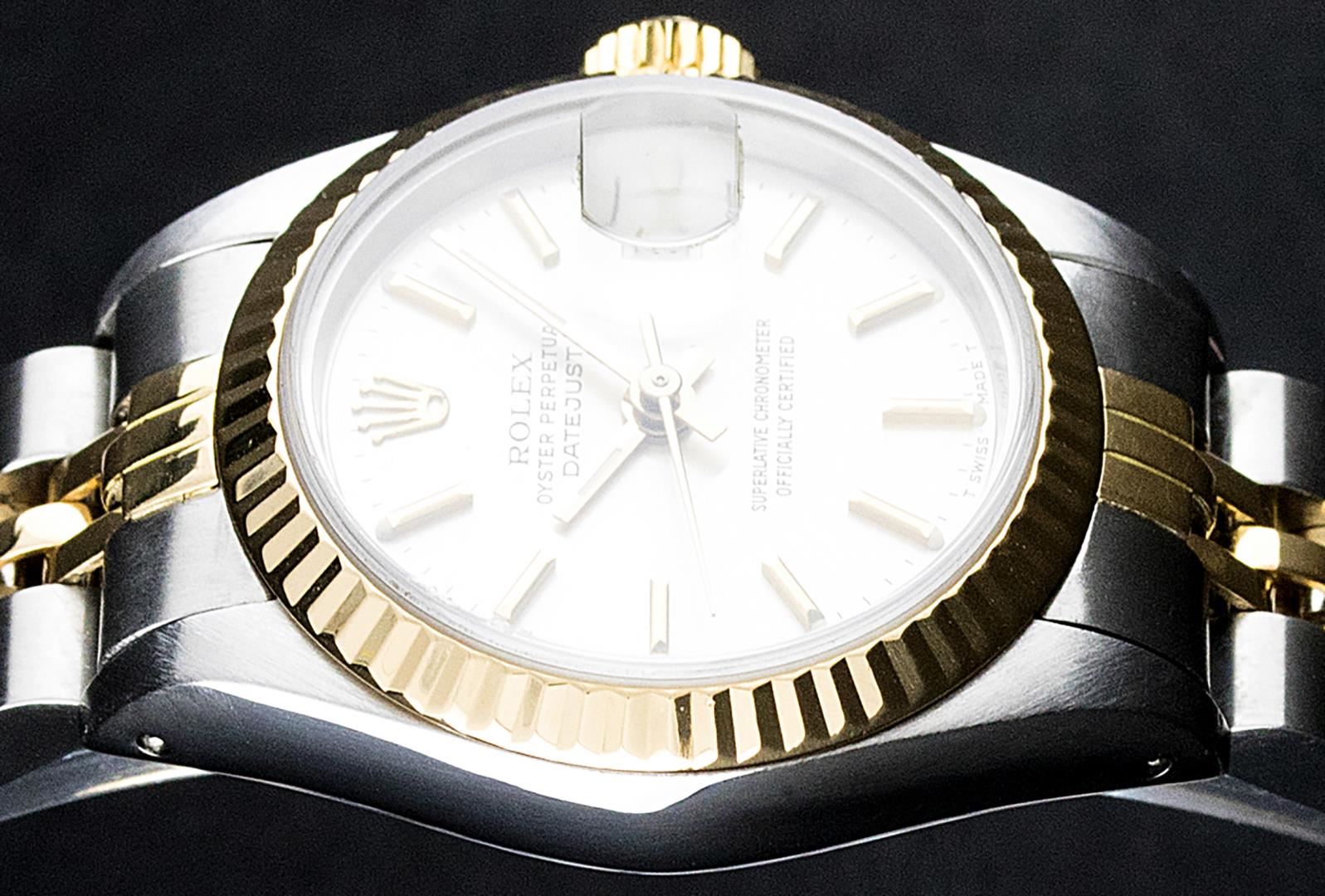 One Ladies Pre Owned Two Tone 14K Yellow Gold And Stainless Steel Rolex Polished, Serviced & Electronically Tested, Rolex Yellow Gold & Stainless Steel Case: 26mm, Rolex Yellow Gold Crown, Rolex Bezel: 14K Yellow Gold Fluted Bezel. Custom Crystal: New Plexiglass With Date Window. Hands: Luminescent Hands. Rolex Movement: Automatic Winding Movement 2030. Custom Dial: White Index With Dash Track. Date Window: 3 O'Clock Position Date Display, Model: Datejust. Condition: G-6 Extra Fine. Rolex Bracelet: Two Tone 14K Yellow Gold & Stainless Steel Jubilee Band. Bright Polish. 6.0 Inch Length, Adjustable. Standard Clasp, With Rolex Logo. This Watch Has Been Serviced Time Tested And Is In Excellent Condition It Is Free Of All Scratches And Dents.