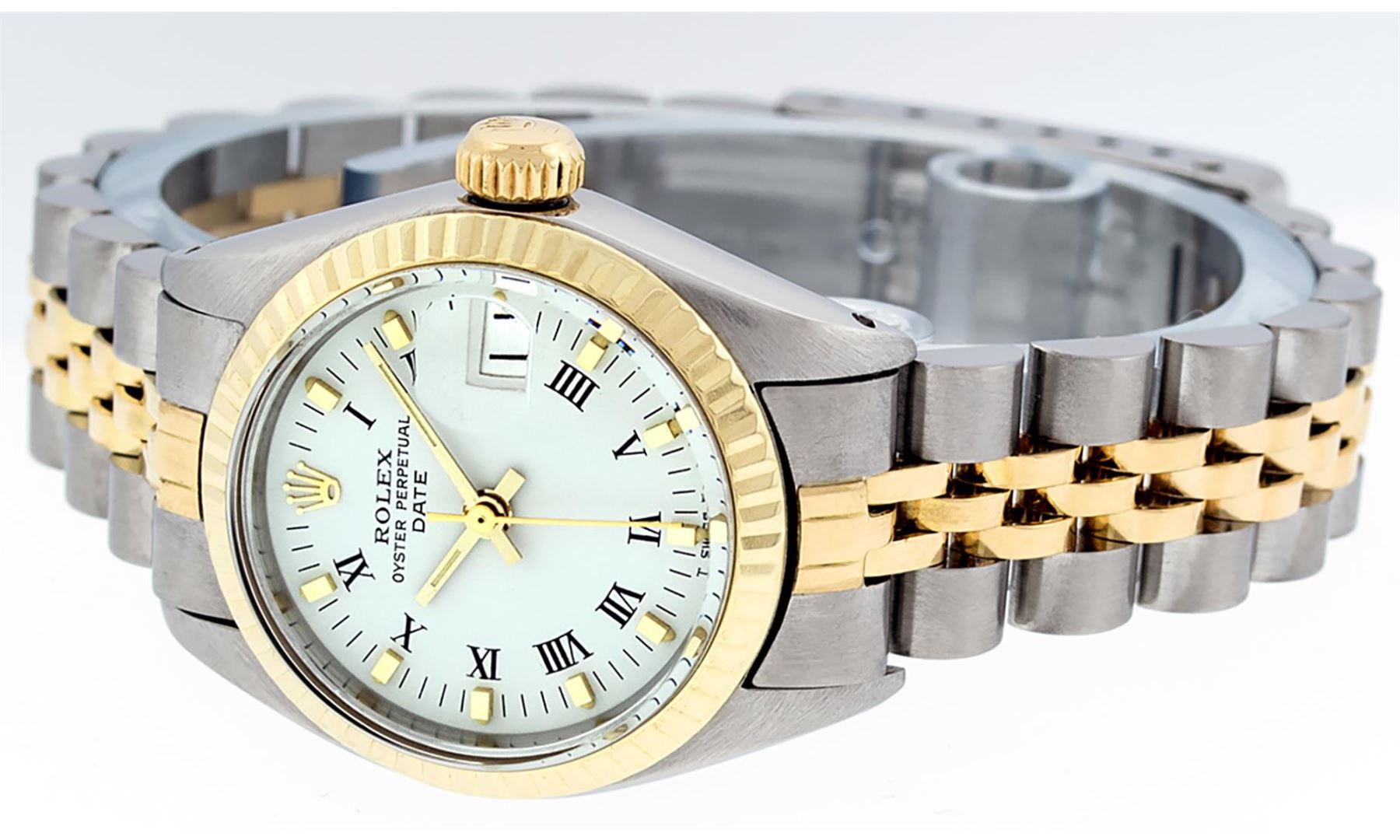 One Ladies Pre Owned Two Tone 14K Yellow Gold And Stainless Steel Rolex Polished, Serviced & Electronically Tested, Rolex 14K Yellow Gold & Stainless Steel Case: 26mm, Rolex Yellow Gold Crown, Rolex Bezel: 14K Yellow Gold Fluted Bezel. Custom Crystal: Plexiglass With Date Window. Hands: Luminescent Hands. Rolex Movement: Automatic Winding Movement 2030. Rolex Dial: White Index With Dash Track & Lumi Dots. Date Window: 3 O'Clock Position Date Display, Model: Datejust. Condition: G-6 Extra Fine. Rolex Bracelet: Two Tone 14K Yellow Gold & Stainless Steel Jubilee Band. Bright Polish. 6.0 Inch Length, Adjustable. Standard Clasp, With Rolex Logo. This Watch Has Been Serviced Time Tested And Is In Excellent Condition It Is Free Of All Scratches And Dents.