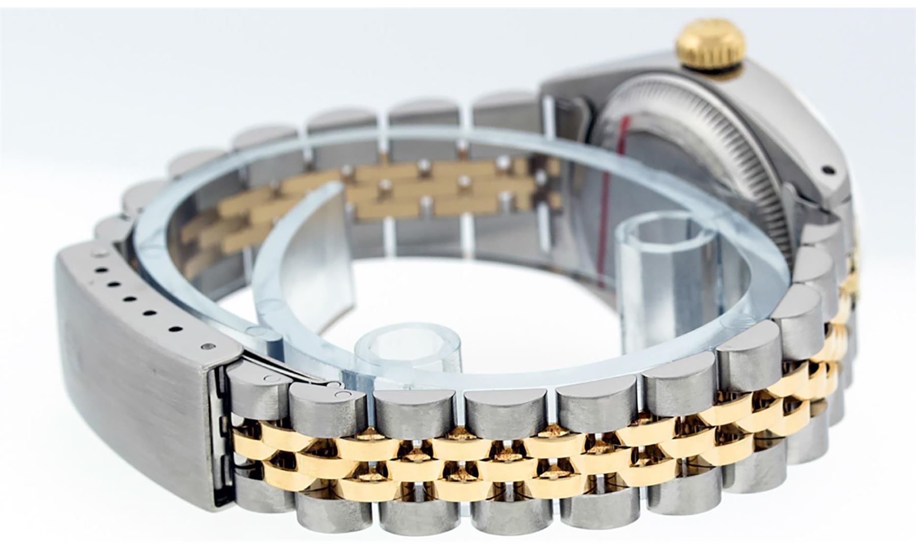One Ladies Pre Owned Two Tone 14K Yellow Gold And Stainless Steel Rolex Polished, Serviced & Electronically Tested, Rolex 14K Yellow Gold & Stainless Steel Case: 26mm, Rolex Yellow Gold Crown, Rolex Bezel: 14K Yellow Gold Fluted Bezel. Custom Crystal: Plexiglass With Date Window. Hands: Luminescent Hands. Rolex Movement: Automatic Winding Movement 2030. Rolex Dial: White Index With Dash Track & Lumi Dots. Date Window: 3 O'Clock Position Date Display, Model: Datejust. Condition: G-6 Extra Fine. Rolex Bracelet: Two Tone 14K Yellow Gold & Stainless Steel Jubilee Band. Bright Polish. 6.0 Inch Length, Adjustable. Standard Clasp, With Rolex Logo. This Watch Has Been Serviced Time Tested And Is In Excellent Condition It Is Free Of All Scratches And Dents.