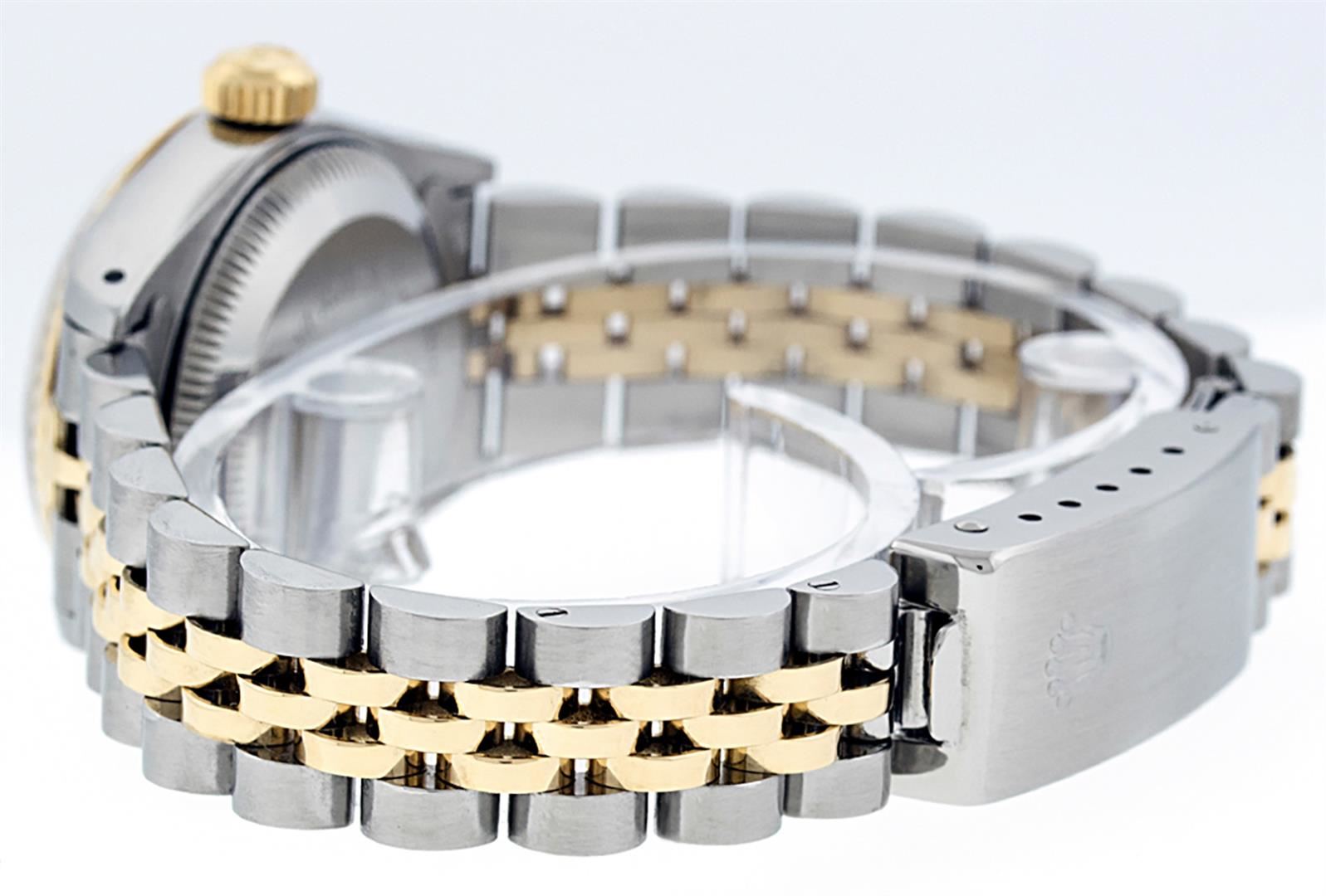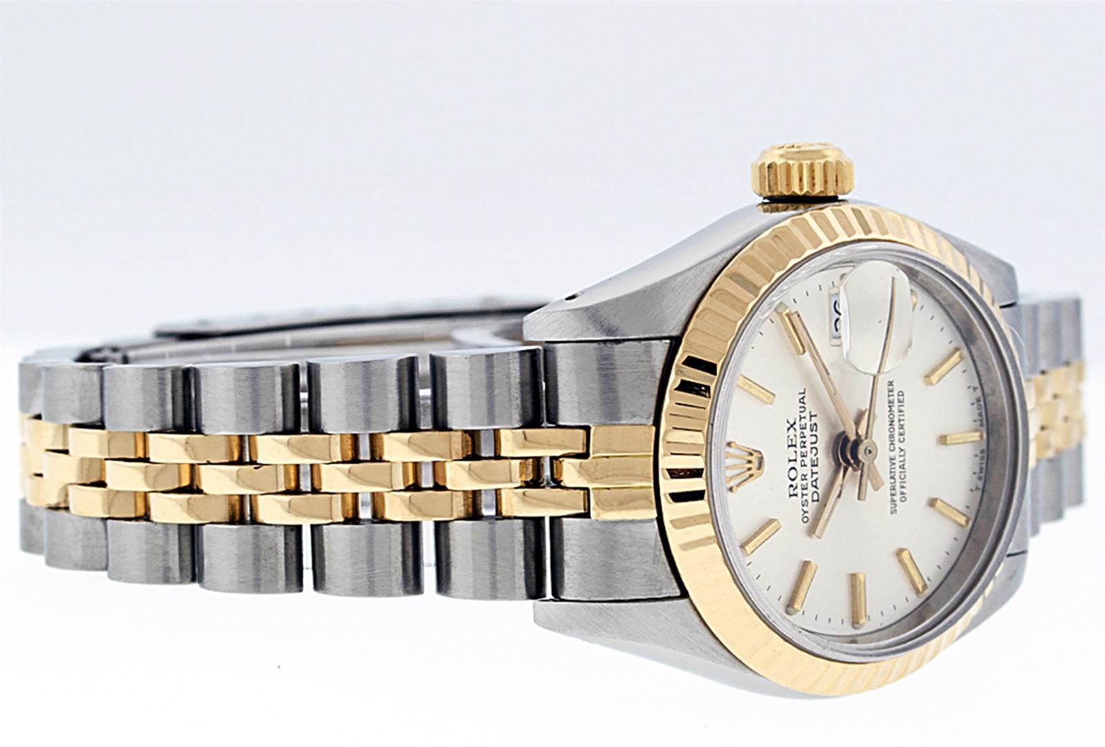 One Ladies Pre Owned Two Tone Rolex Datejust Polished, Serviced & Electronically Tested, Rolex Yellow Gold & Stainless Steel Case: 26mm, Rolex Yellow Gold Crown, Rolex Bezel: Yellow Gold Fluted Bezel. Custom Crystal: New Acrylic Cyclops Lens. Custom Hands: New Luminescent Hands. Rolex Movement: Automatic Winding Movement. Custom Dial: Refinish To White Index With Dash Track & Lumi Dots. Date Window: 3 O'Clock Position Date Display, Model: Datejust. Condition: G-6 Extra Fine. Rolex Bracelet: Two Tone Yellow Gold & Stainless Steel Jubilee Band. Bright Polish. 6.0 Inch Length, Adjustable. Standard Clasp, With Rolex Logo. This Watch Has Been Serviced Time Tested And Is In Excellent Condition It Is Free Of All Scratches And Dents.