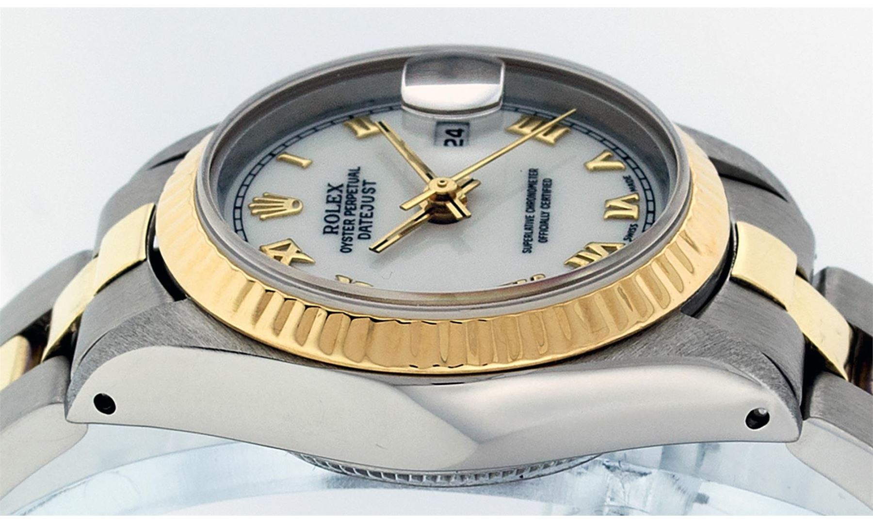 One Ladies Pre Owned 14K Yellow Gold & Stainless Steel Two Tone Rolex Polished, Serviced & Electronically Tested, Rolex Yellow Gold & Stainless Steel Case: 26mm, Rolex Yellow Gold Crown, Rolex Bezel: 14K Yellow Gold Fluted Bezel. Custom Crystal: New Plexiglass With Magnified Date Window. Custom Hands: New Luminescent Hands. Rolex Movement: Automatic Winding Movement 2030. Rolex Dial: White Roman With Square Track. Date Window: 3 O'Clock Position Date Display, Model: Datejust. Condition: G-6 Extra Fine. Rolex Bracelet: Two Tone 14K Yellow Gold & Stainless Steel Oyster Band. Bright Polish. 6.0 Inch Length, Adjustable. Standard Clasp, With Rolex Logo. This Watch Has Been Serviced Time Tested And Is In Excellent Condition It Is Free Of All Scratches And Dents.