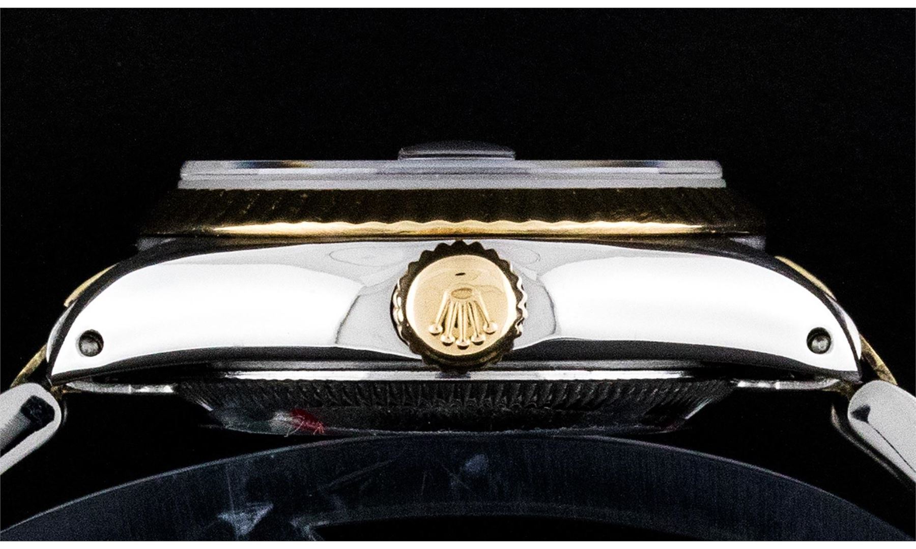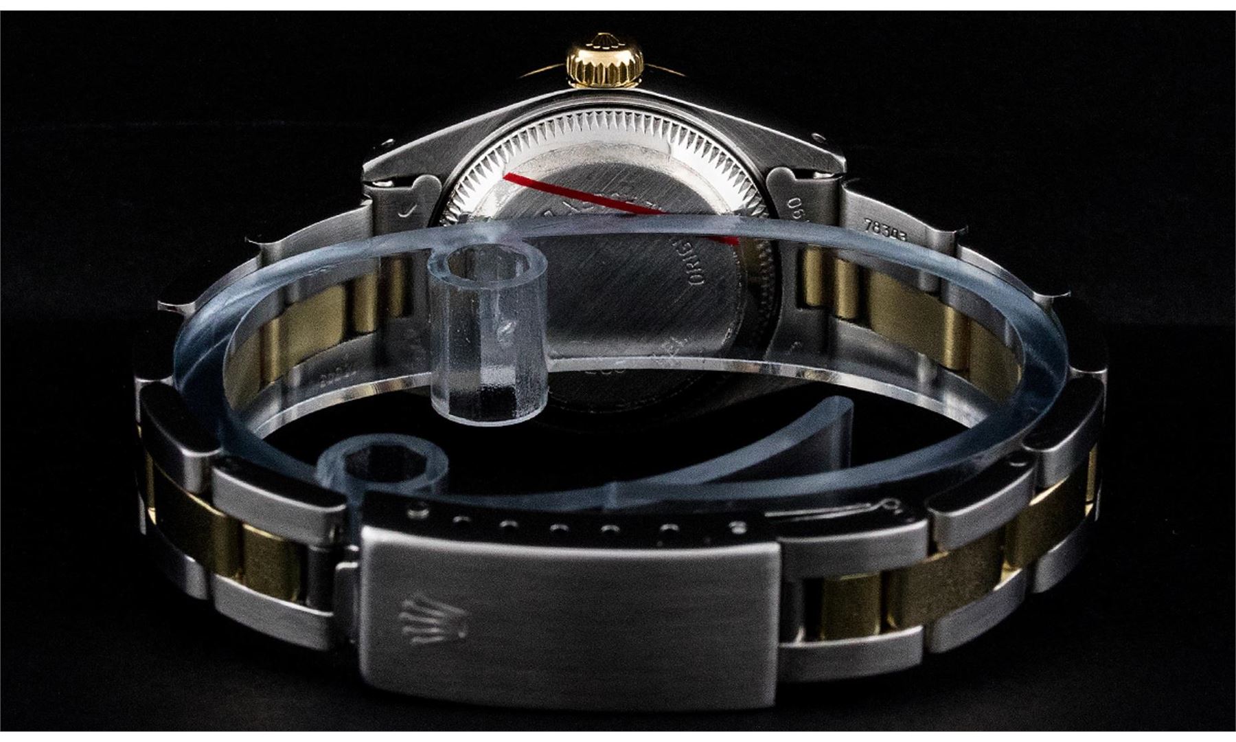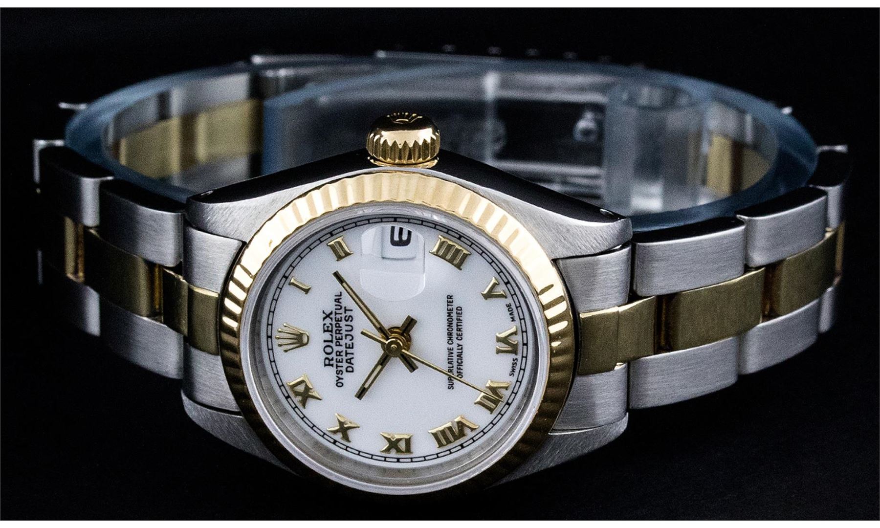One Ladies Pre Owned 14K Yellow Gold & Stainless Steel Two Tone Rolex Polished, Serviced & Electronically Tested, Rolex Yellow Gold & Stainless Steel Case: 26mm, Rolex Yellow Gold Crown, Rolex Bezel: 14K Yellow Gold Fluted Bezel. Custom Crystal: New Plexiglass With Magnified Date Window. Custom Hands: New Luminescent Hands. Rolex Movement: Automatic Winding Movement 2030. Rolex Dial: White Roman With Square Track. Date Window: 3 O'Clock Position Date Display, Model: Datejust. Condition: G-6 Extra Fine. Rolex Bracelet: Two Tone 14K Yellow Gold & Stainless Steel Oyster Band. Bright Polish. 6.0 Inch Length, Adjustable. Standard Clasp, With Rolex Logo. This Watch Has Been Serviced Time Tested And Is In Excellent Condition It Is Free Of All Scratches And Dents.