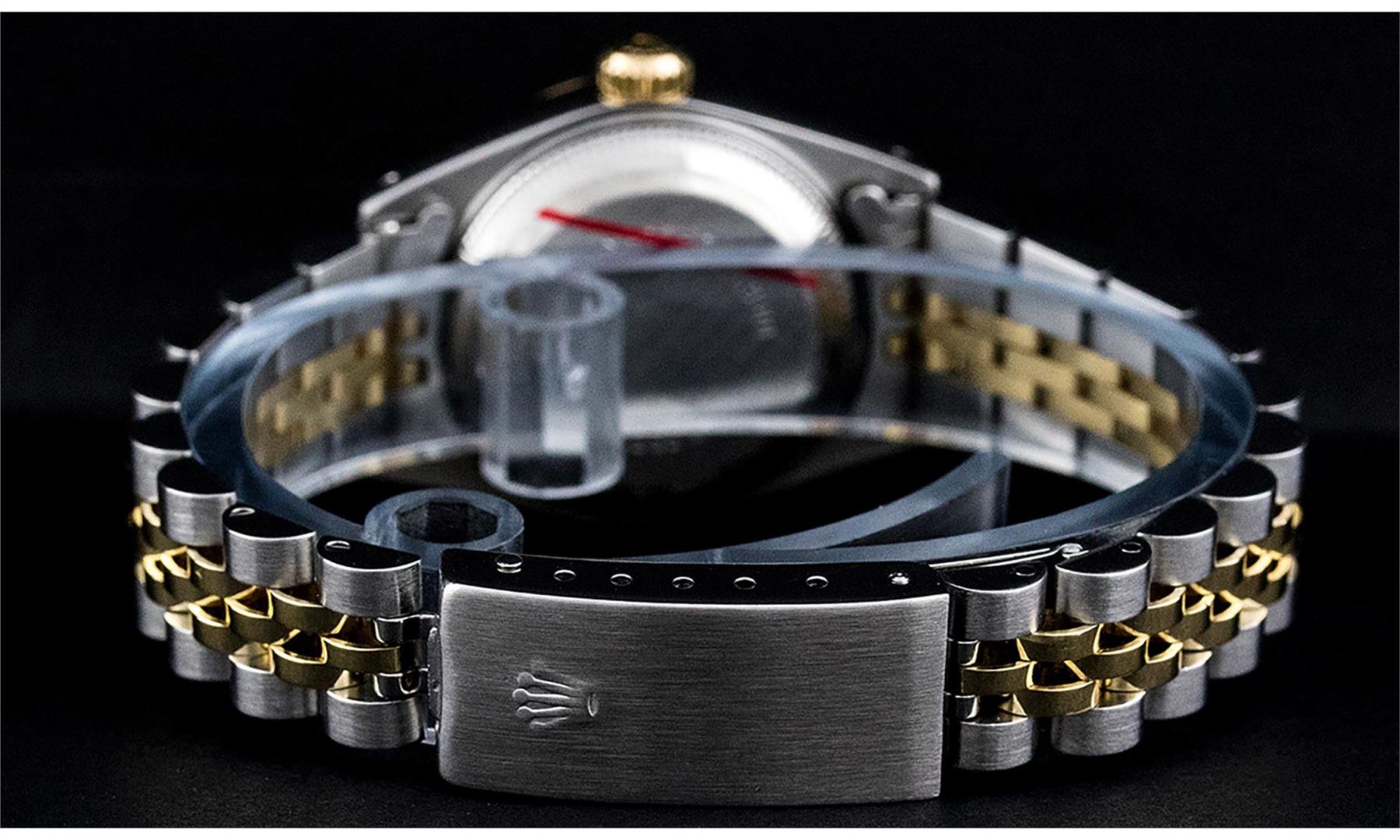 One Ladies Pre Owned Two Tone 14K Yellow Gold & Stainless Steel Rolex Datejust Polished, Serviced & Electronically Tested, Yellow Gold & Stainless Steel Case: 26mm, Yellow Gold Crown, Bezel: 14K Yellow Gold Fluted Bezel. Custom Crystal: New Plexiglass With Date Window. Hands: Luminescent Hands. Rolex Movement: Automatic Winding Movement 2030. Rolex Dial: White Roman With Square Track. Date Window: 3 O'Clock Position Date Display, Model: Datejust. Condition: G-6 Extra Fine. Bracelet: Two Tone 14K Yellow Gold & Stainless Steel Jubilee Band. Bright Polish. 6.0 Inch Length, Adjustable. Standard Clasp, With Rolex Logo. This Watch Has Been Serviced Time Tested And Is In Excellent Condition It Is Free Of All Scratches And Dents.
