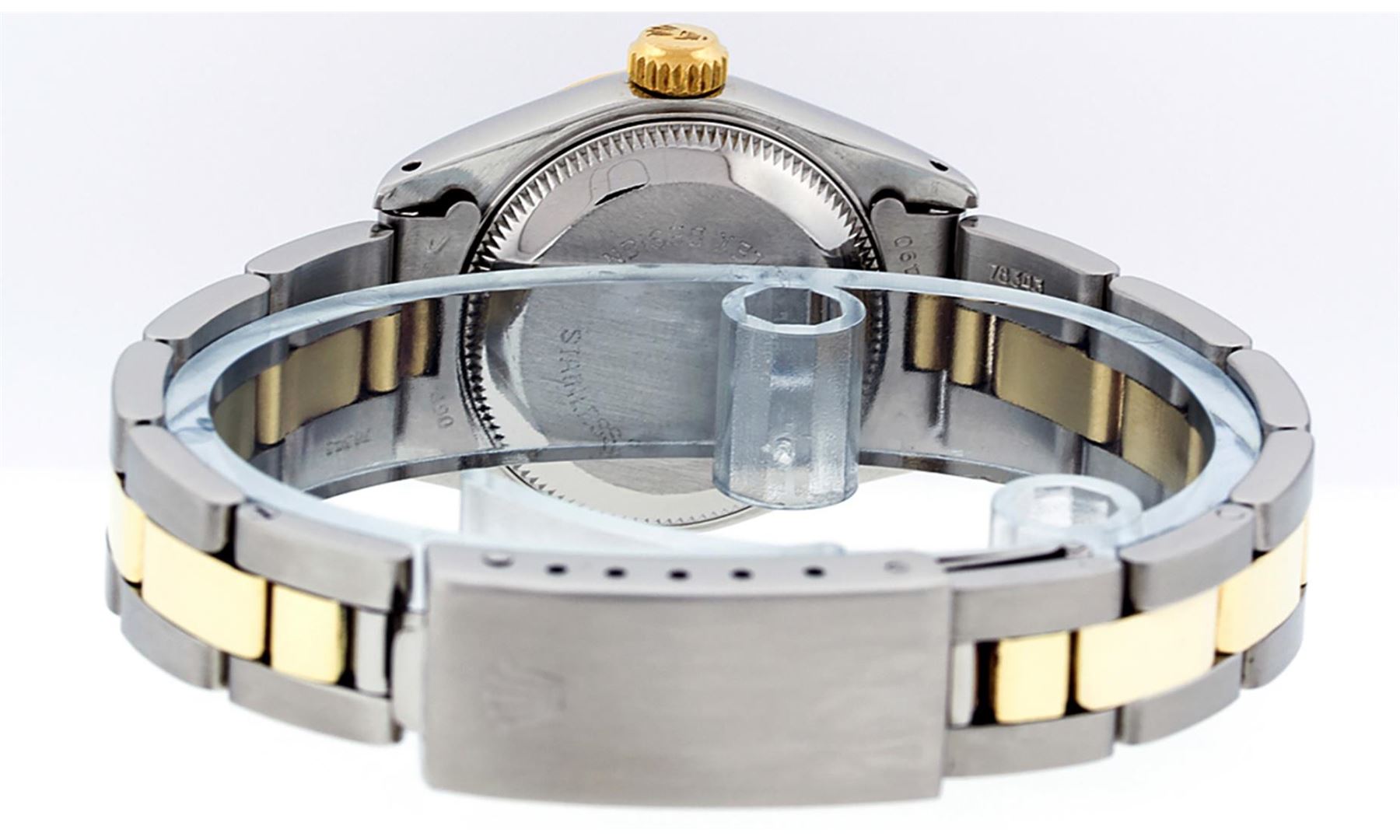 One Ladies Pre Owned 14K Yellow Gold & Stainless Steel Two Tone Rolex Polished, Serviced & Electronically Tested, Rolex Yellow Gold & Stainless Steel Case: 26mm, Rolex Yellow Gold Crown, Rolex Bezel: 14K Yellow Gold Fluted Bezel. Custom Crystal: New Plexiglass With Magnified Date Window. Custom Hands: New Luminescent Hands. Rolex Movement: Automatic Winding Movement 2030. Rolex Dial: White Roman With Square Track. Date Window: 3 O'Clock Position Date Display, Model: Datejust. Condition: G-6 Extra Fine. Rolex Bracelet: Two Tone 14K Yellow Gold & Stainless Steel Oyster Band. Bright Polish. 6.0 Inch Length, Adjustable. Standard Clasp, With Rolex Logo. This Watch Has Been Serviced Time Tested And Is In Excellent Condition It Is Free Of All Scratches And Dents.