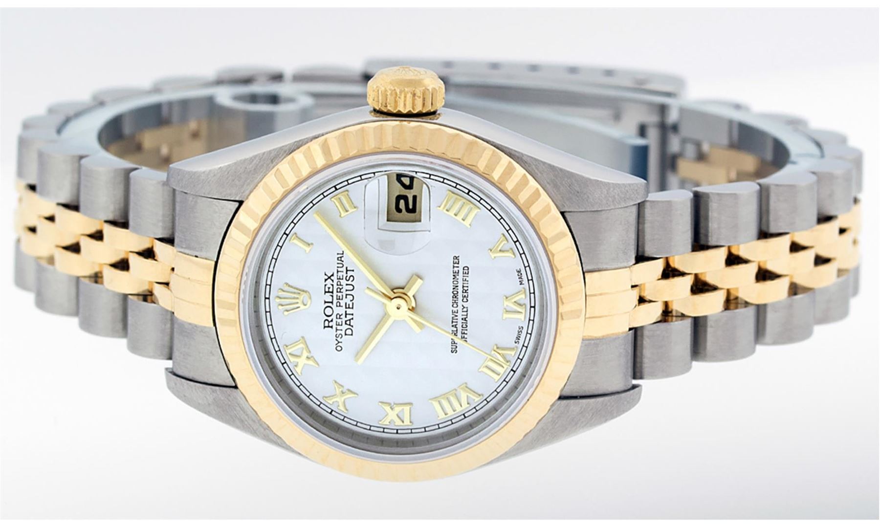 One Ladies Quickset Pre Owned 18K Two Tone Rolex Datejust Polished, Serviced & Electronically Tested, Rolex 18K Yellow Gold & Stainless Steel, Rolex Case: 26mm, Rolex 18K Yellow Gold Crown, Rolex Bezel: 18K Yellow Gold Fluted Bezel. Crystal: Sapphire With Magnified Date Window. Hands: Luminescent Hands. Rolex Movement: Automatic Winding Movement 2235. Rolex Dial: White Roman Dial With Square Track. Date Window: 3 O'Clock Position Date Display, Model: Quickset Datejust. Condition: G-6 Extra Fine. Rolex Bracelet: Two Tone 18K Yellow Gold & Stainless Steel Jubilee Band. Bright Polish. 6.0 Inch Length, Adjustable. Standard Clasp, With Rolex Logo. This Watch Has Been Serviced Time Tested And Is In Excellent Condition It Is Free Of All Scratches And Dents.
